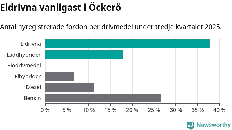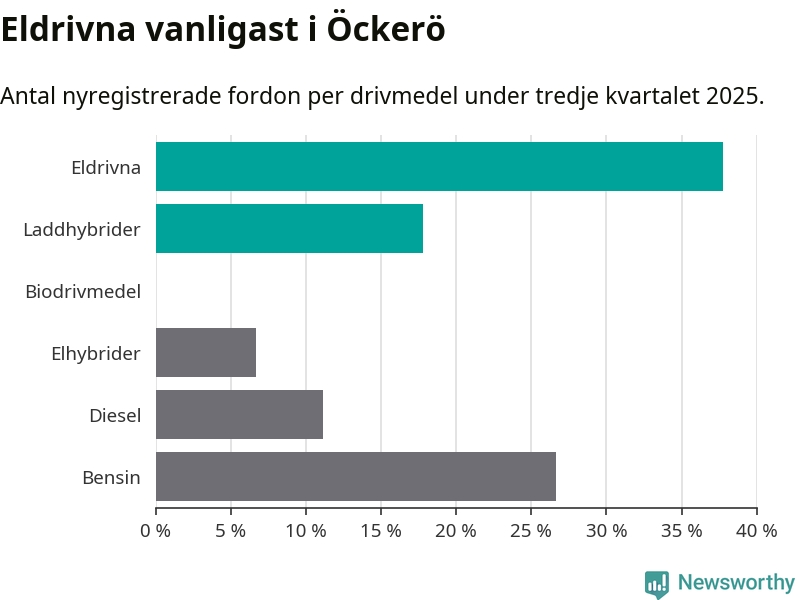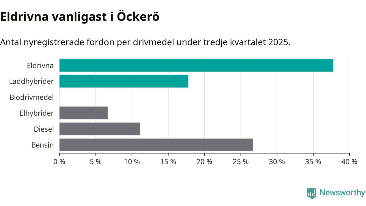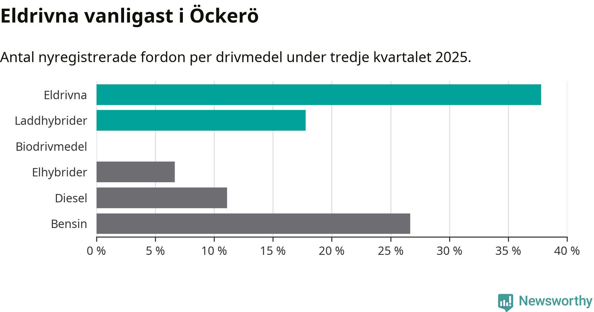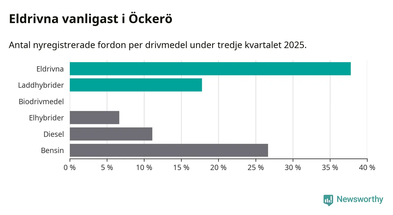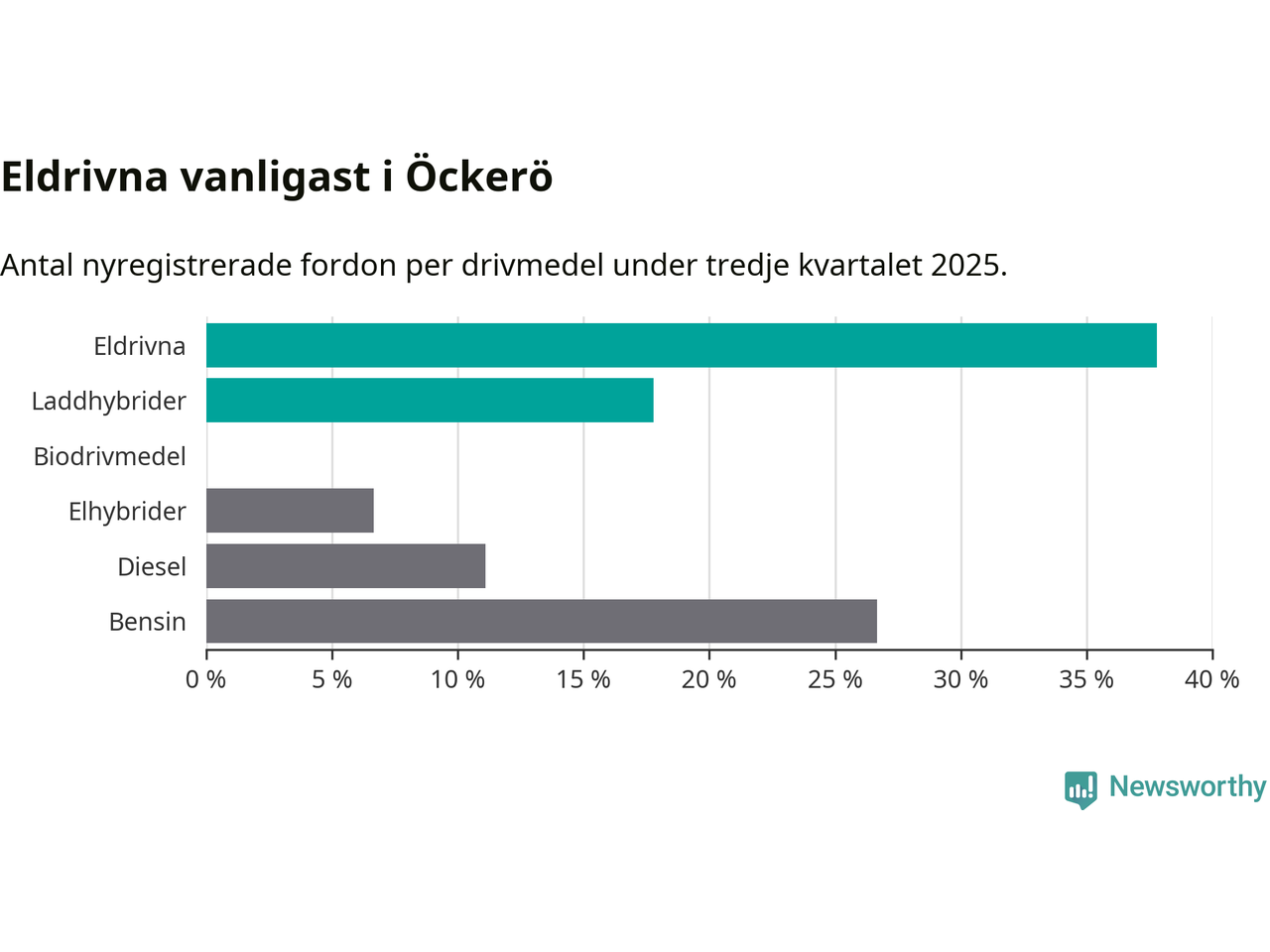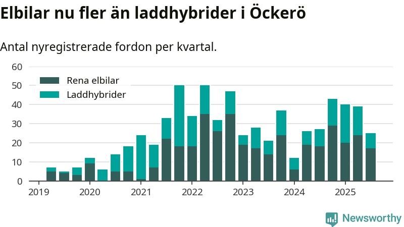 Under tredje kvartalet 2025 var 56 procent av alla nyregistrerade personbilar på Öckerö laddbara (sammanlagt registrerades 45 nya bilar). Merparten av de laddbara bilarna var rena elbilar (38 procent av alla).