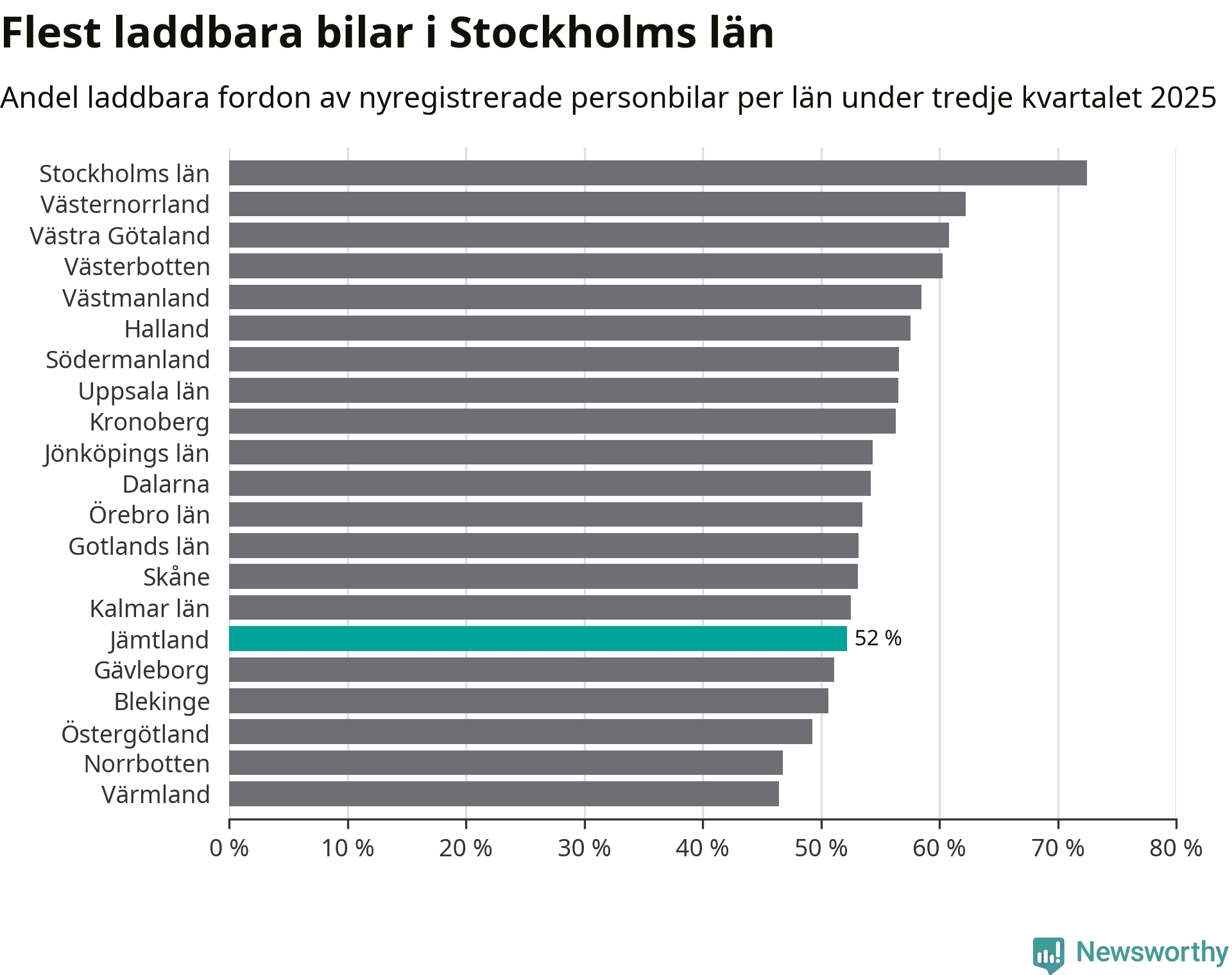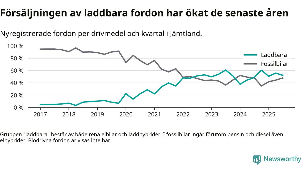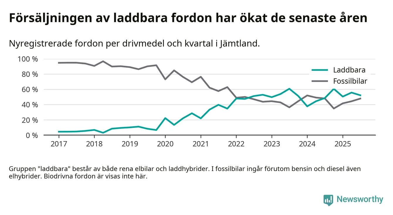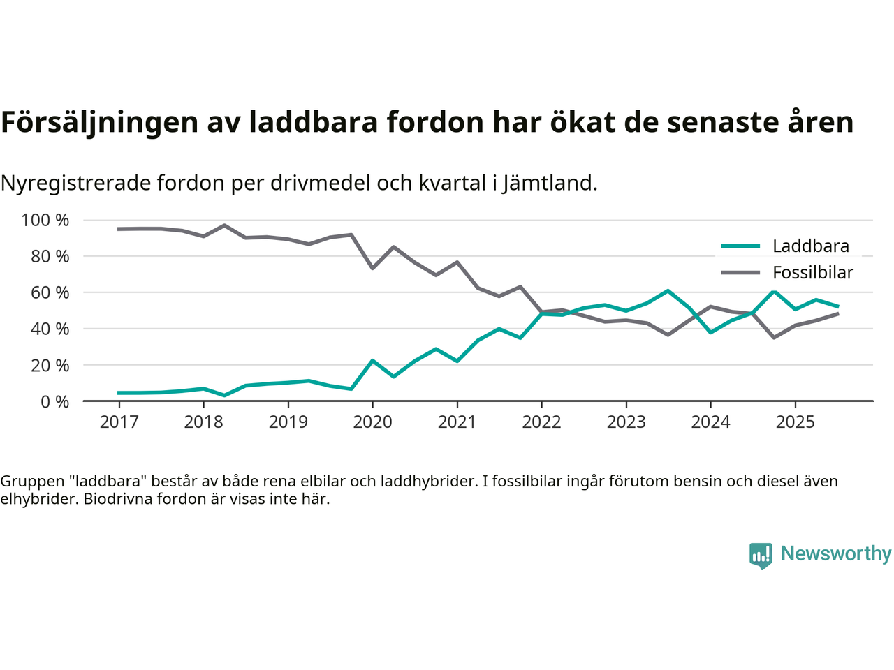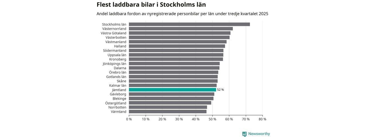 Under tredje kvartalet 2025 var 52 procent av alla nyregistrerade personbilar i Jämtland laddbara (sammanlagt registrerades 347 nya bilar). Merparten av de laddbara bilarna var rena elbilar (29 procent av alla).