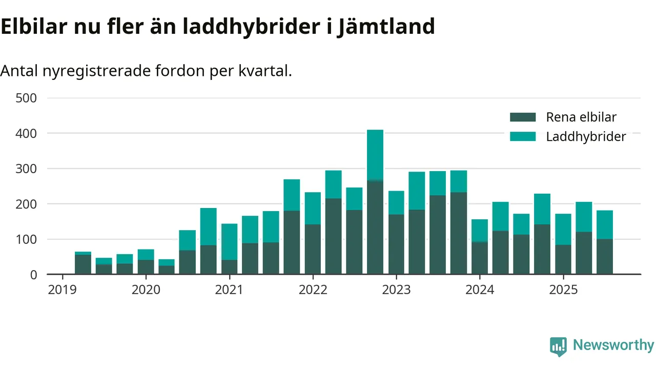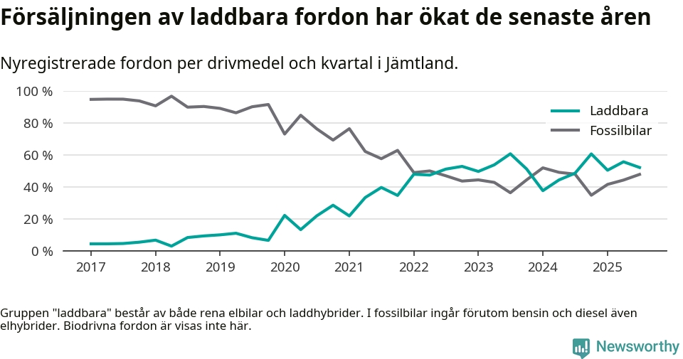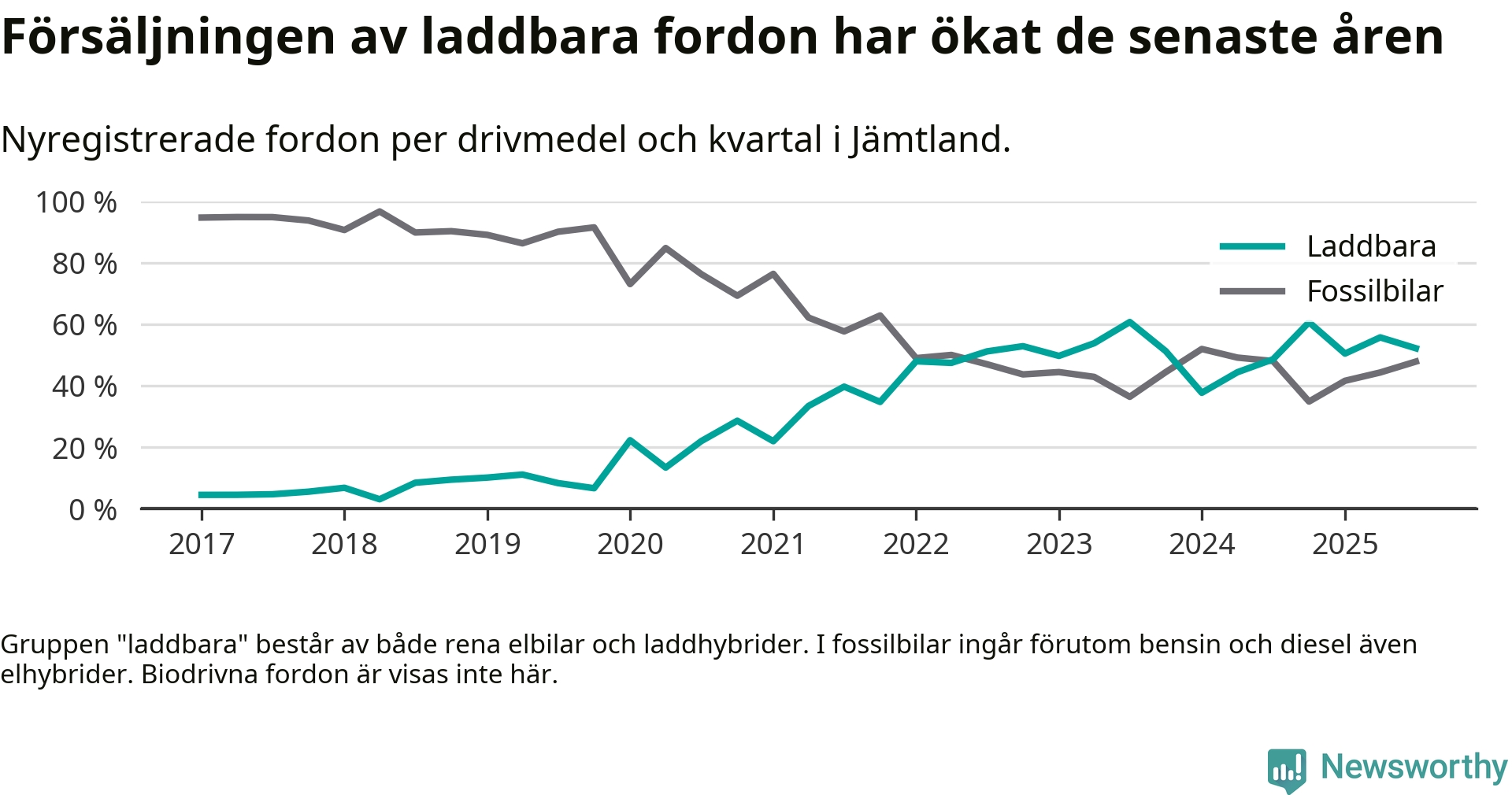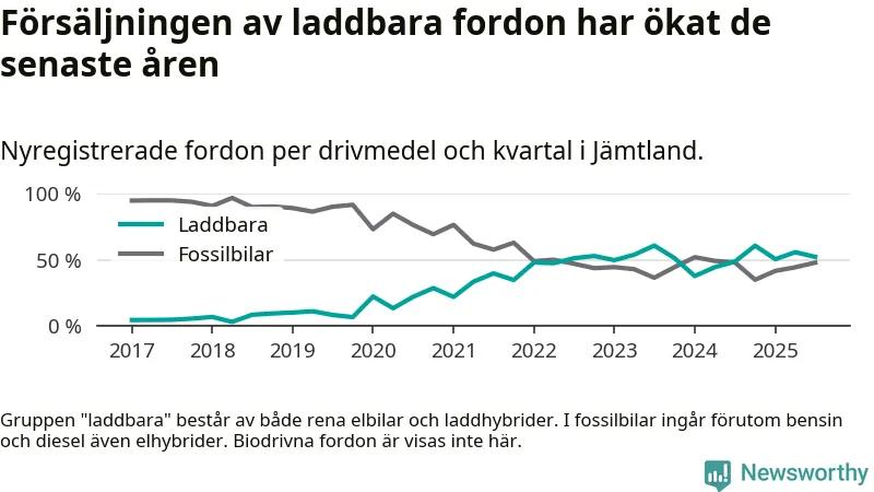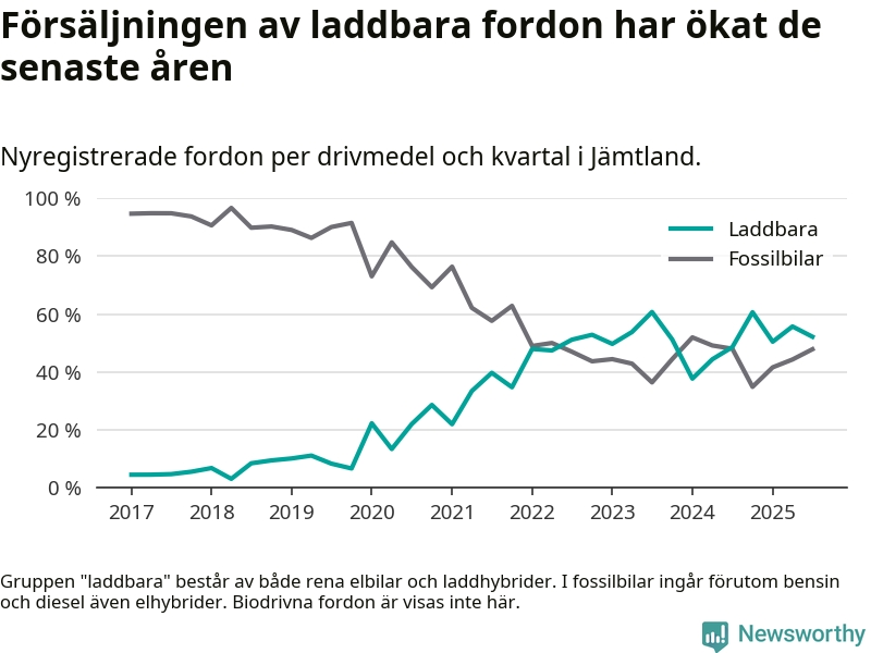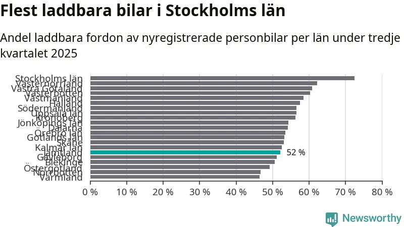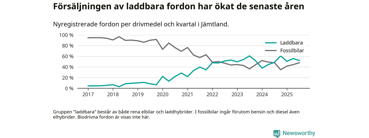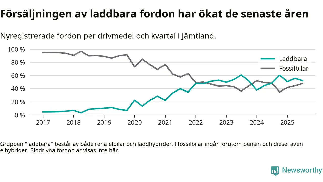 Under tredje kvartalet 2025 var 52 procent av alla nyregistrerade personbilar i Jämtland laddbara (sammanlagt registrerades 347 nya bilar). Merparten av de laddbara bilarna var rena elbilar (29 procent av alla).