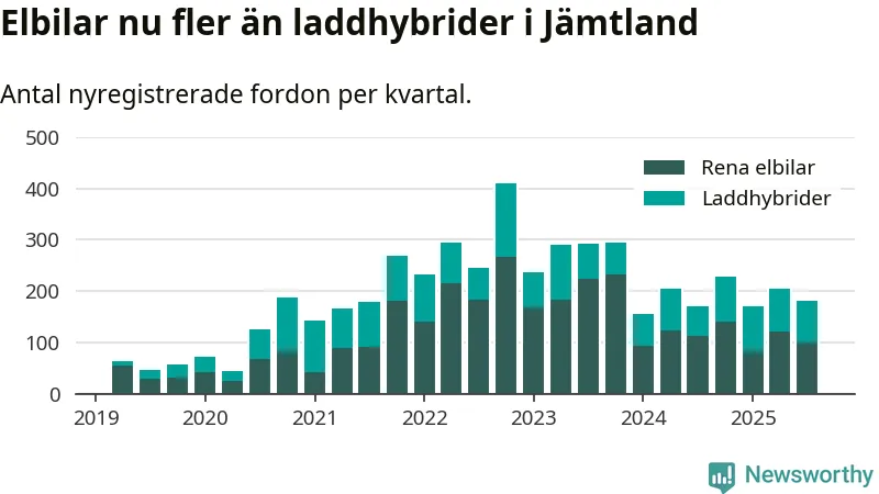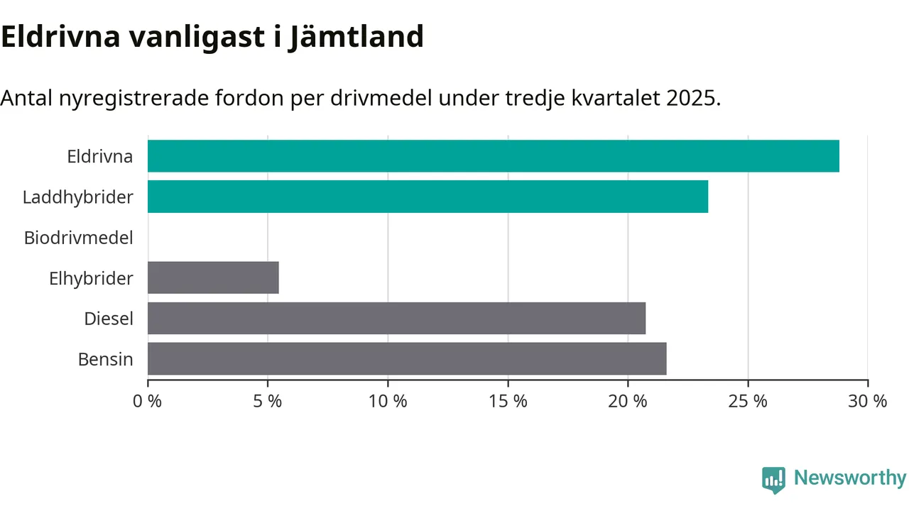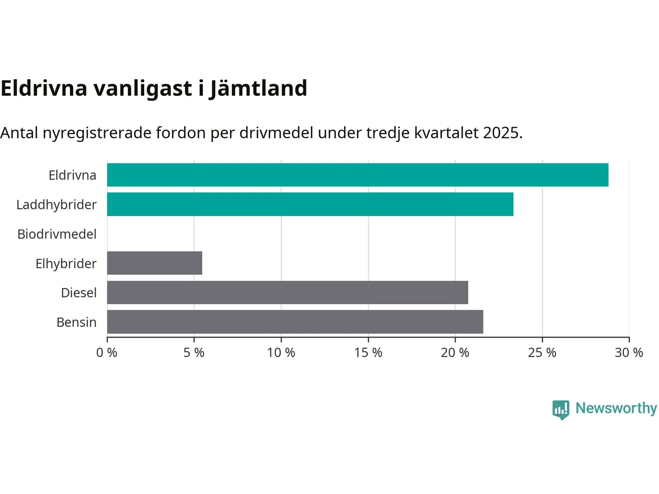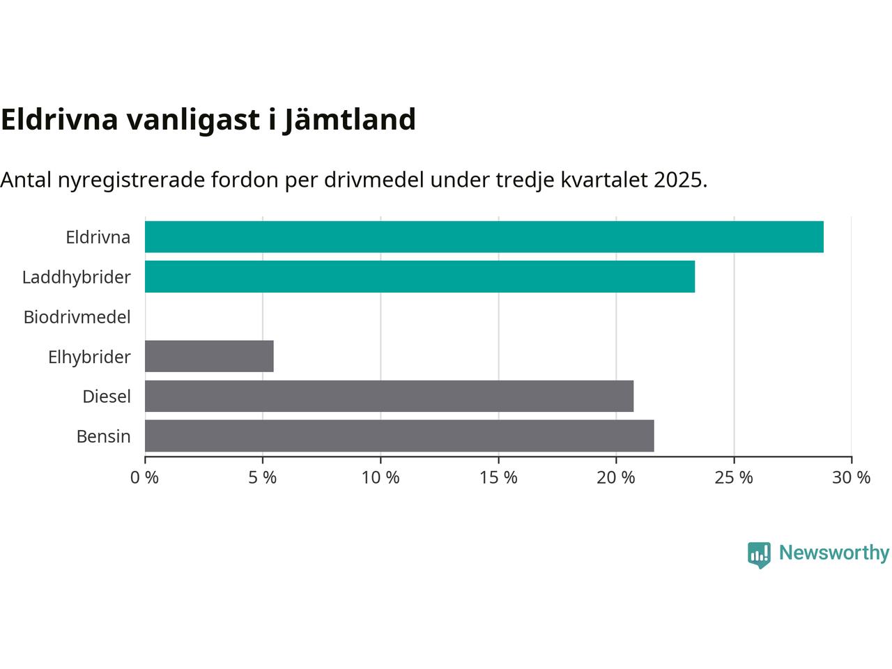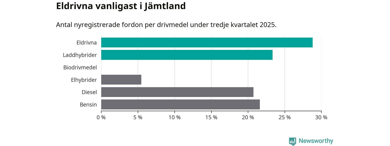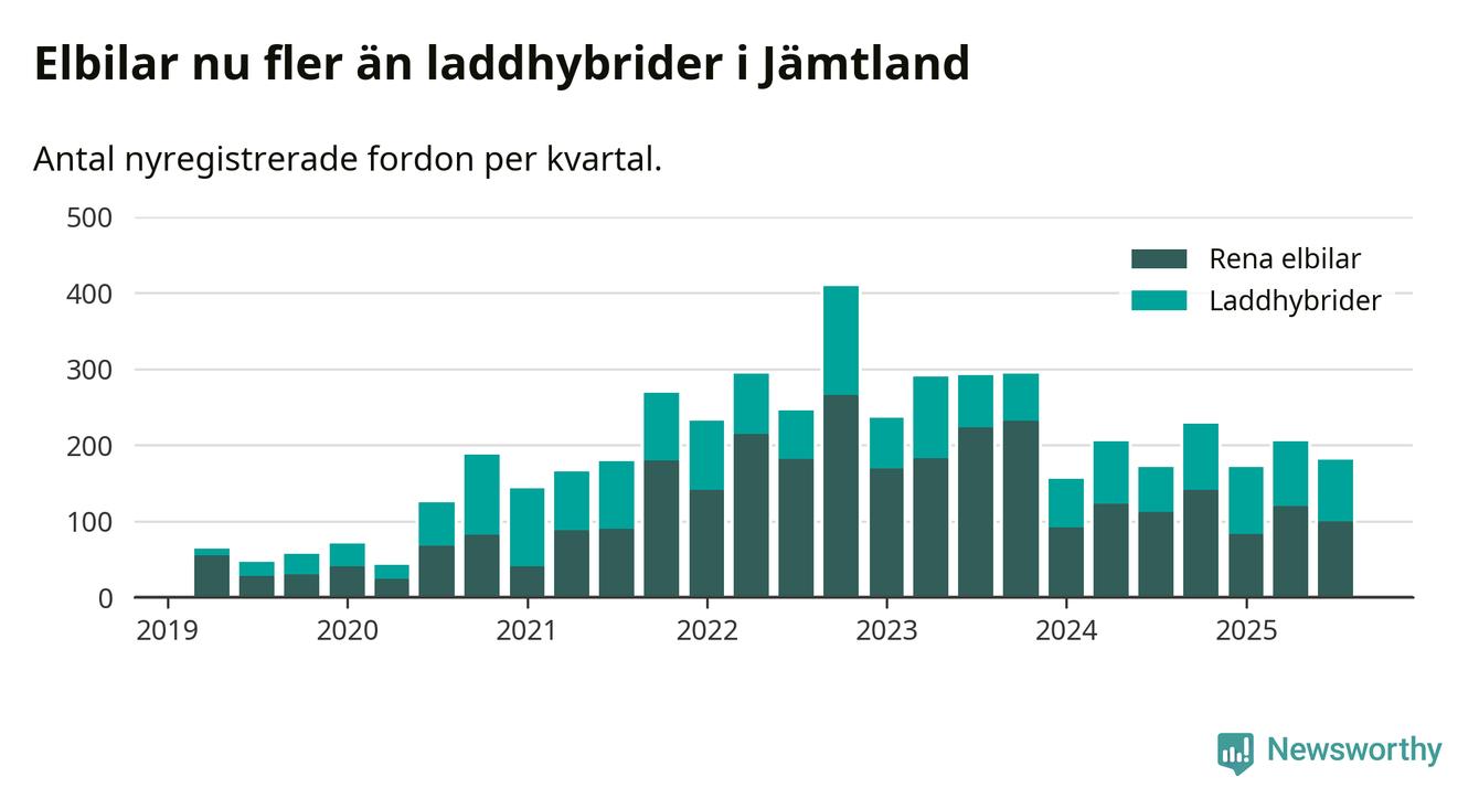 Under tredje kvartalet 2025 var 52 procent av alla nyregistrerade personbilar i Jämtland laddbara (sammanlagt registrerades 347 nya bilar). Merparten av de laddbara bilarna var rena elbilar (29 procent av alla).
