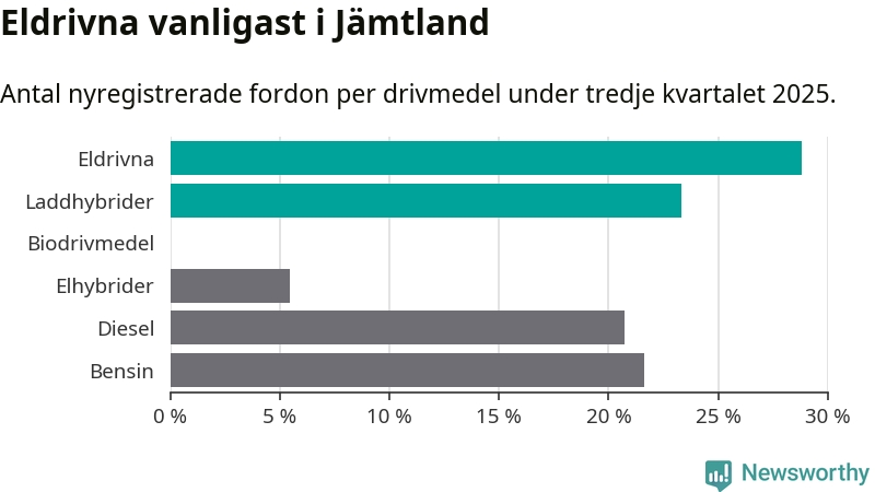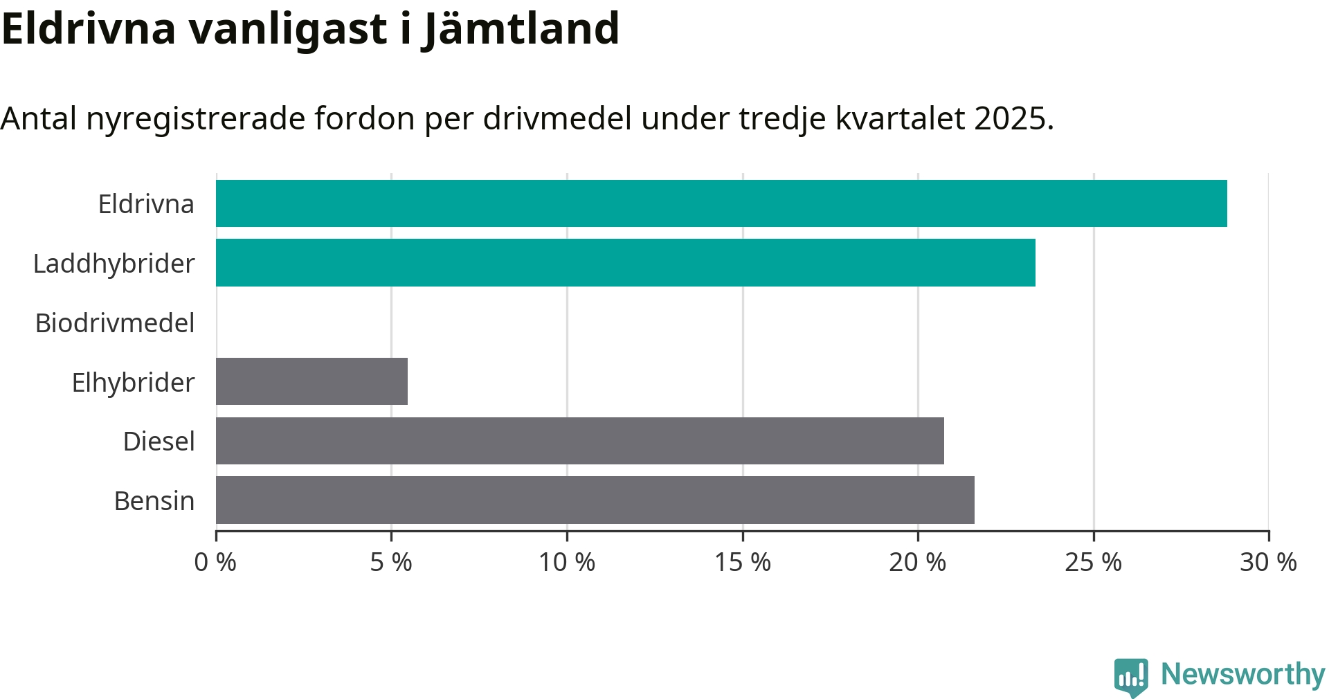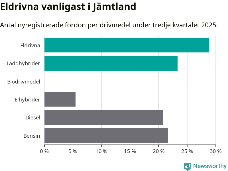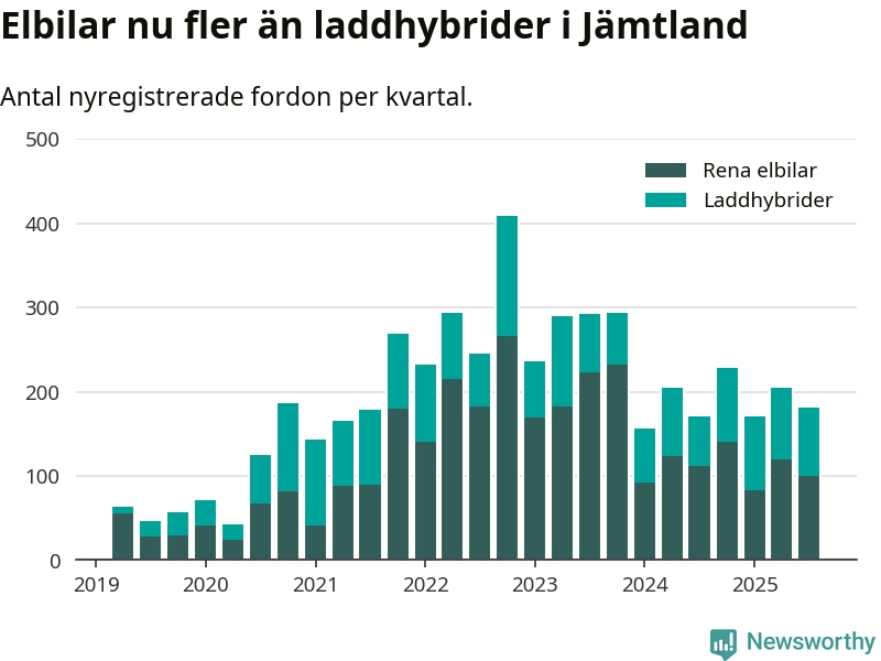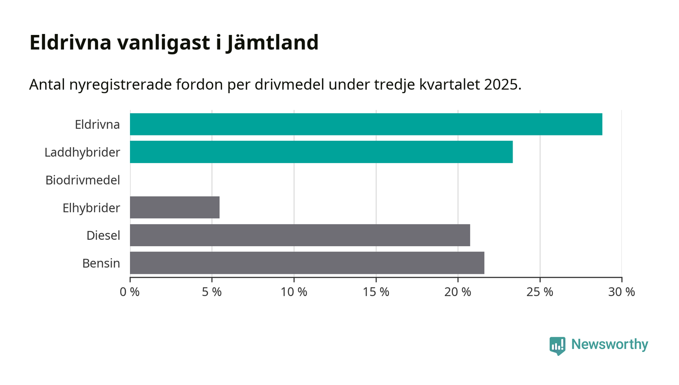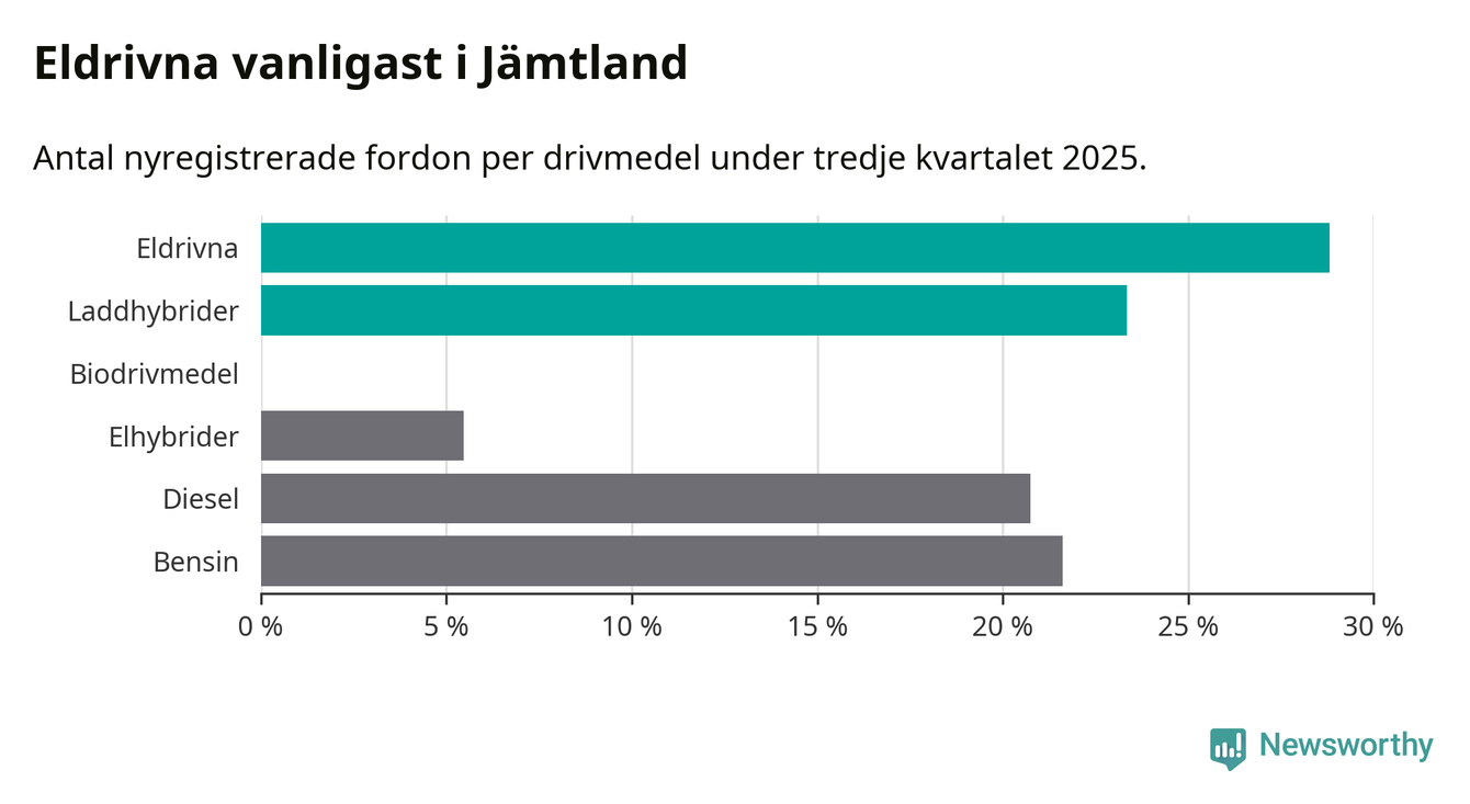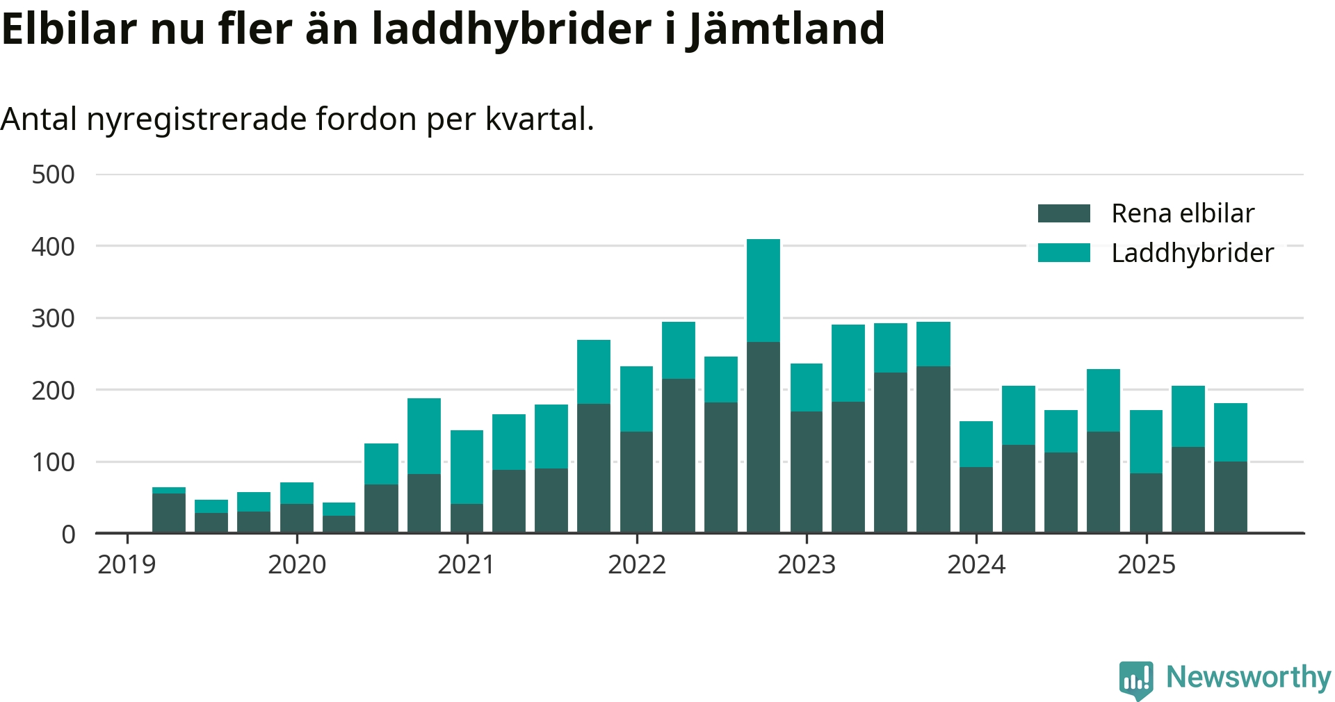 Under tredje kvartalet 2025 var 52 procent av alla nyregistrerade personbilar i Jämtland laddbara (sammanlagt registrerades 347 nya bilar). Merparten av de laddbara bilarna var rena elbilar (29 procent av alla).