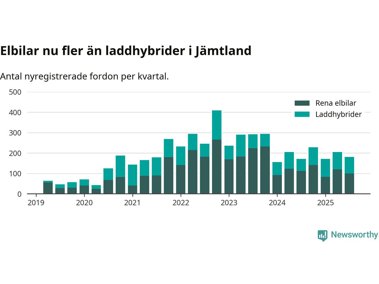 Under tredje kvartalet minskade elbilarnas och laddhybridernas andel av nyregistreringarna i Jämtlands län. Även i riket minskade andelen laddbara bilar något. Framför allt elbilsförsäljningen har tappat fart.