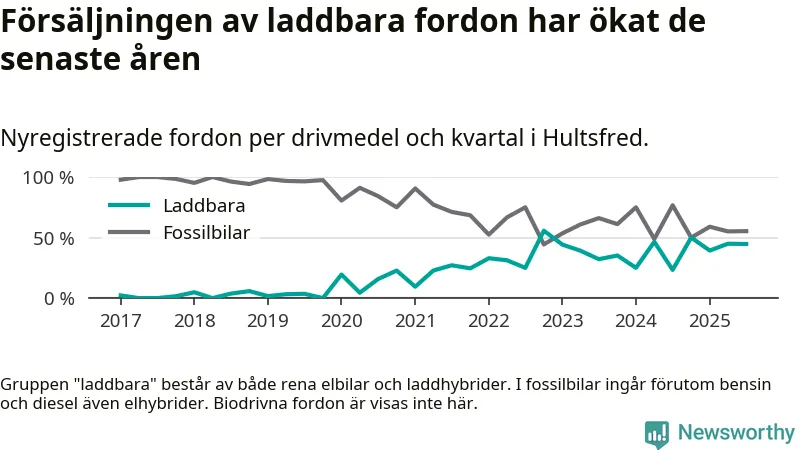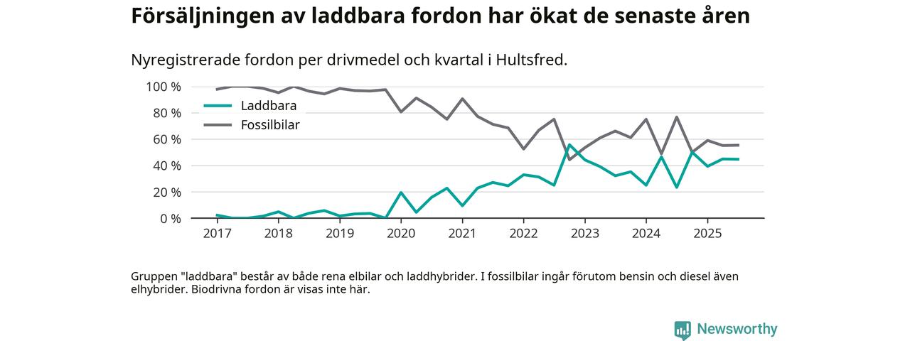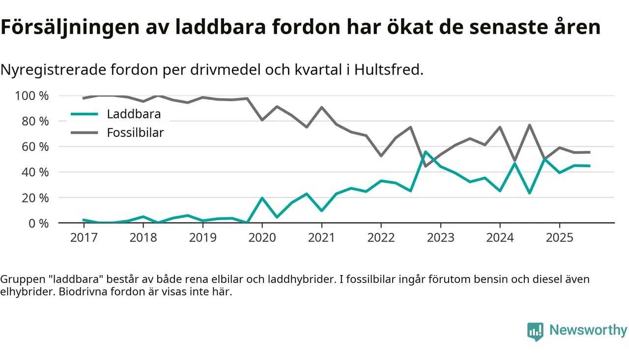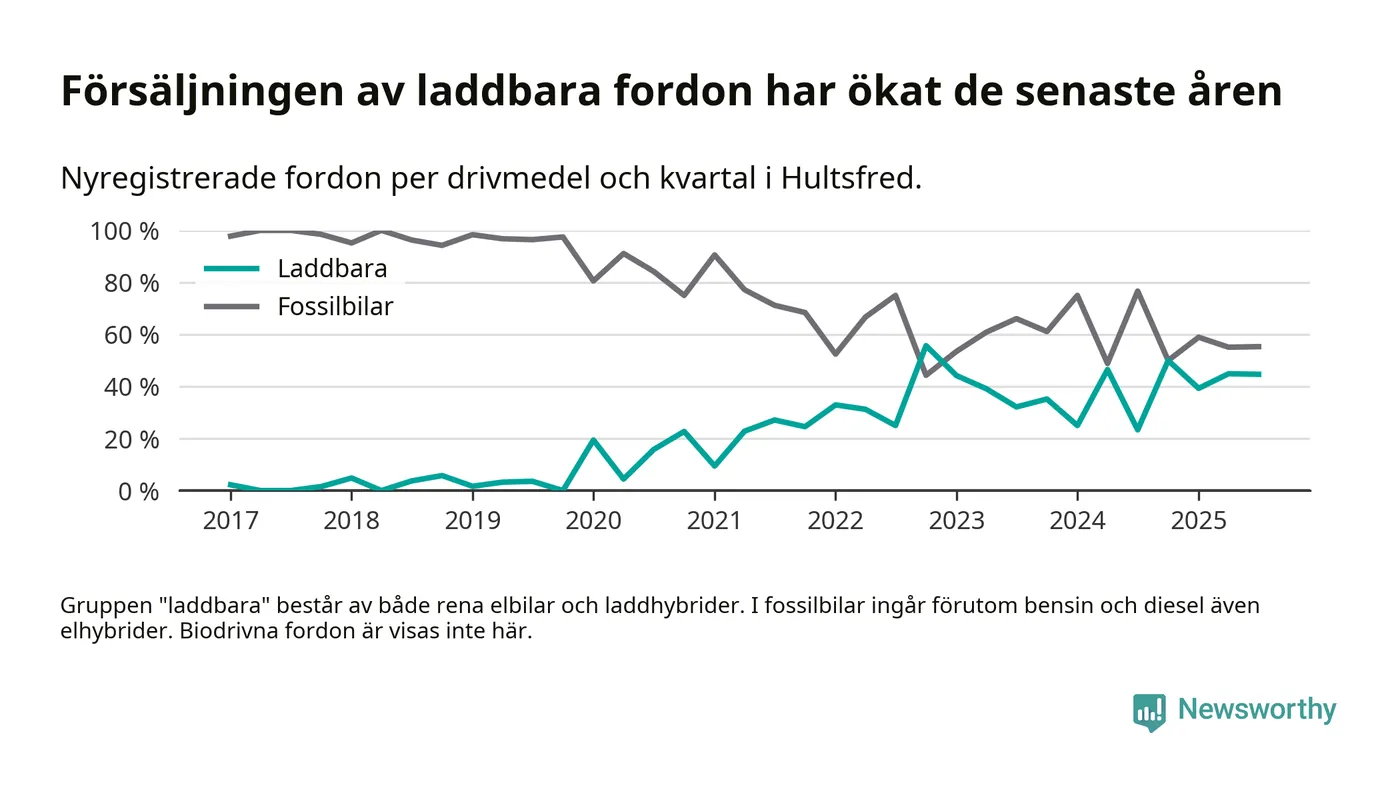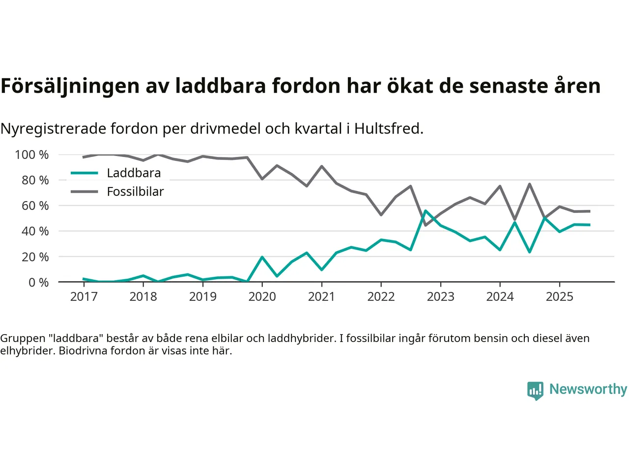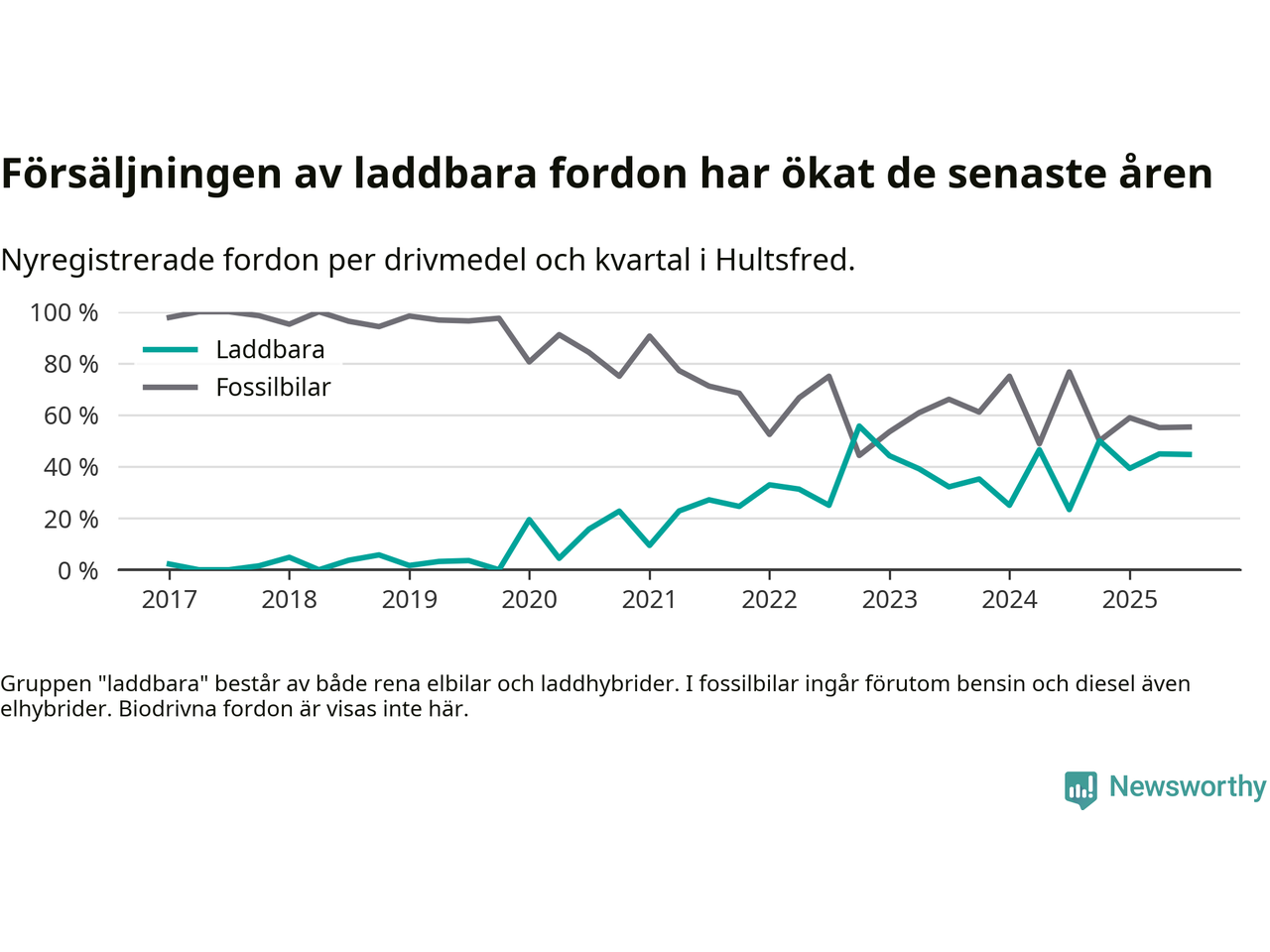 Under tredje kvartalet 2025 var 45 procent av alla nyregistrerade personbilar i Hultsfred laddbara (sammanlagt registrerades 47 nya bilar). Merparten av de laddbara bilarna var rena elbilar (30 procent av alla).