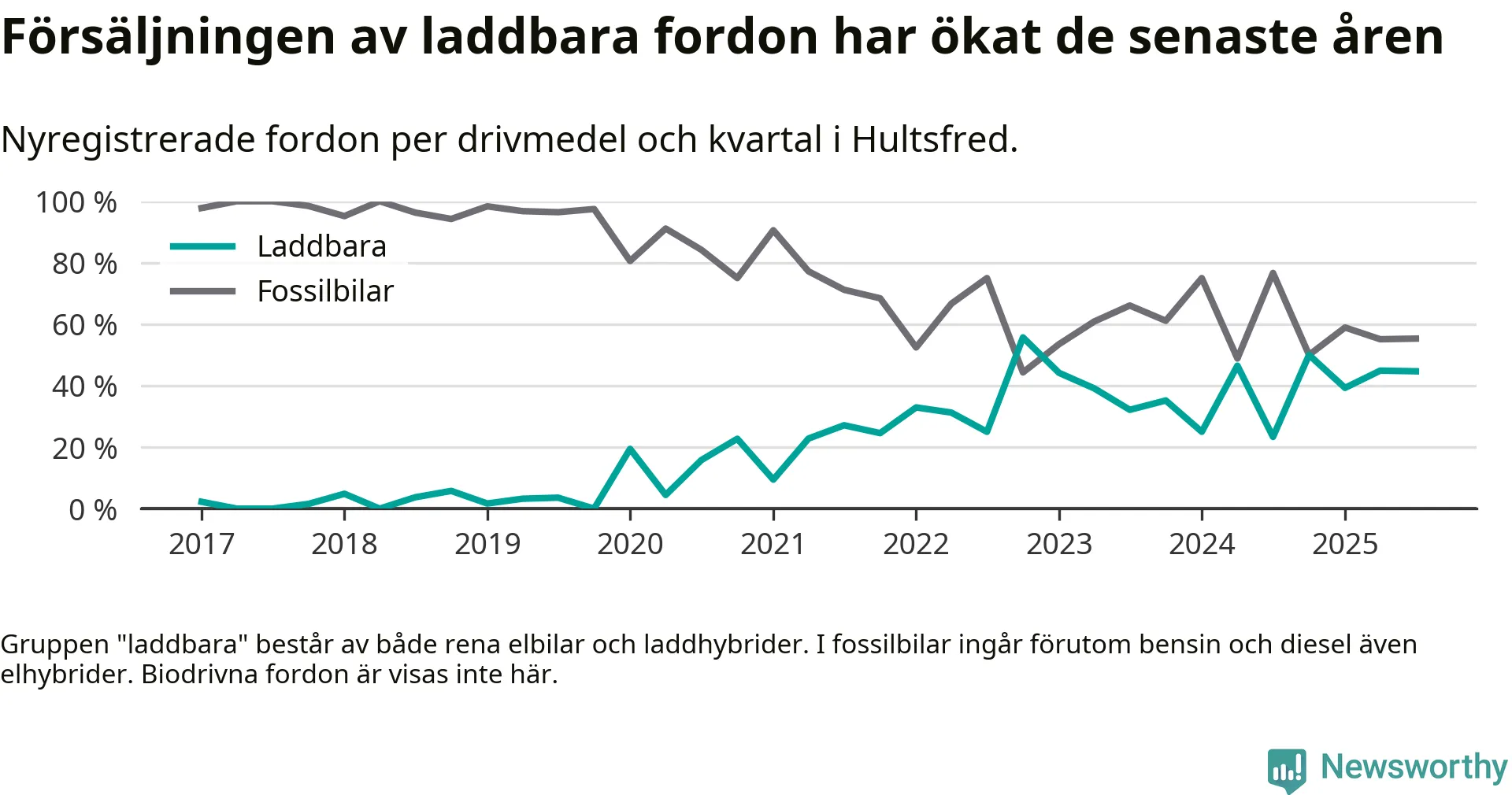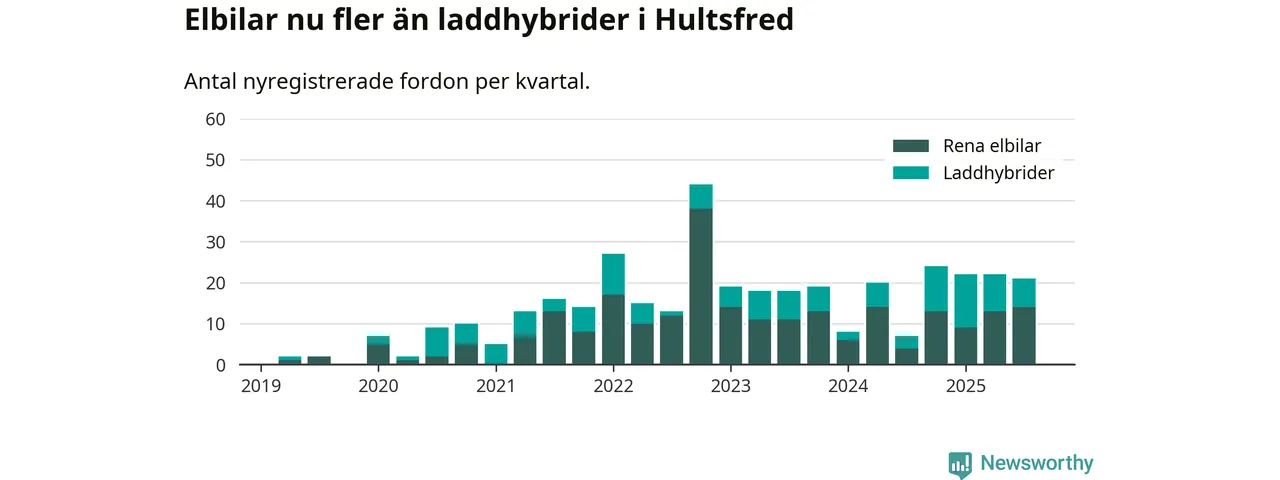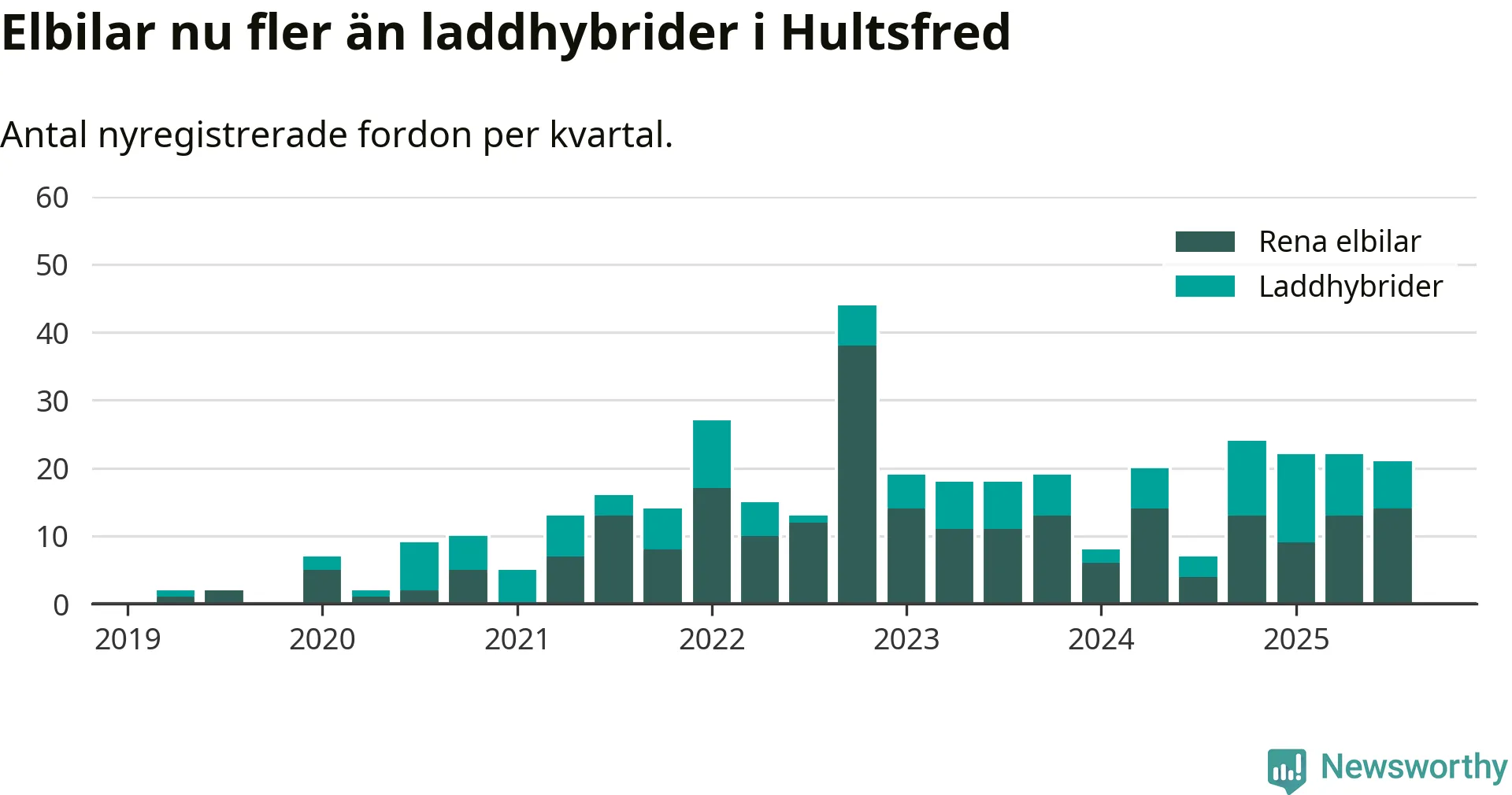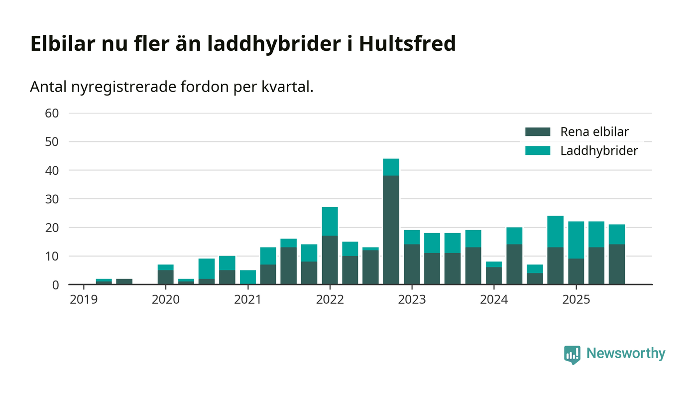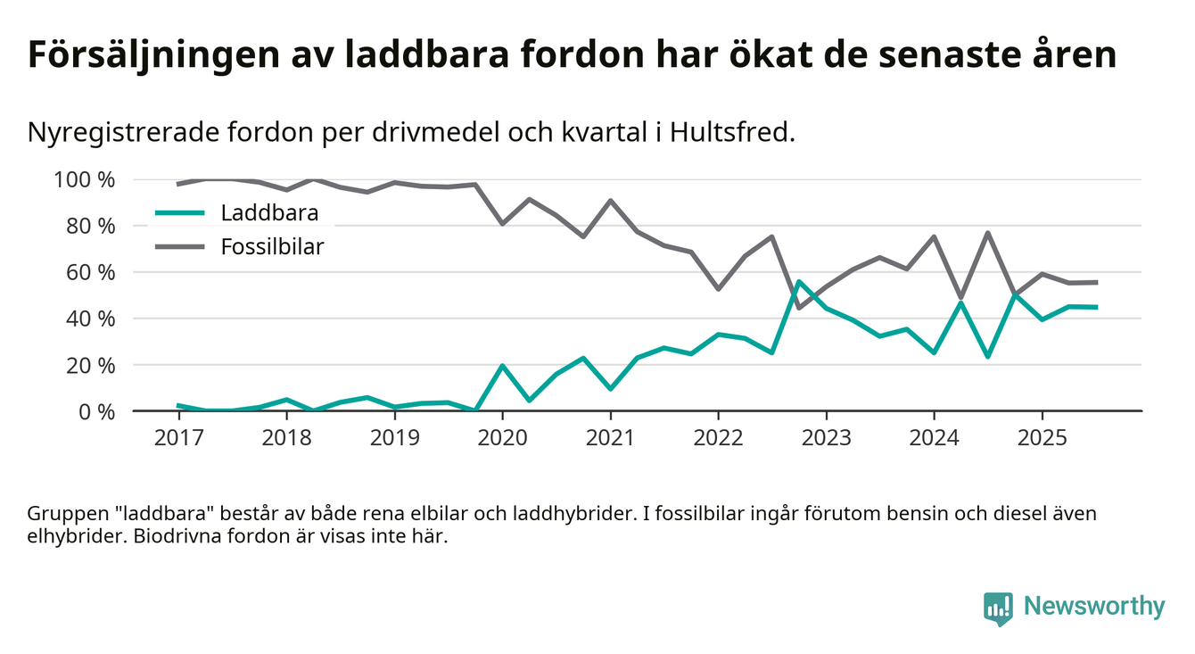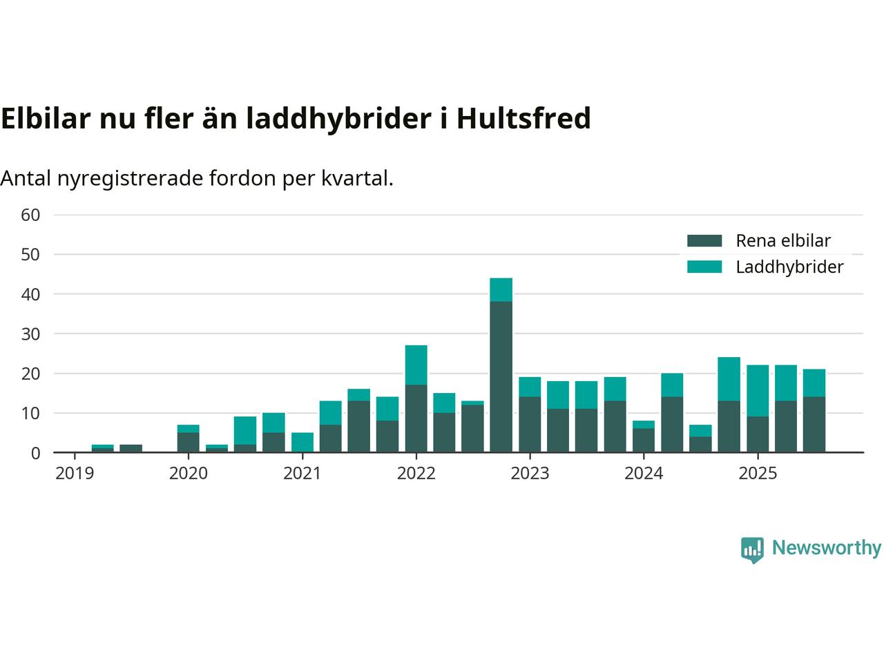 Under tredje kvartalet 2025 var 45 procent av alla nyregistrerade personbilar i Hultsfred laddbara (sammanlagt registrerades 47 nya bilar). Merparten av de laddbara bilarna var rena elbilar (30 procent av alla).
