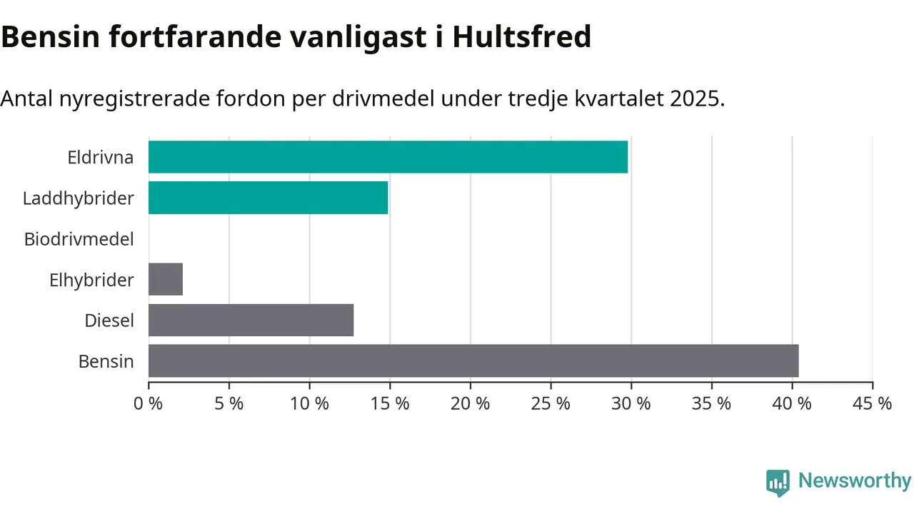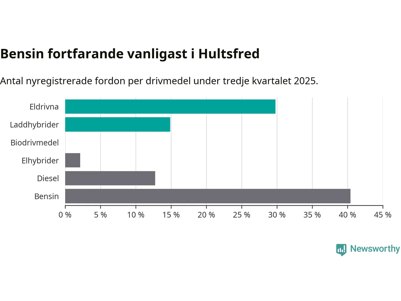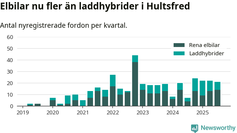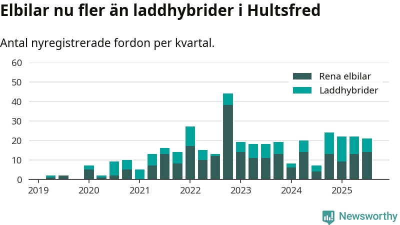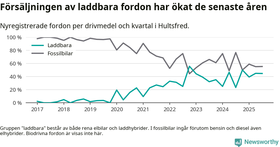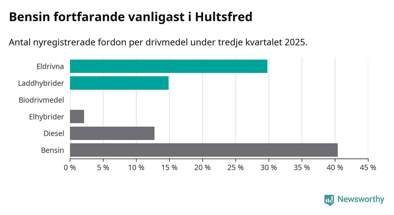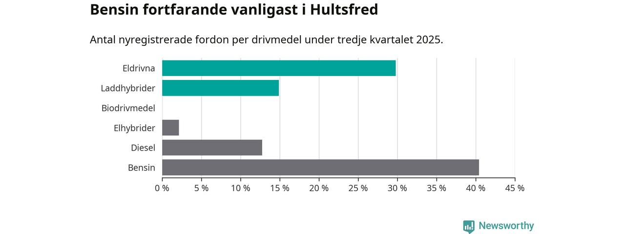 Under tredje kvartalet 2025 var 45 procent av alla nyregistrerade personbilar i Hultsfred laddbara (sammanlagt registrerades 47 nya bilar). Merparten av de laddbara bilarna var rena elbilar (30 procent av alla).
