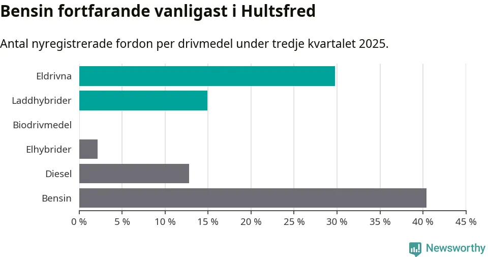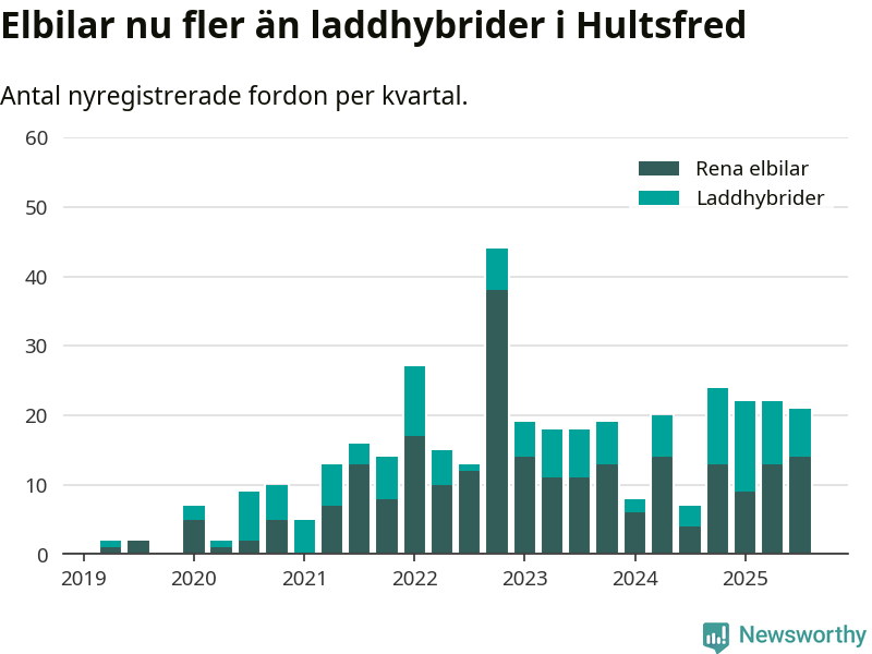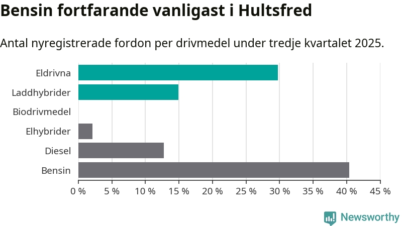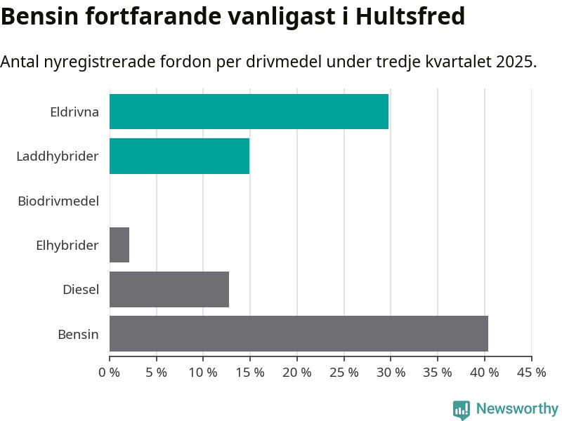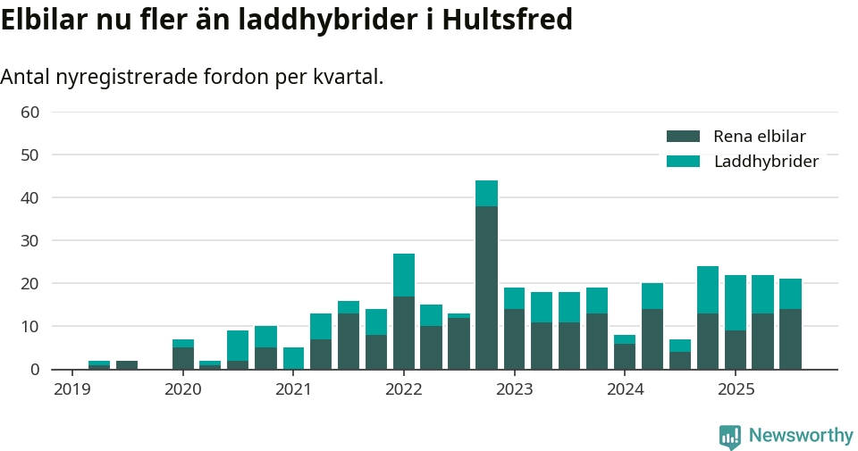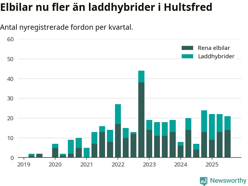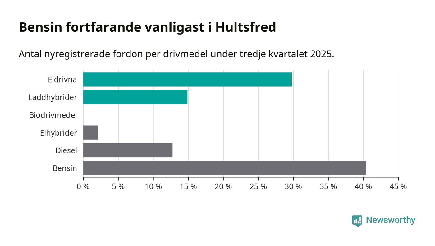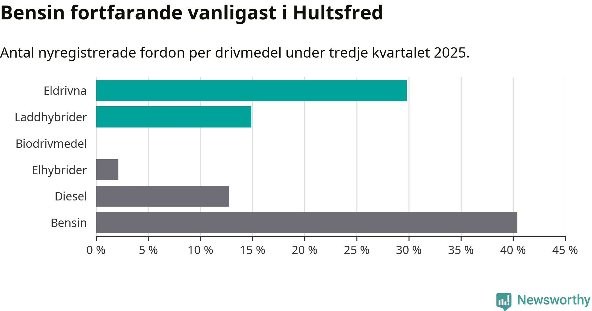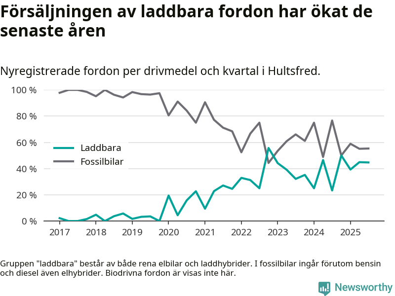 Under tredje kvartalet 2025 var 45 procent av alla nyregistrerade personbilar i Hultsfred laddbara (sammanlagt registrerades 47 nya bilar). Merparten av de laddbara bilarna var rena elbilar (30 procent av alla).