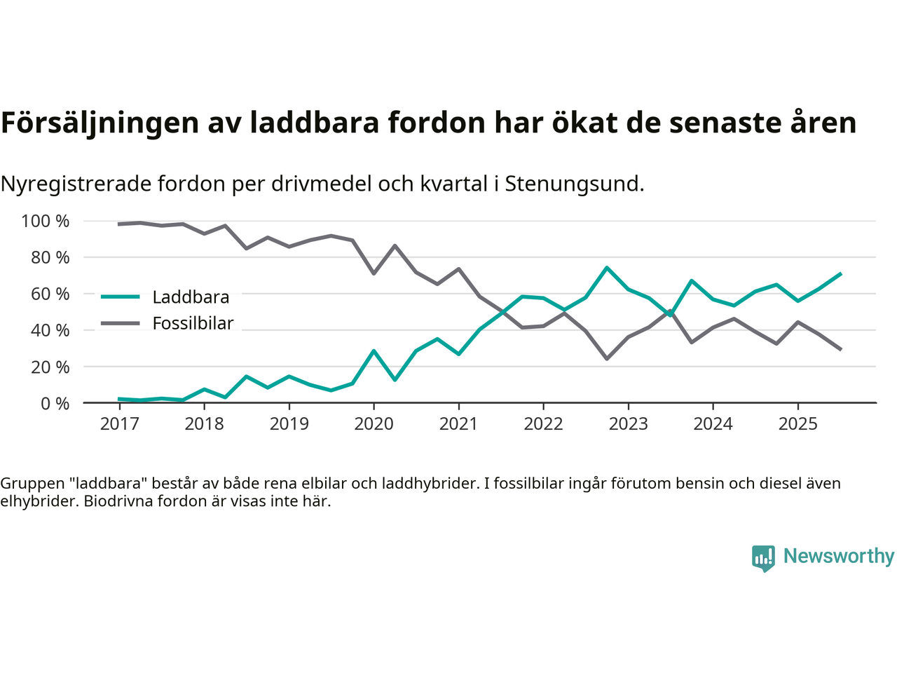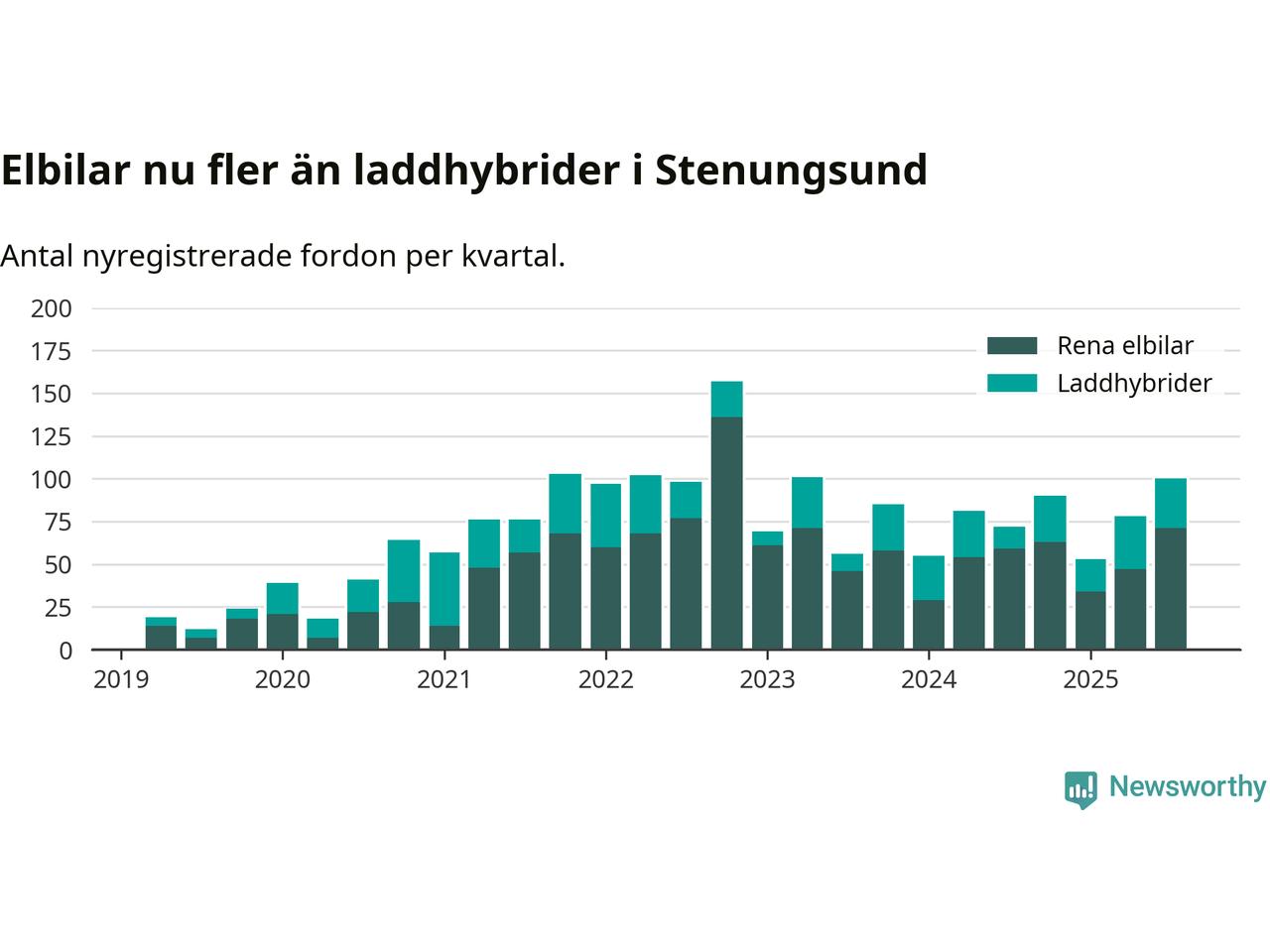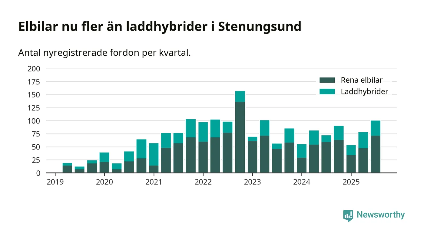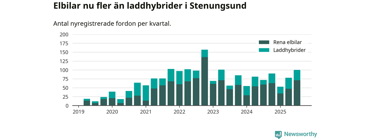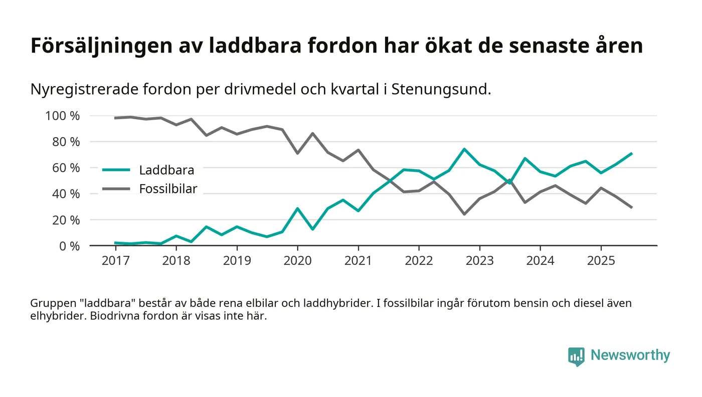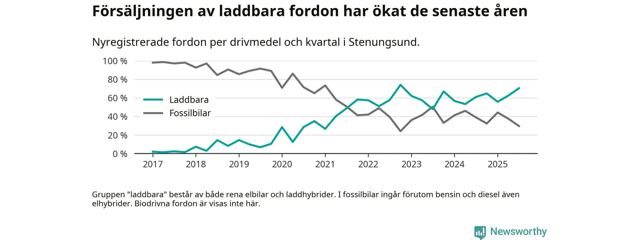Under tredje kvartalet 2025 var 70 procent av alla nyregistrerade personbilar i Stenungsund laddbara (sammanlagt registrerades 142 nya bilar). Merparten av de laddbara bilarna var rena elbilar (50 procent av alla).
