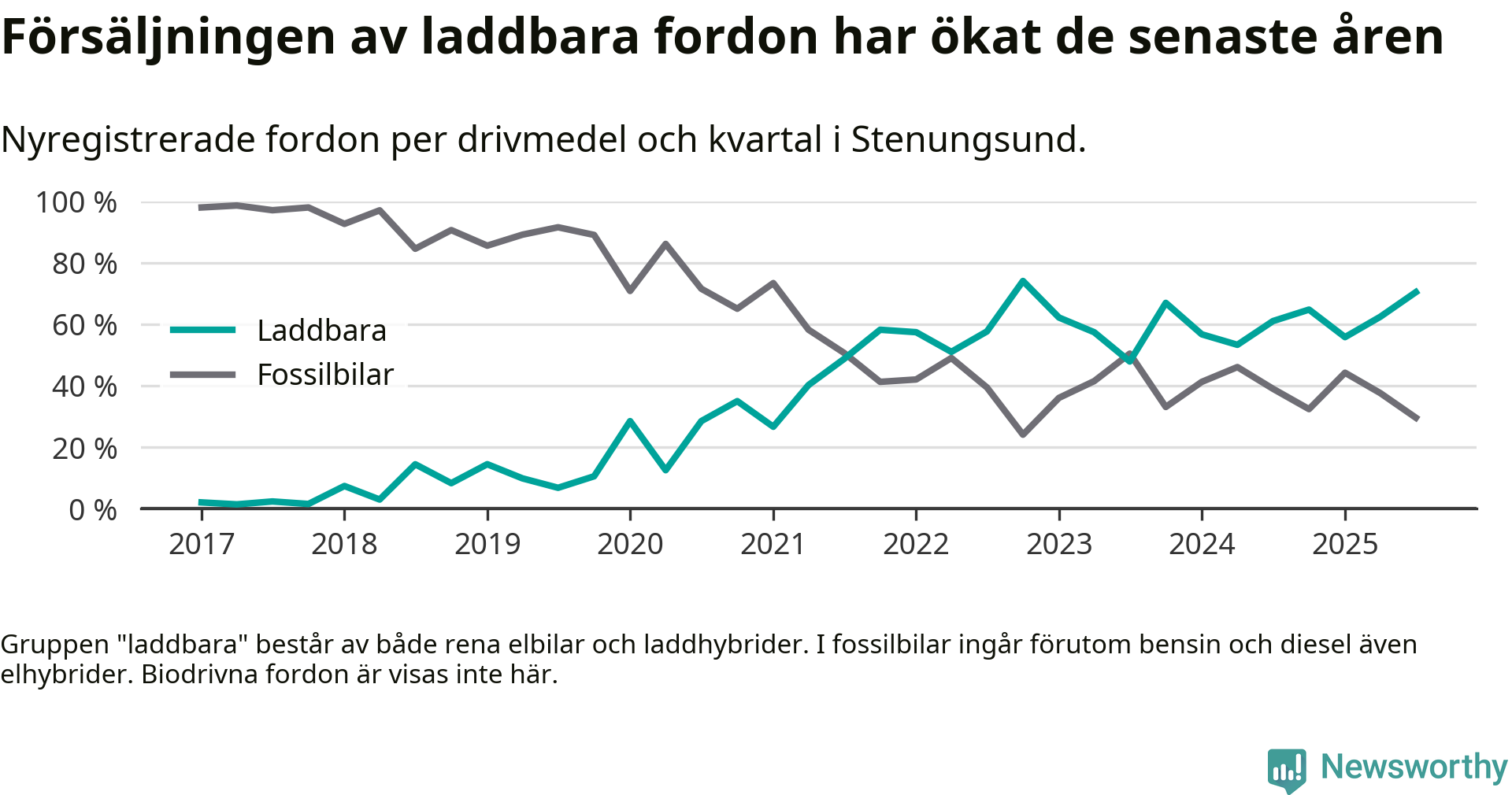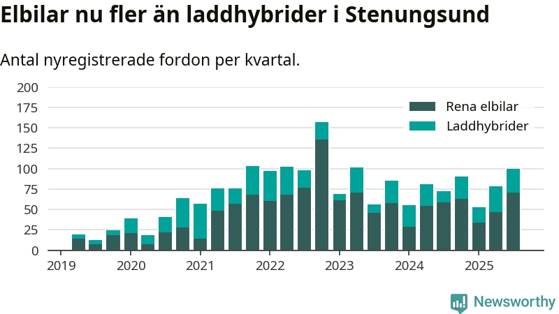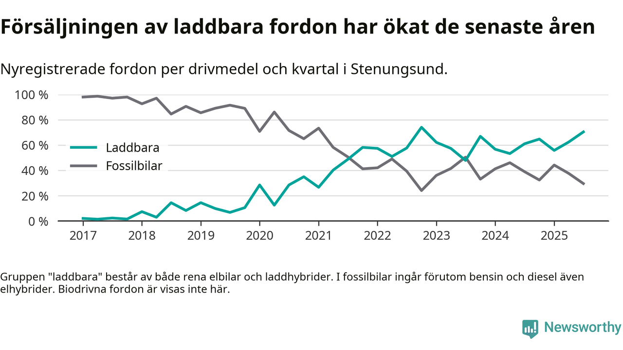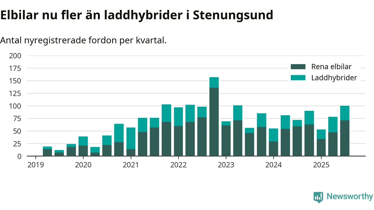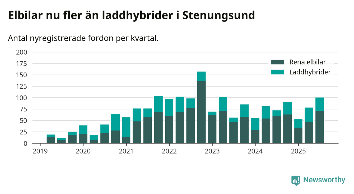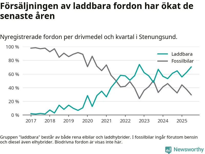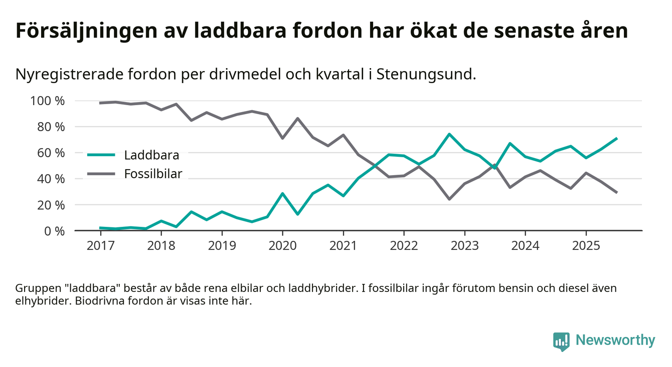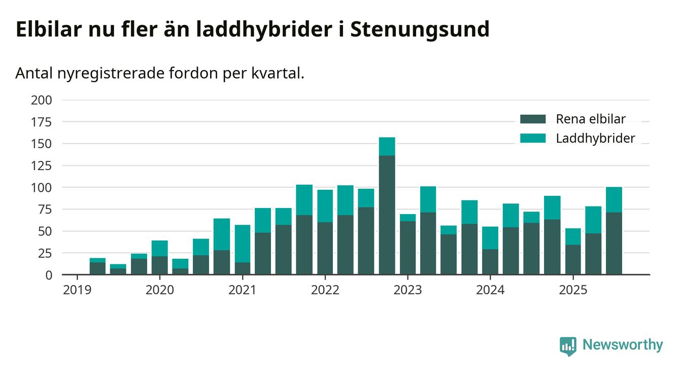Under tredje kvartalet 2025 var 70 procent av alla nyregistrerade personbilar i Stenungsund laddbara (sammanlagt registrerades 142 nya bilar). Merparten av de laddbara bilarna var rena elbilar (50 procent av alla).