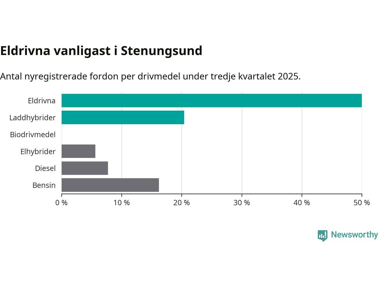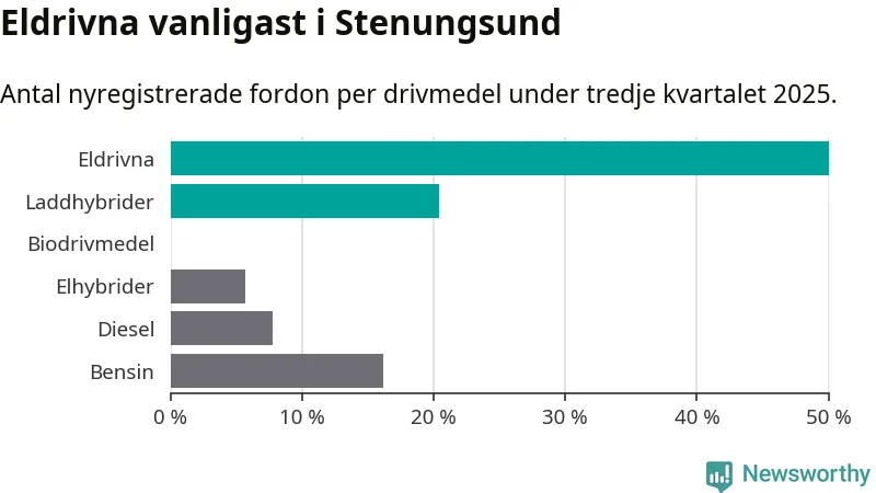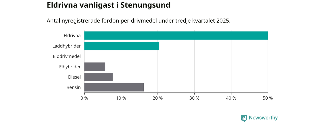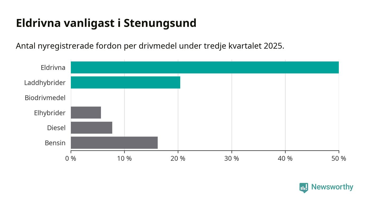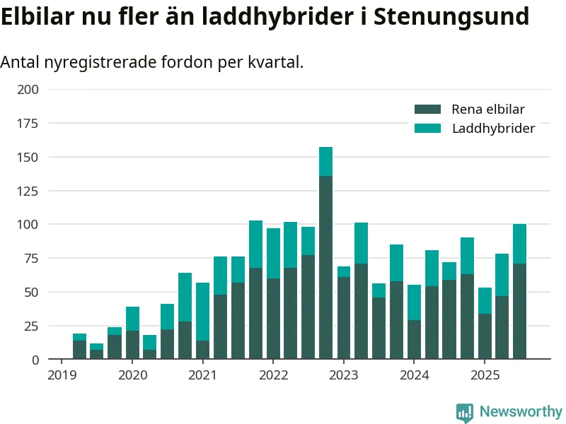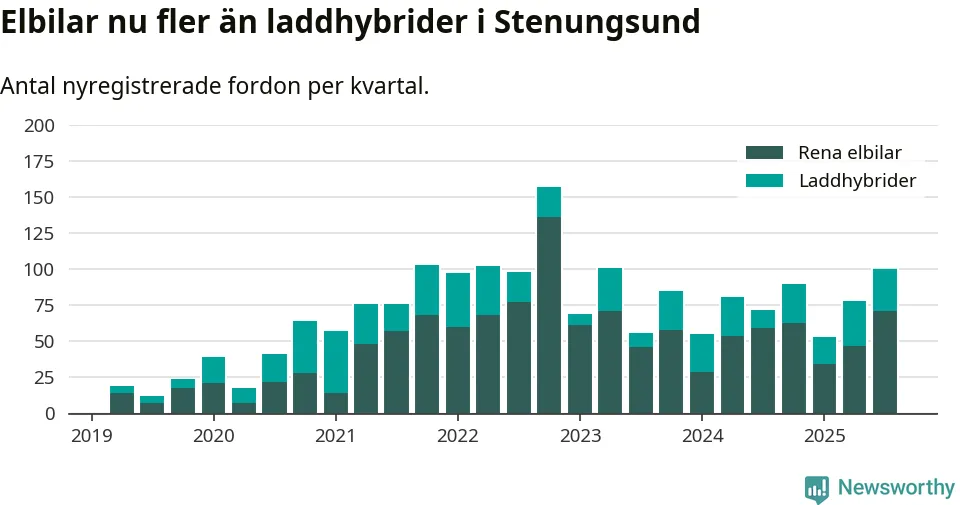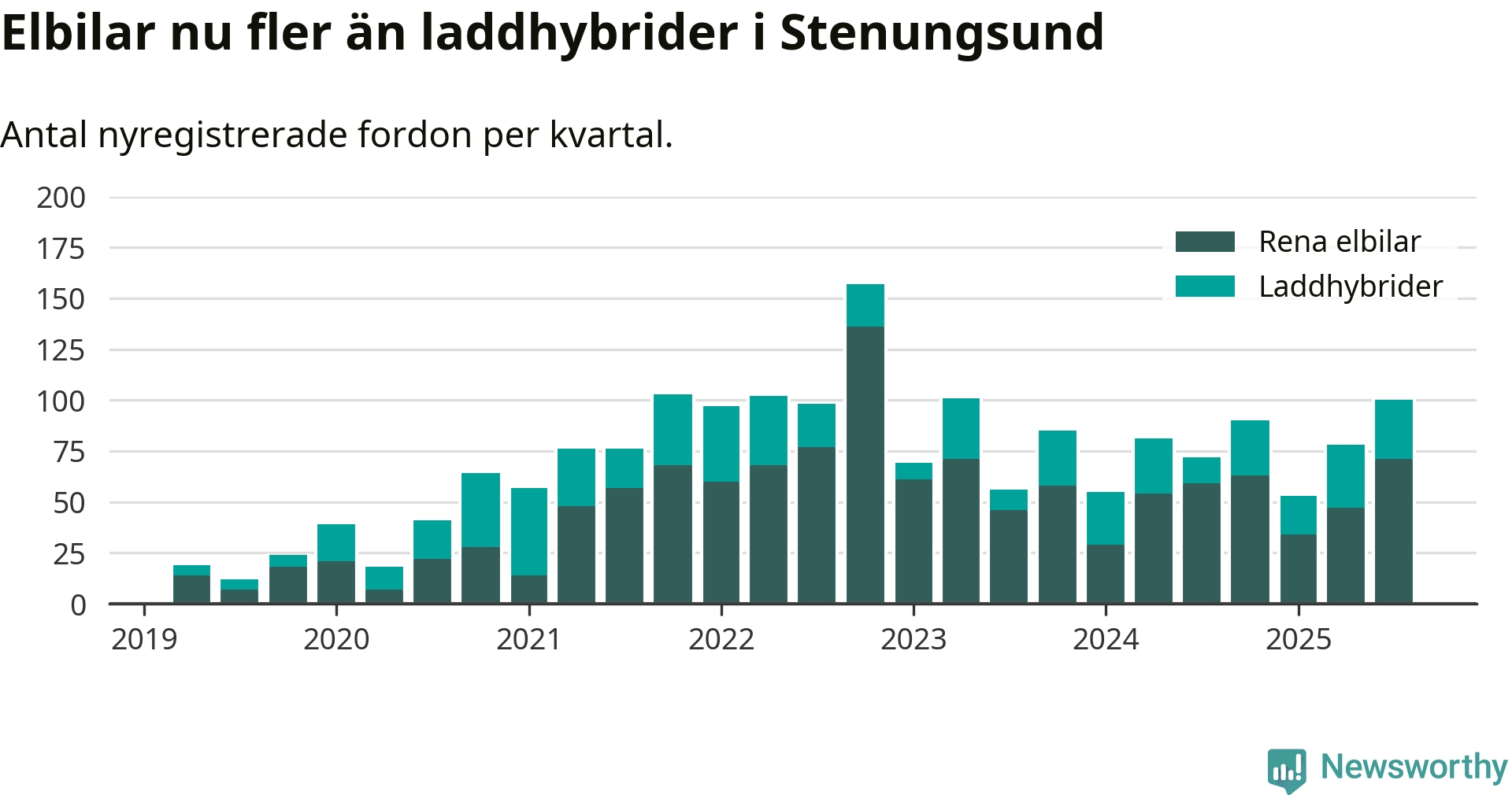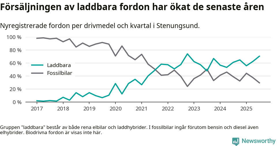Under tredje kvartalet 2025 var 70 procent av alla nyregistrerade personbilar i Stenungsund laddbara (sammanlagt registrerades 142 nya bilar). Merparten av de laddbara bilarna var rena elbilar (50 procent av alla).