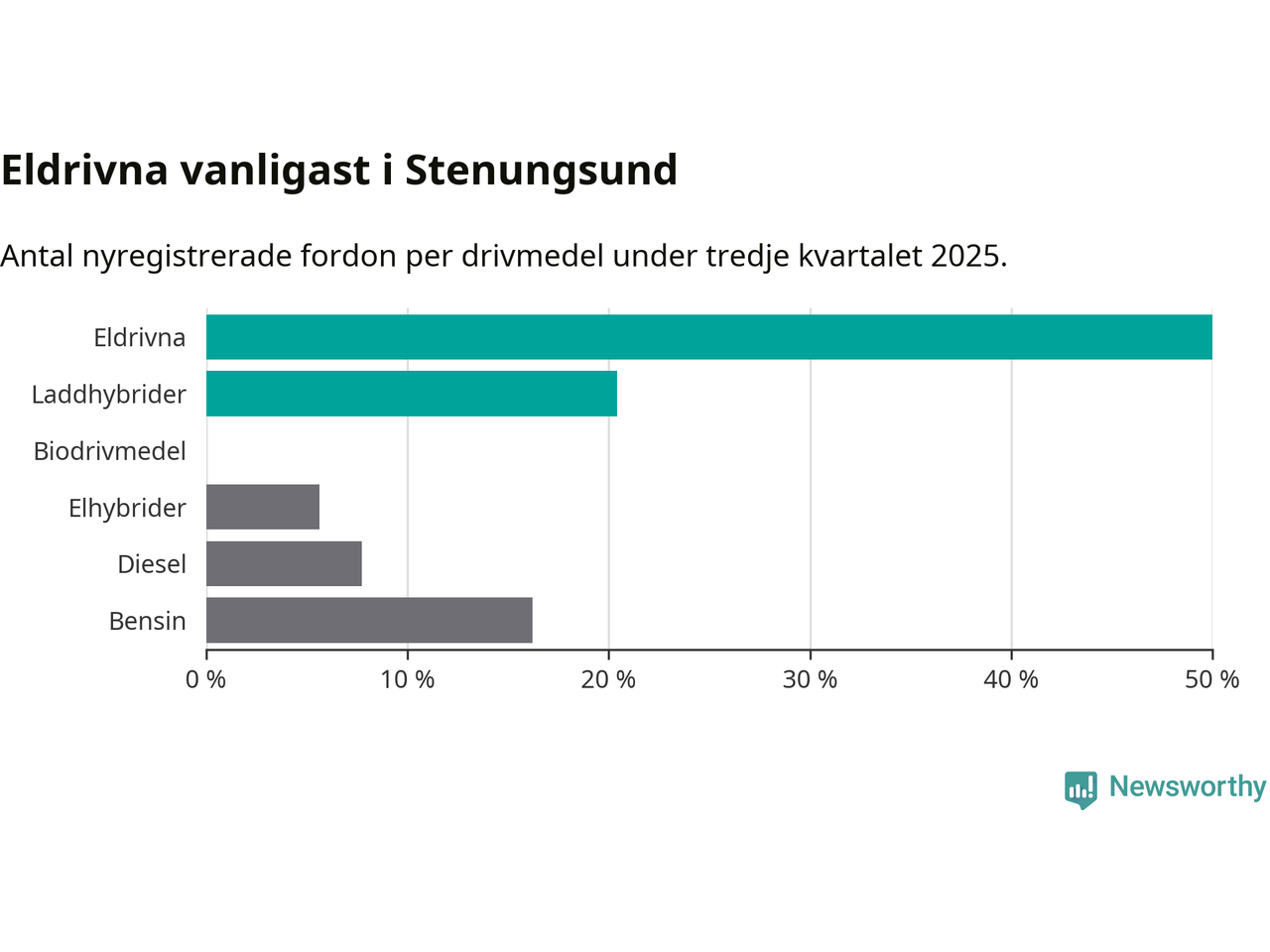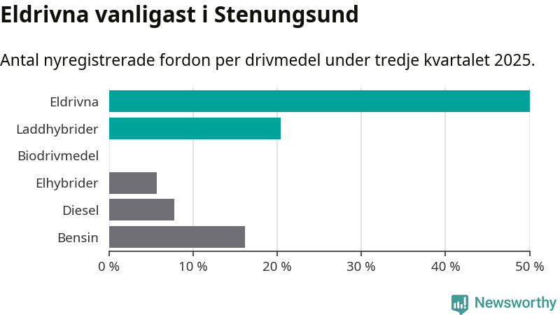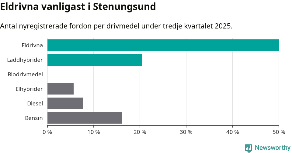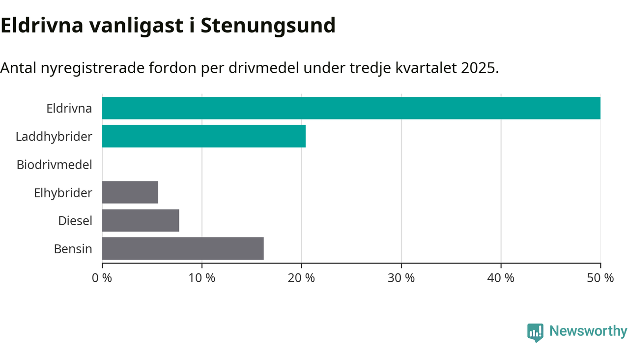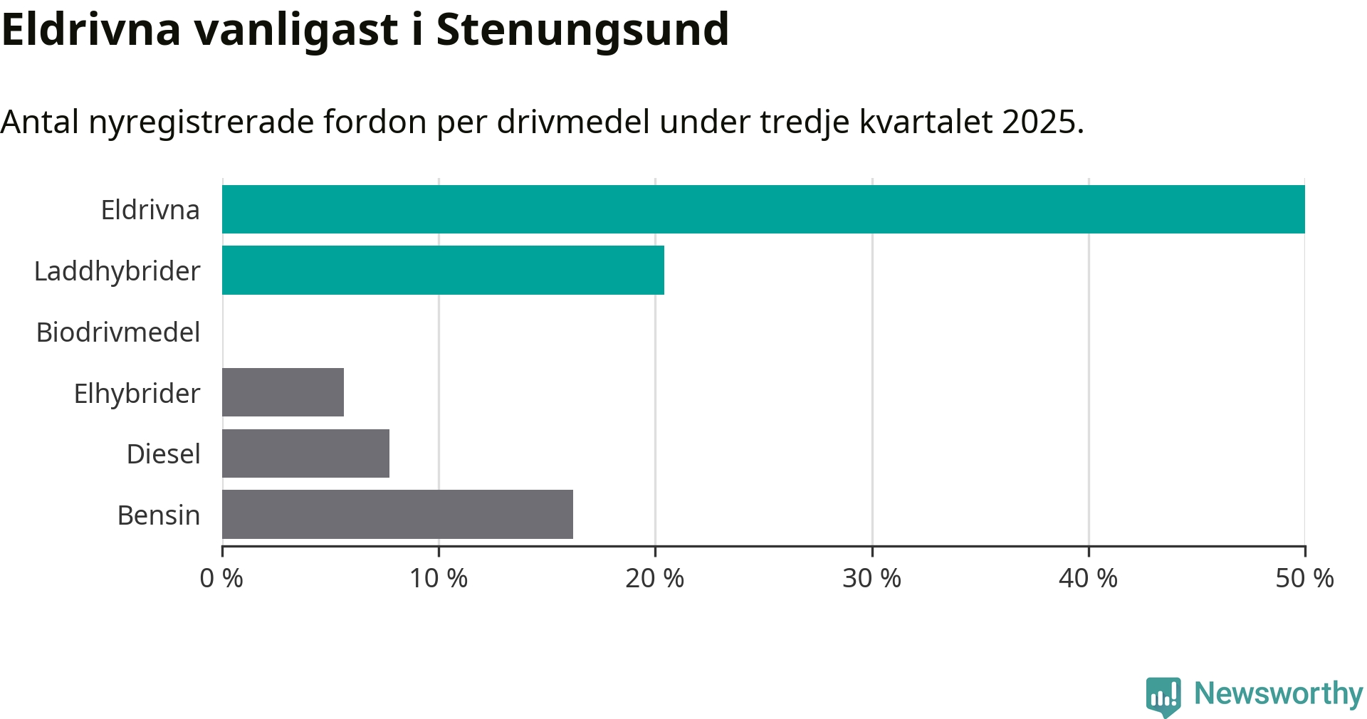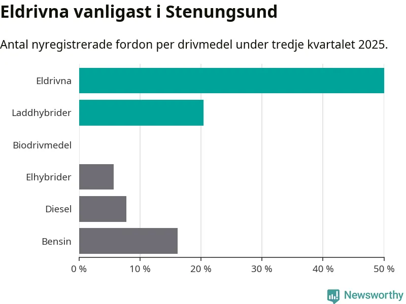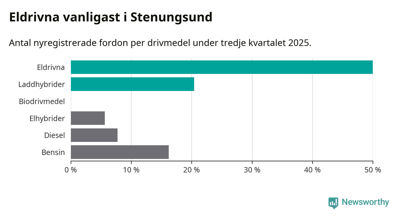 Under tredje kvartalet 2025 var 70 procent av alla nyregistrerade personbilar i Stenungsund laddbara (sammanlagt registrerades 142 nya bilar). Merparten av de laddbara bilarna var rena elbilar (50 procent av alla).