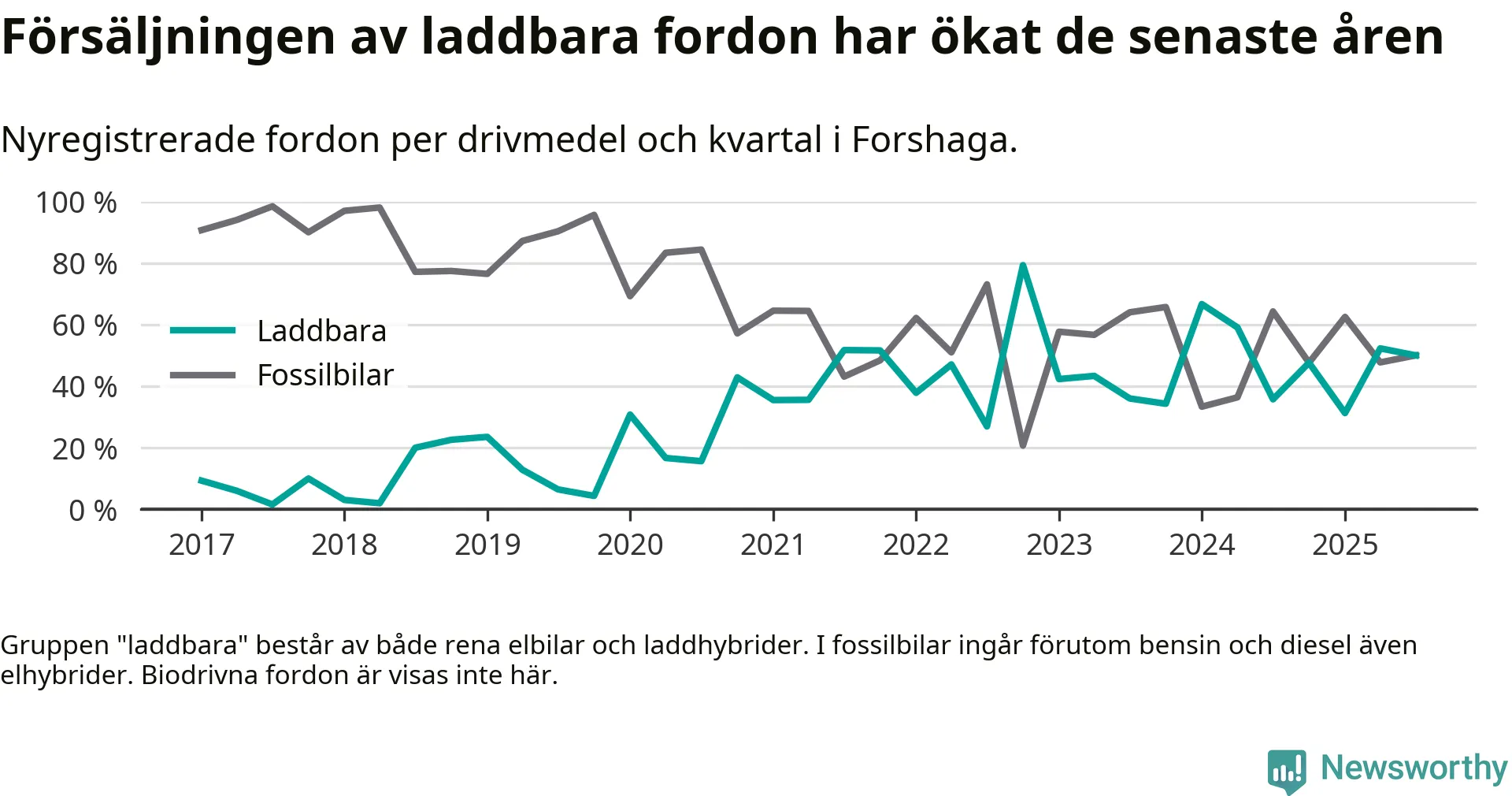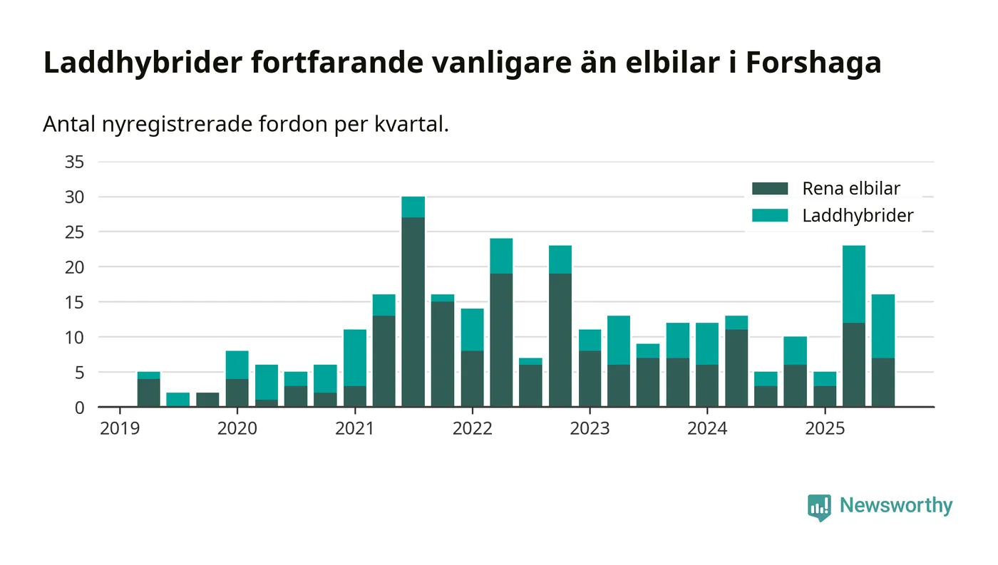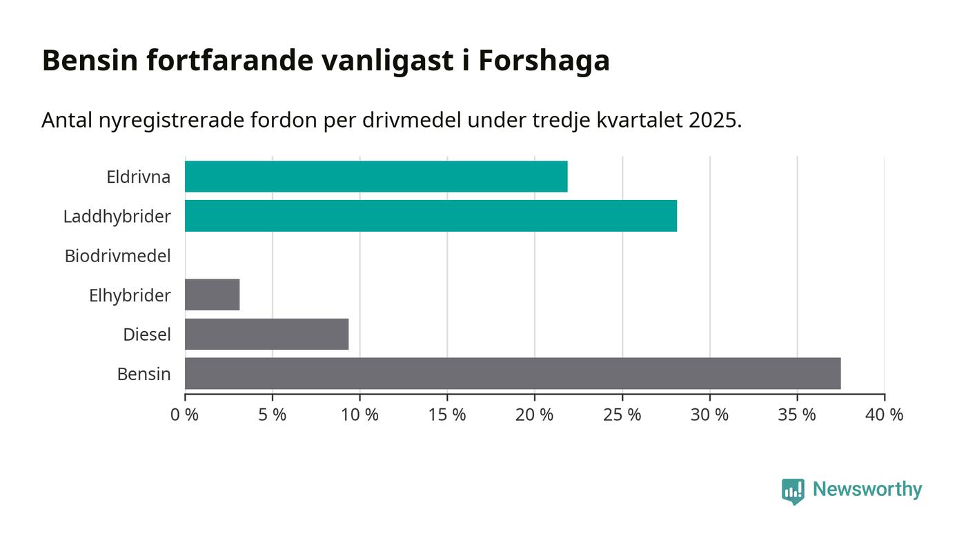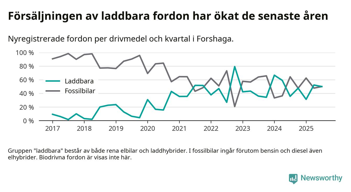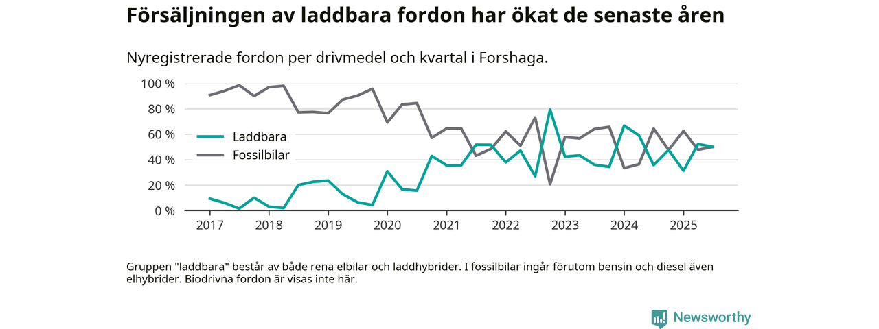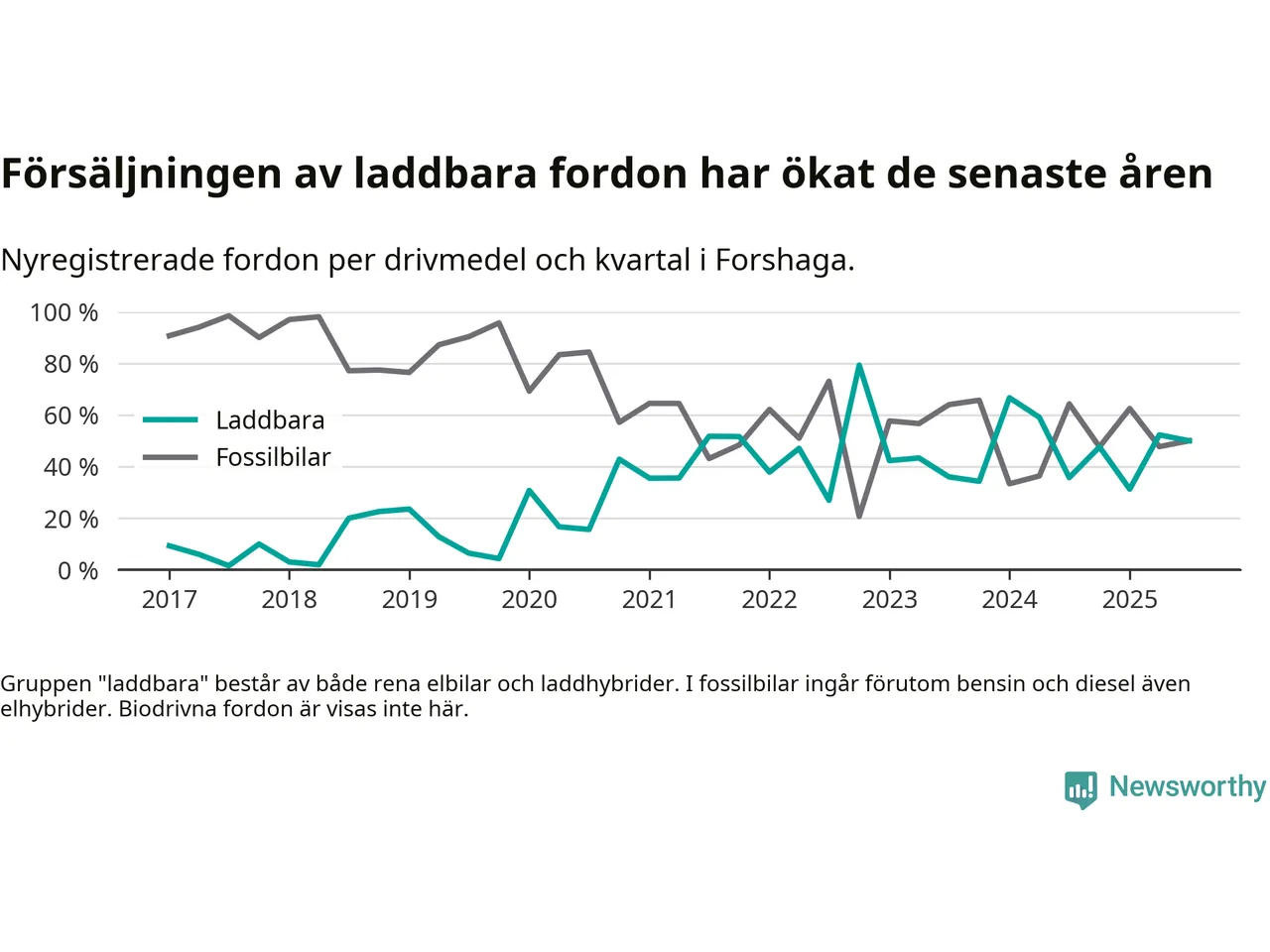 Under tredje kvartalet 2025 var 50 procent av alla nyregistrerade personbilar i Forshaga laddbara (sammanlagt registrerades 32 nya bilar). Merparten av de laddbara bilarna var så kallade laddhybrider, det vill säga fordon som går att ladda och köra på el, men som även har en förbränningsmotor. 22 procent av alla nya bilar var rena elbilar.