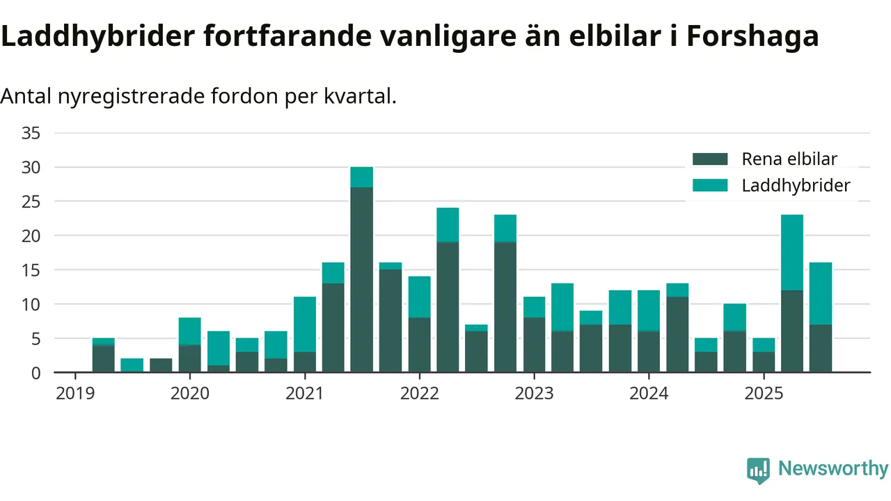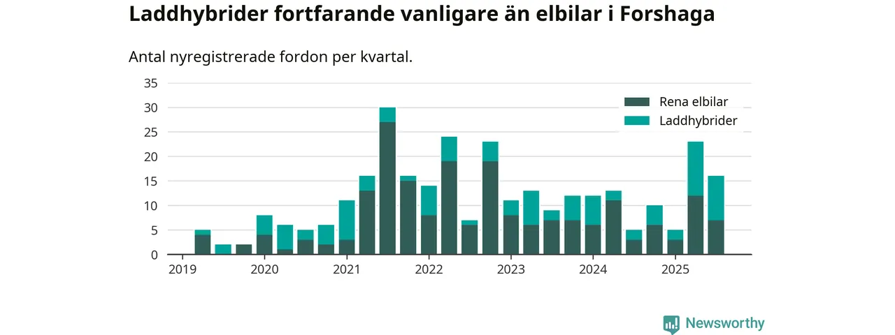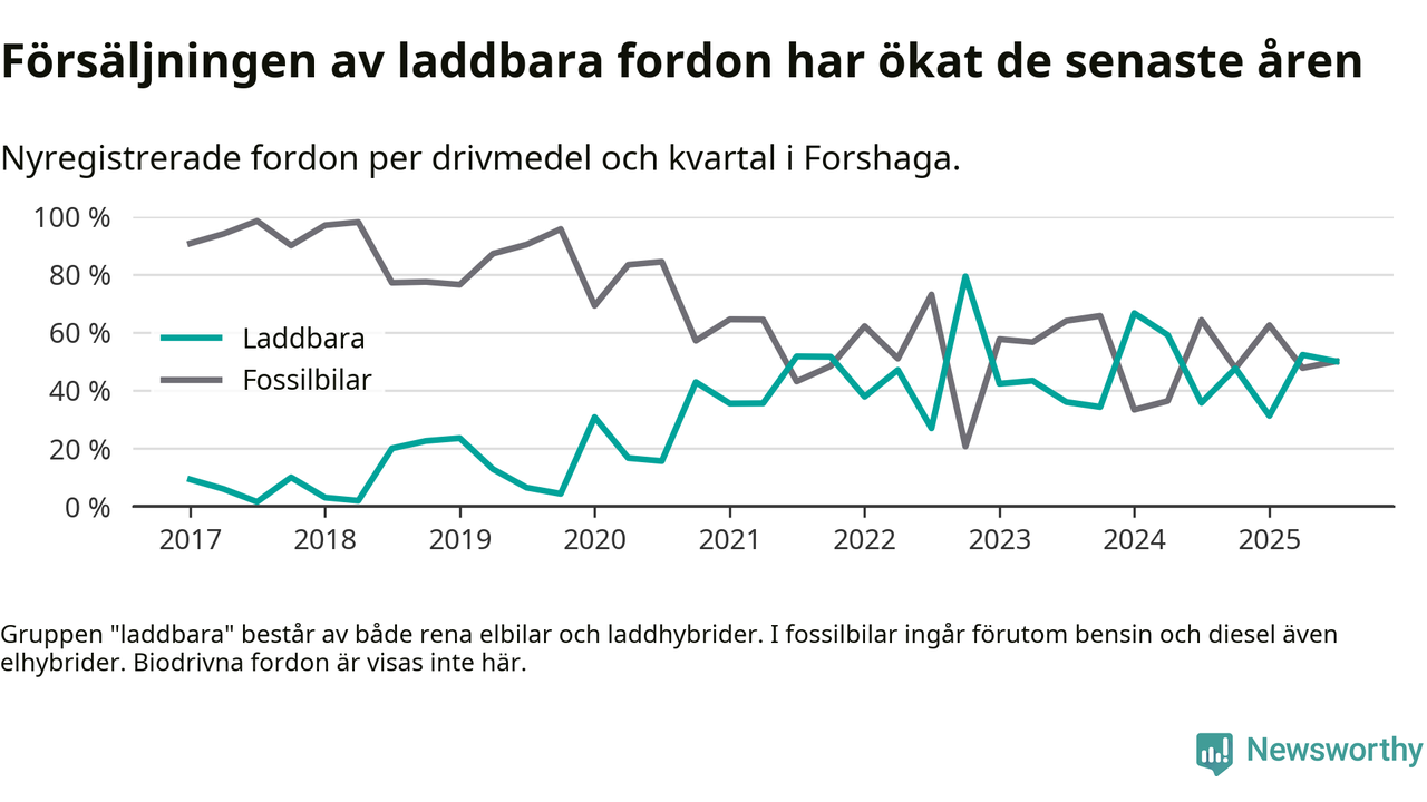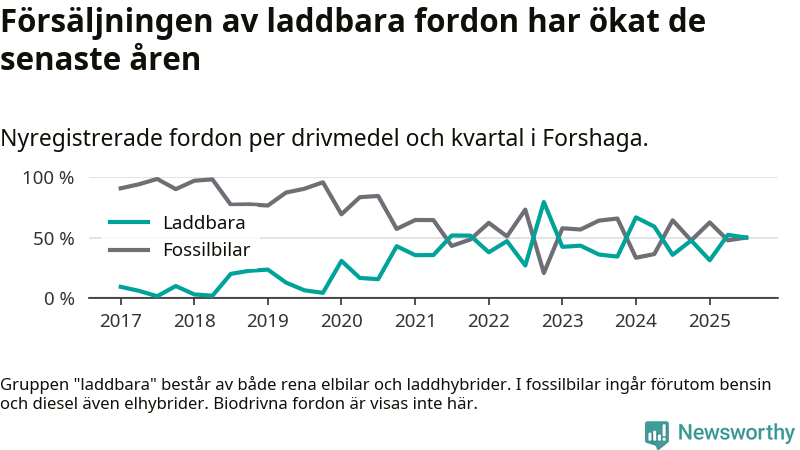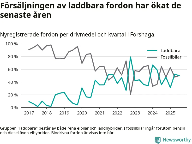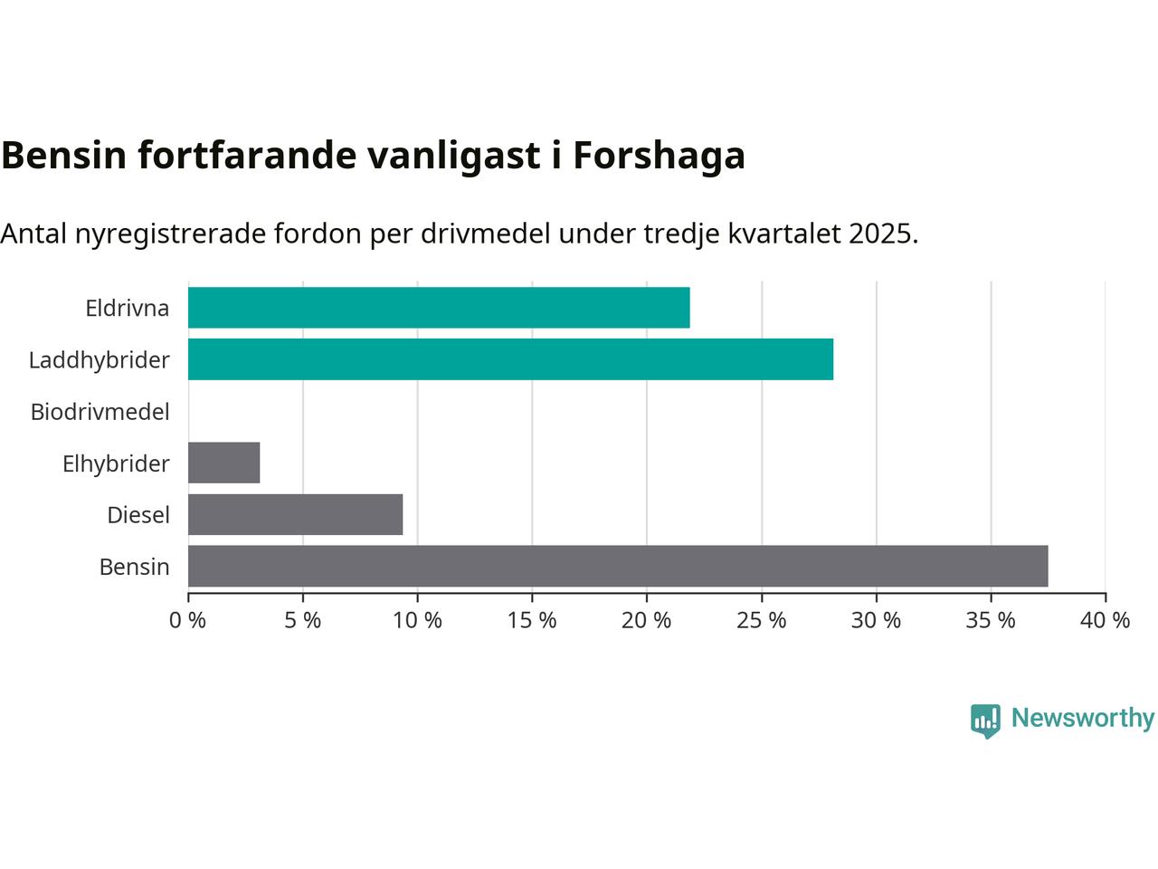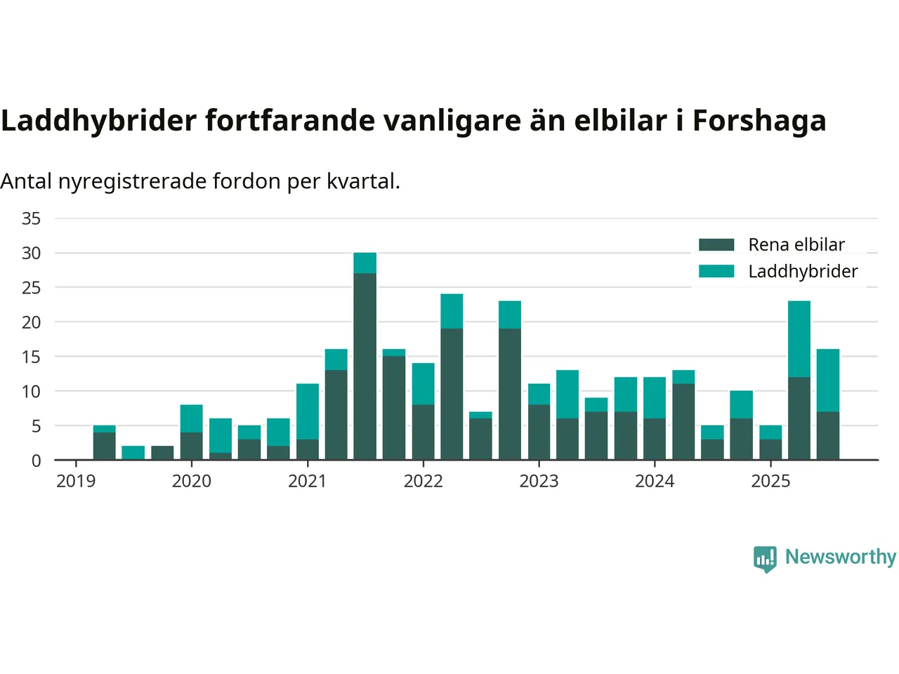Under tredje kvartalet 2025 var 50 procent av alla nyregistrerade personbilar i Forshaga laddbara (sammanlagt registrerades 32 nya bilar). Merparten av de laddbara bilarna var så kallade laddhybrider, det vill säga fordon som går att ladda och köra på el, men som även har en förbränningsmotor. 22 procent av alla nya bilar var rena elbilar.