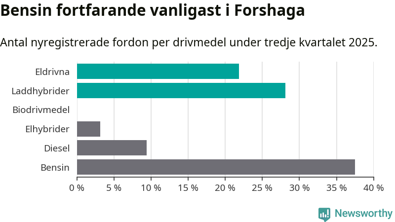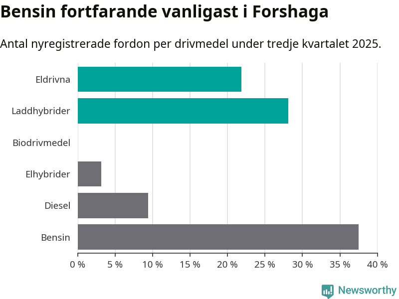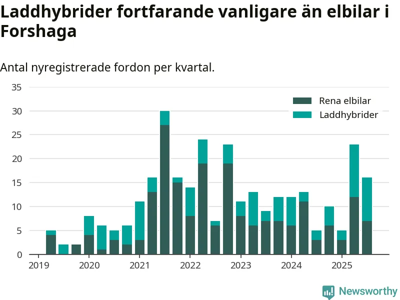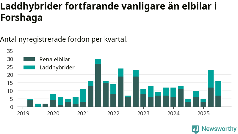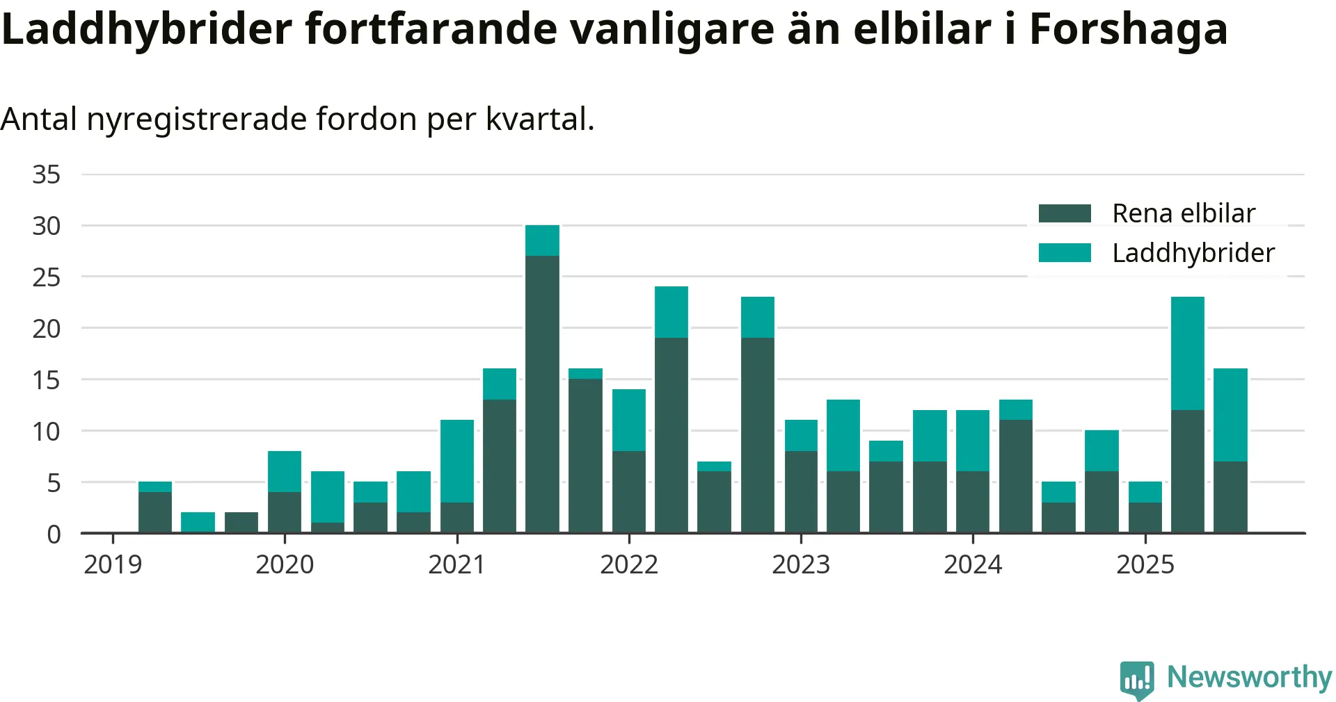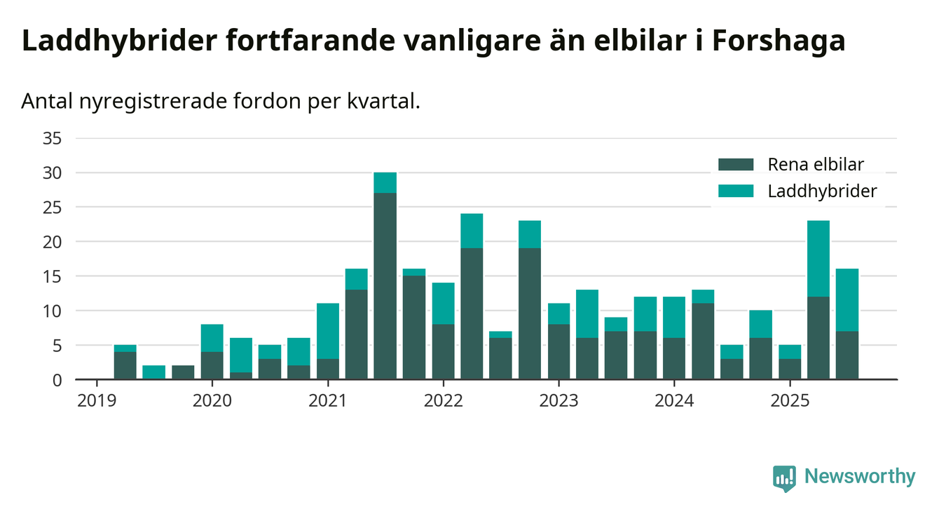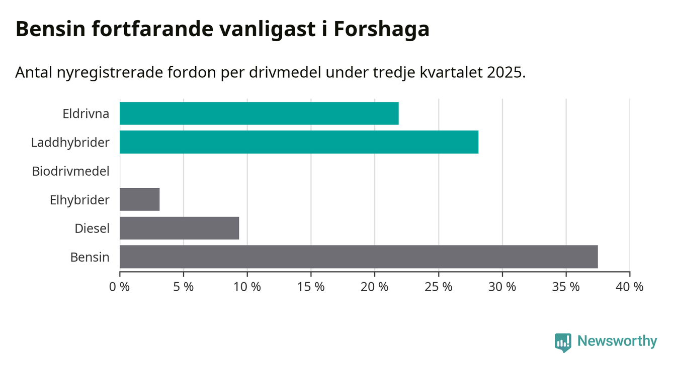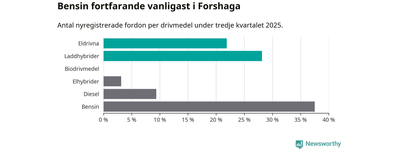 Under tredje kvartalet 2025 var 50 procent av alla nyregistrerade personbilar i Forshaga laddbara (sammanlagt registrerades 32 nya bilar). Merparten av de laddbara bilarna var så kallade laddhybrider, det vill säga fordon som går att ladda och köra på el, men som även har en förbränningsmotor. 22 procent av alla nya bilar var rena elbilar.