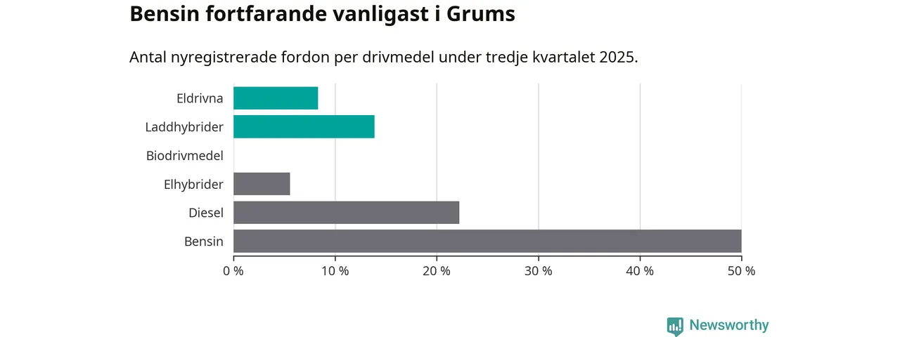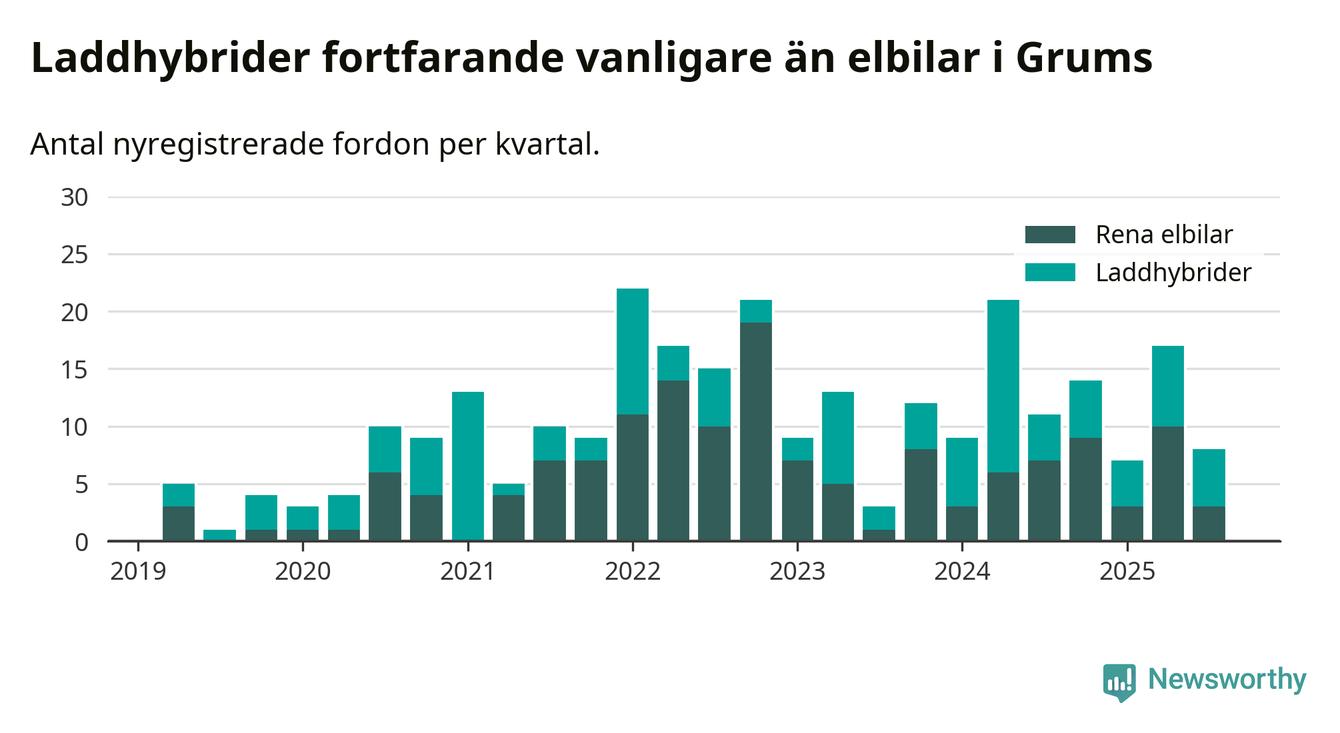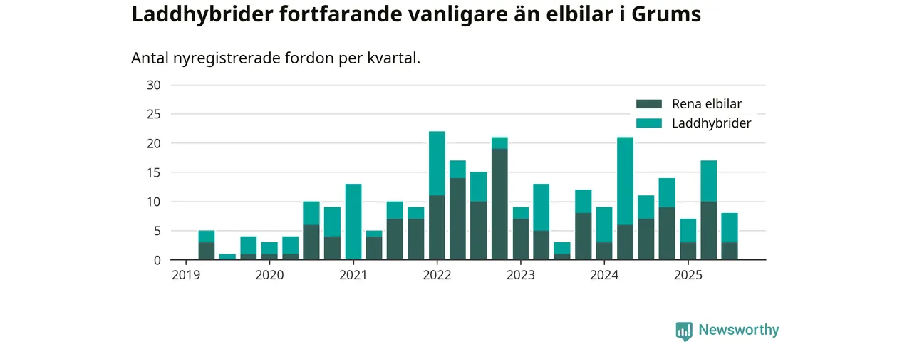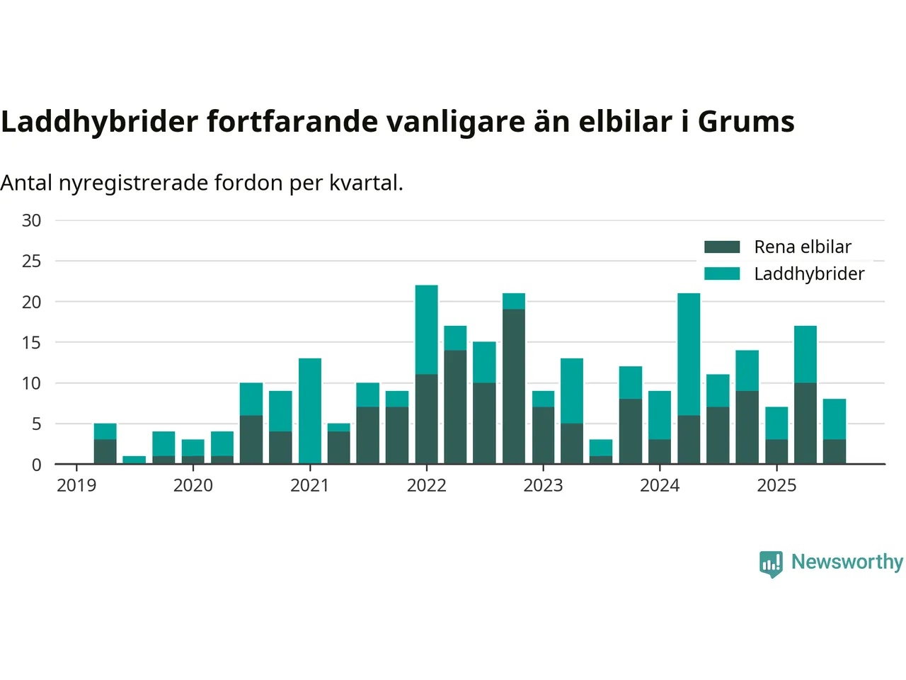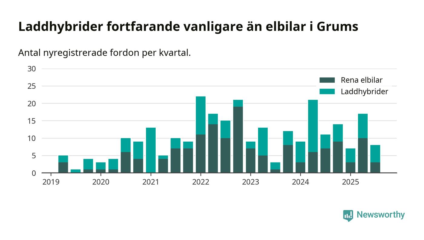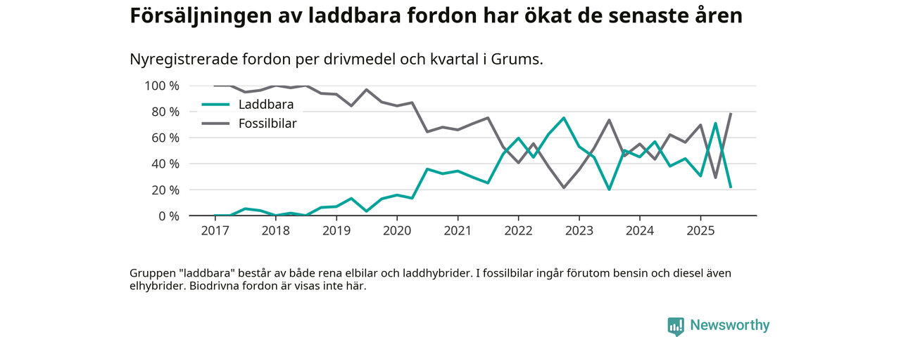 Under tredje kvartalet 2025 var 22 procent av alla nyregistrerade personbilar i Grums laddbara (sammanlagt registrerades 36 nya bilar). Merparten av de laddbara bilarna var så kallade laddhybrider, det vill säga fordon som går att ladda och köra på el, men som även har en förbränningsmotor. 8 procent av alla nya bilar var rena elbilar.