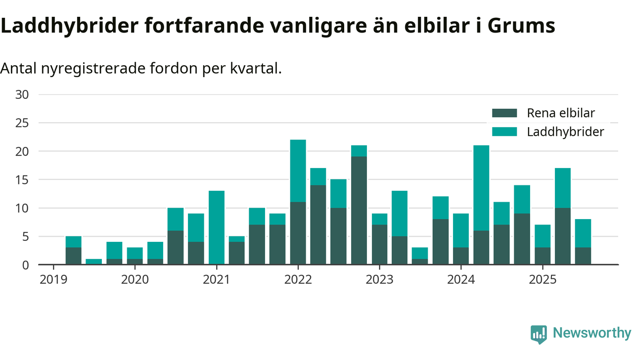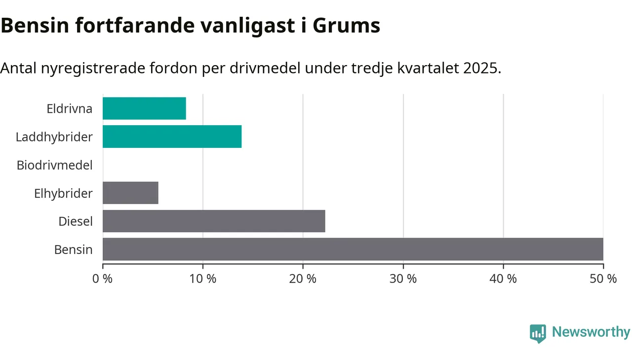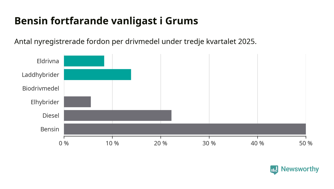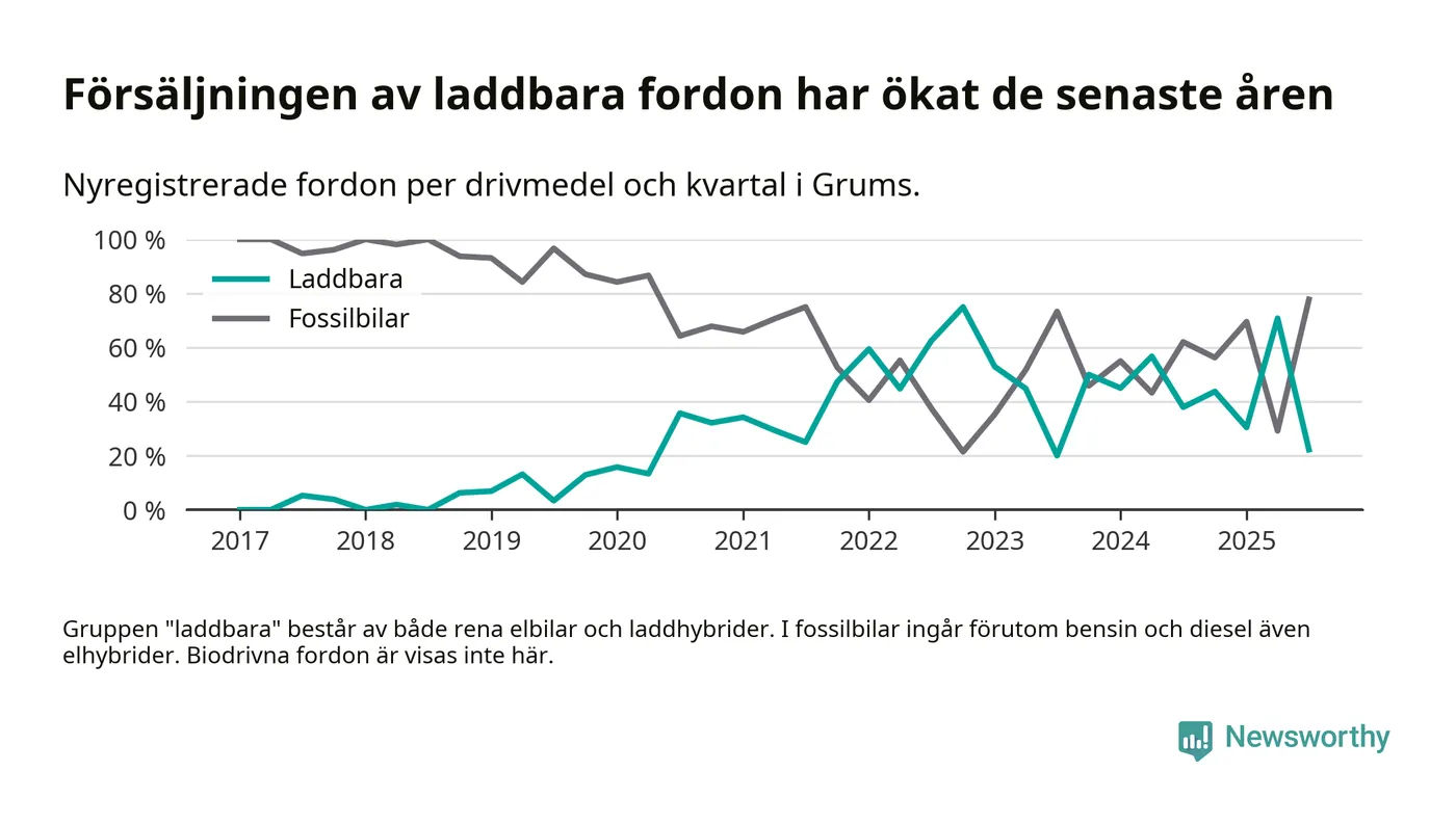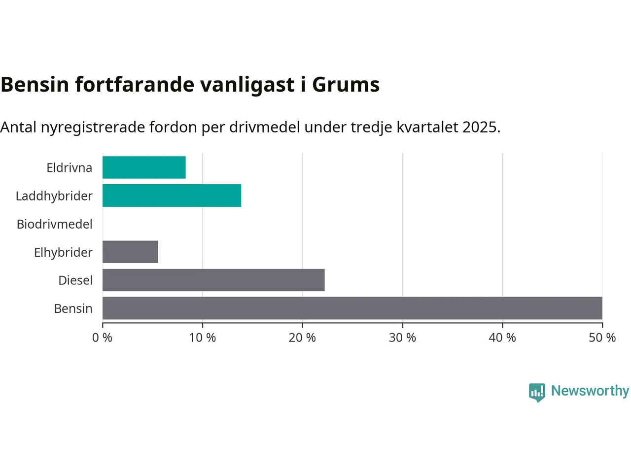 Under tredje kvartalet 2025 var 22 procent av alla nyregistrerade personbilar i Grums laddbara (sammanlagt registrerades 36 nya bilar). Merparten av de laddbara bilarna var så kallade laddhybrider, det vill säga fordon som går att ladda och köra på el, men som även har en förbränningsmotor. 8 procent av alla nya bilar var rena elbilar.