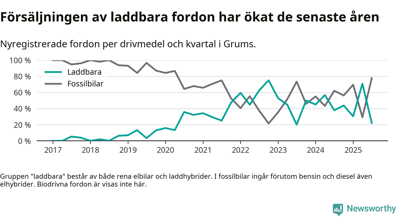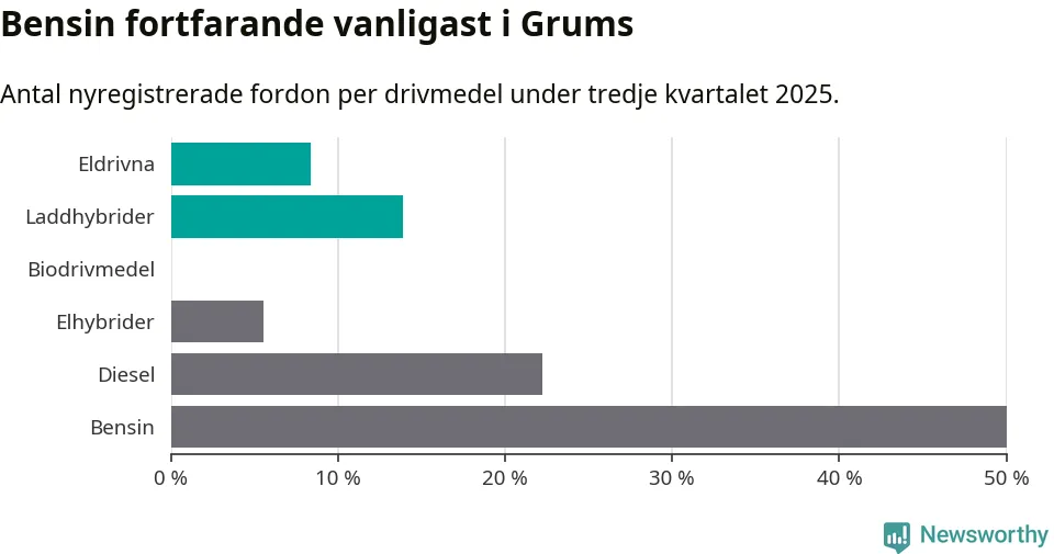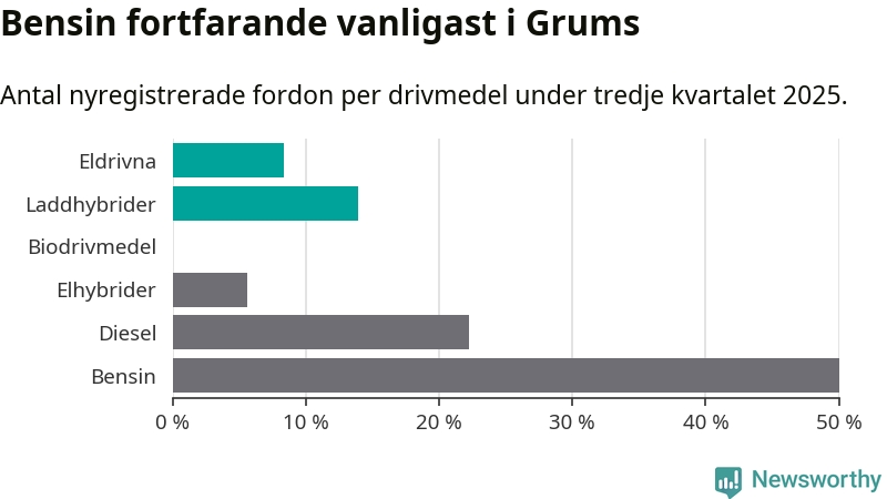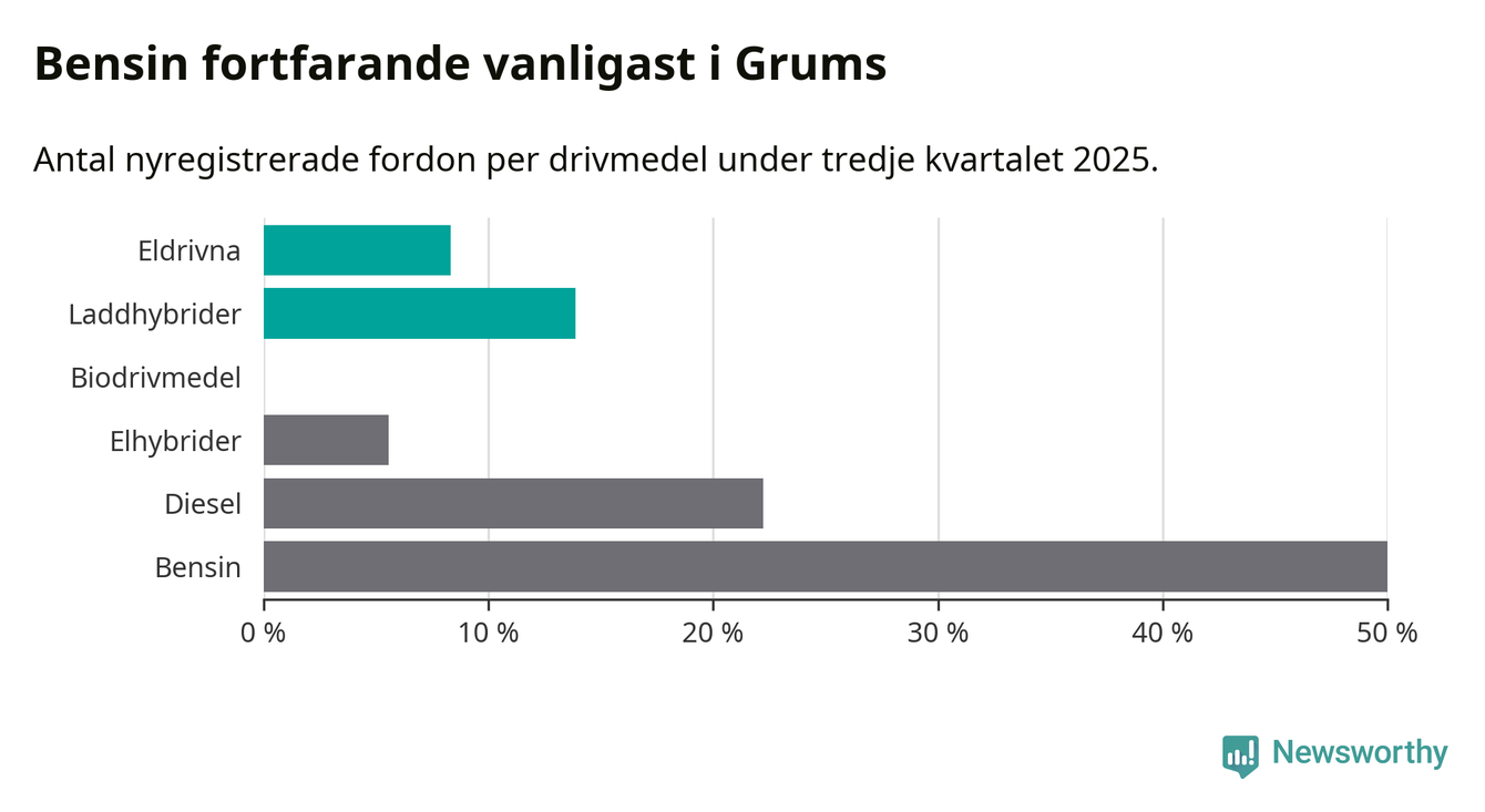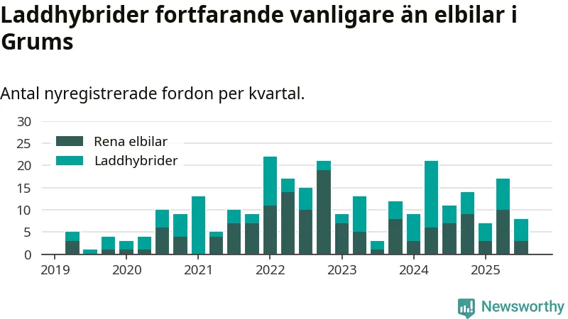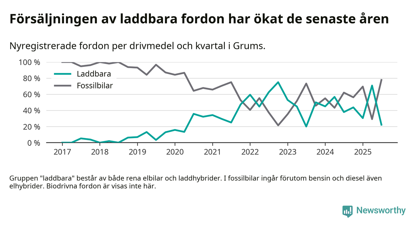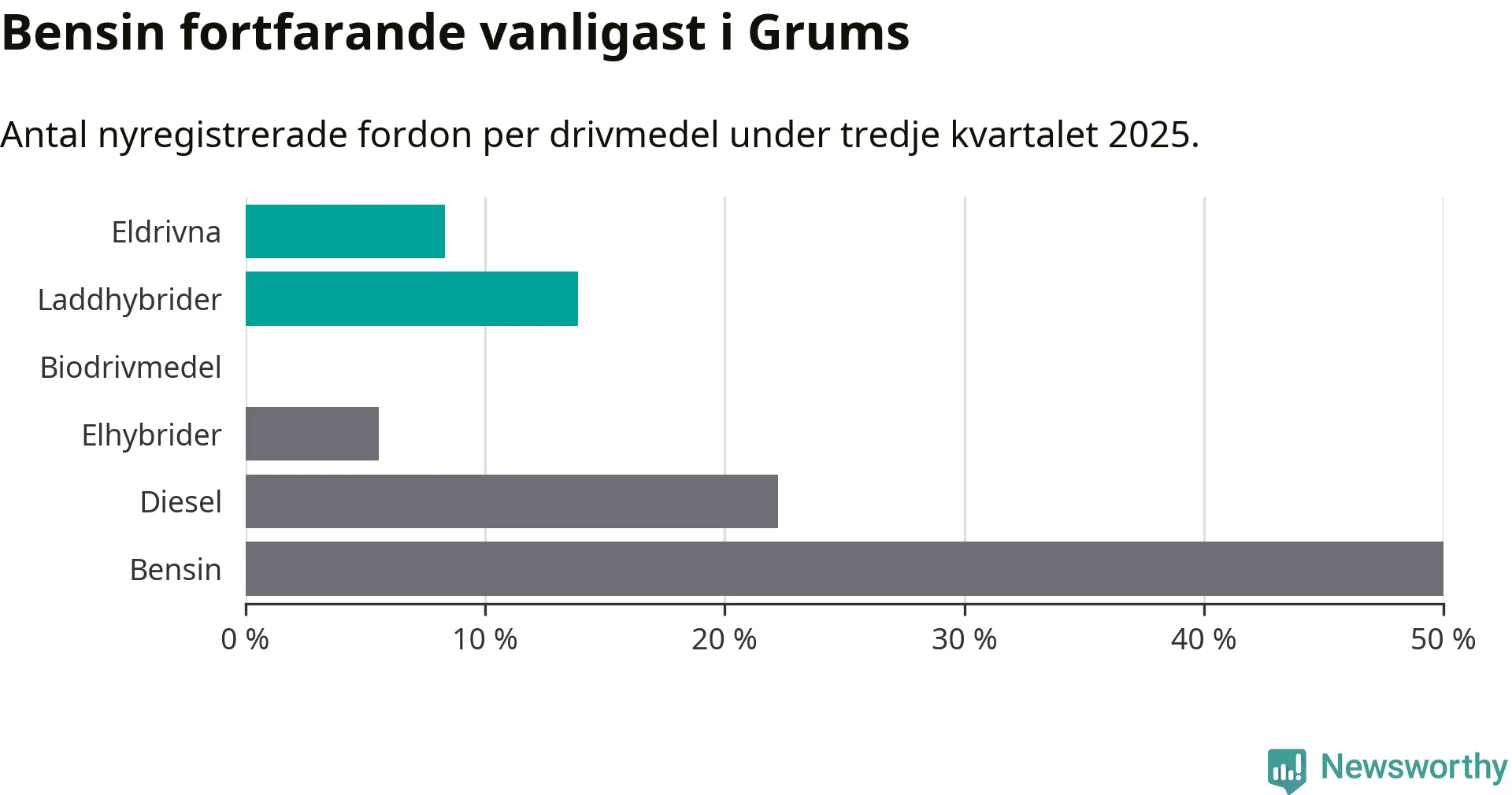 Under tredje kvartalet 2025 var 22 procent av alla nyregistrerade personbilar i Grums laddbara (sammanlagt registrerades 36 nya bilar). Merparten av de laddbara bilarna var så kallade laddhybrider, det vill säga fordon som går att ladda och köra på el, men som även har en förbränningsmotor. 8 procent av alla nya bilar var rena elbilar.