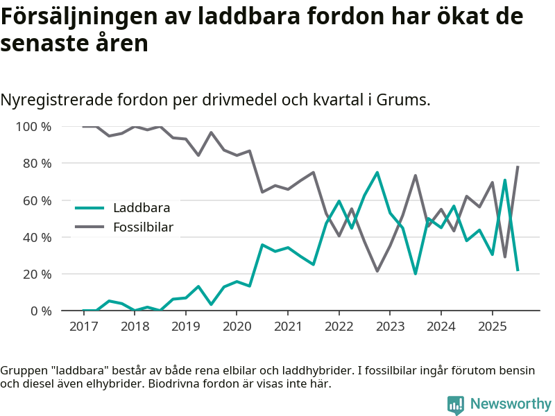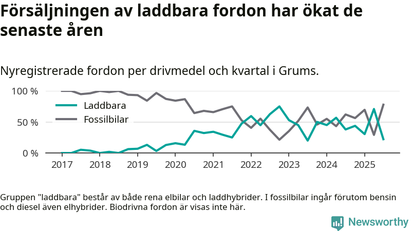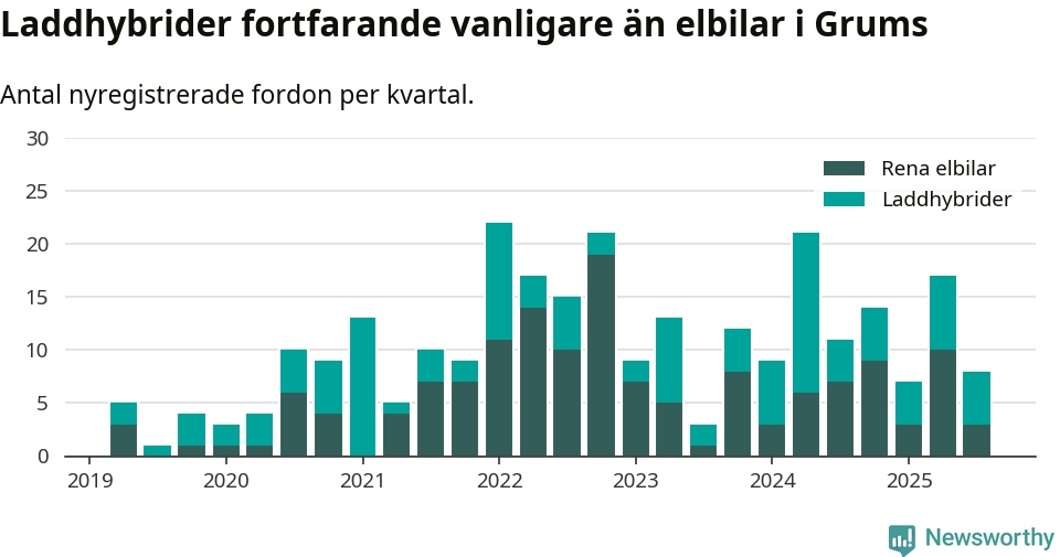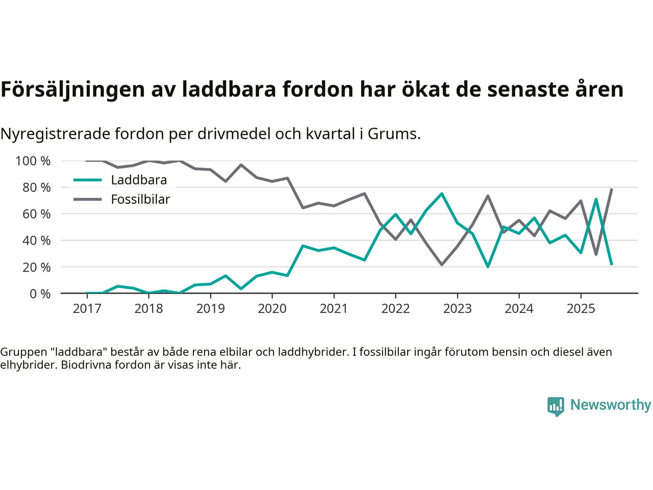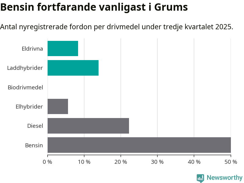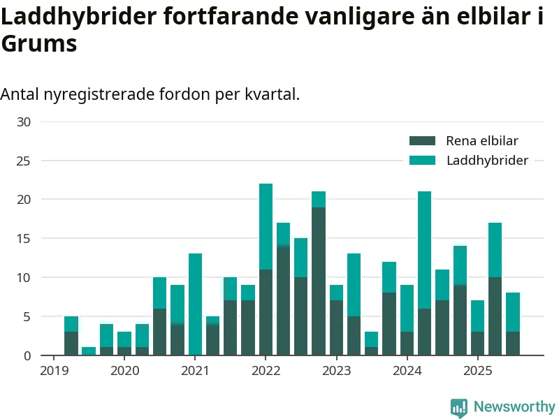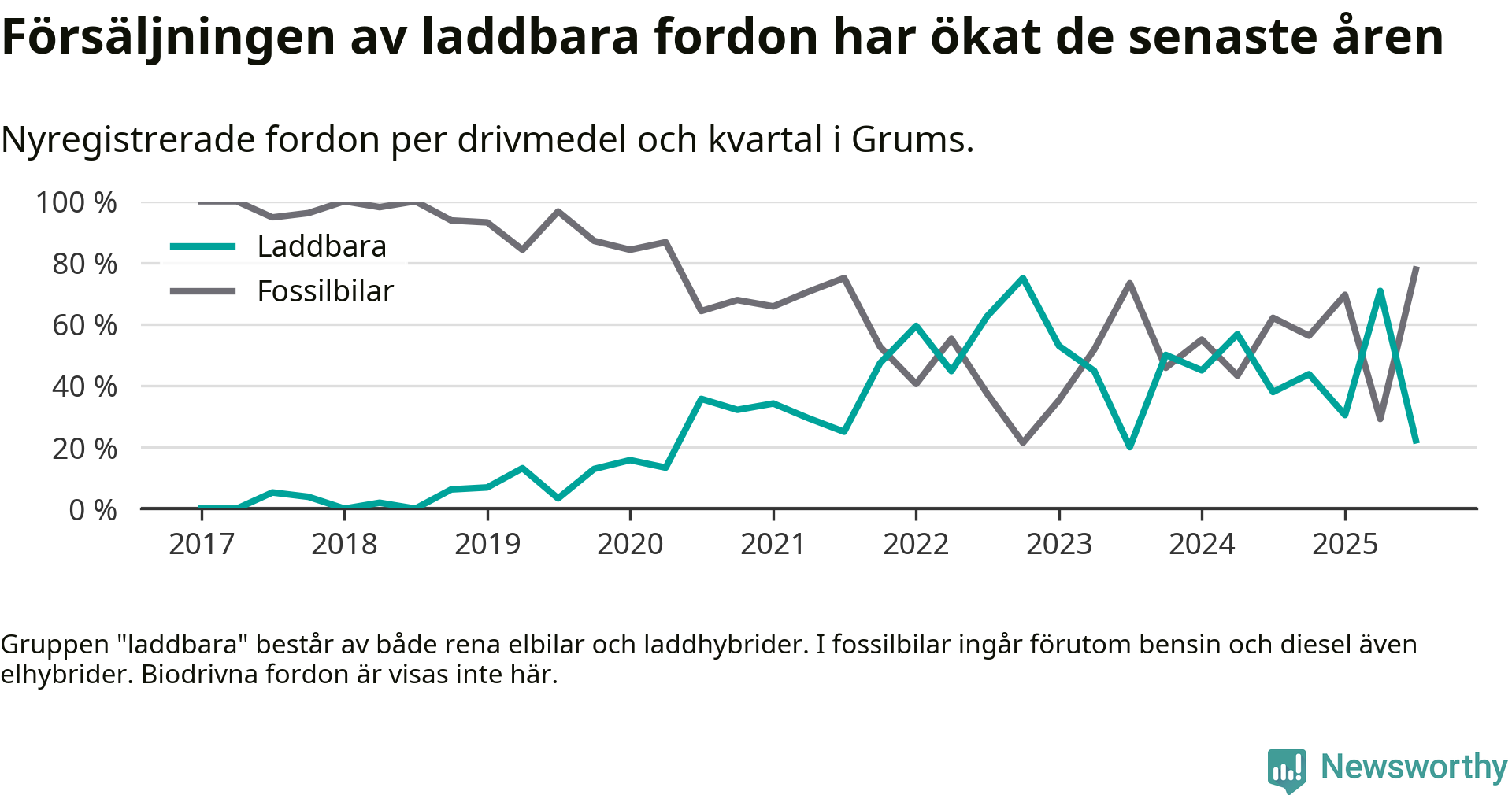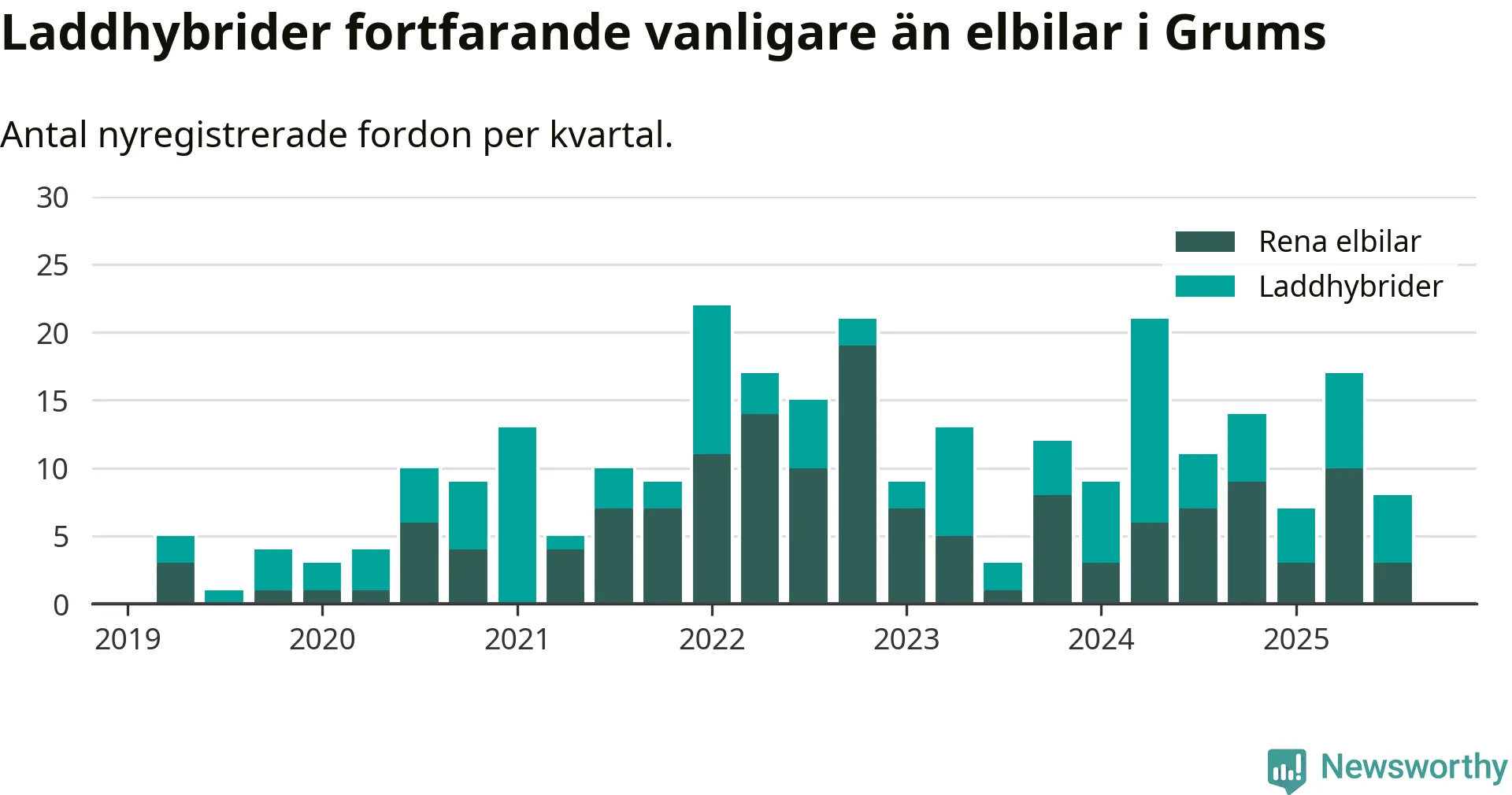 Under tredje kvartalet 2025 var 22 procent av alla nyregistrerade personbilar i Grums laddbara (sammanlagt registrerades 36 nya bilar). Merparten av de laddbara bilarna var så kallade laddhybrider, det vill säga fordon som går att ladda och köra på el, men som även har en förbränningsmotor. 8 procent av alla nya bilar var rena elbilar.