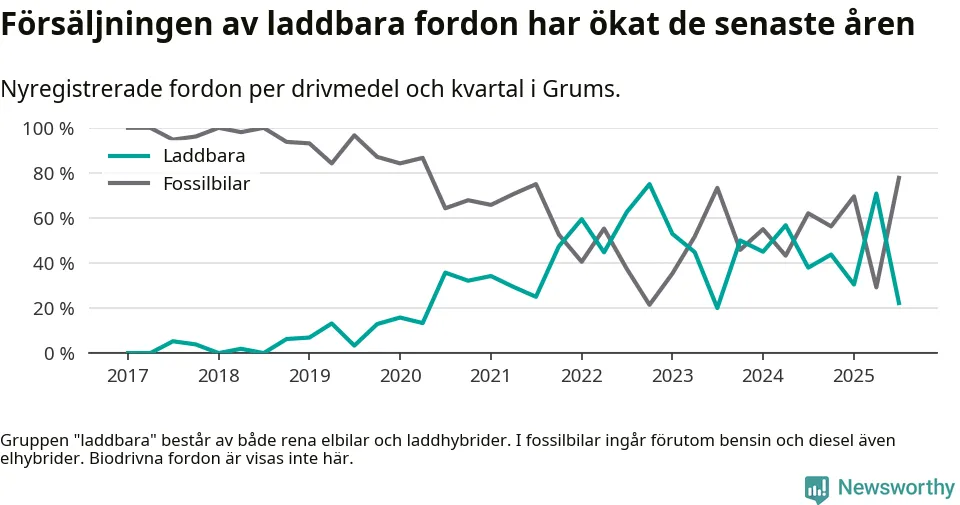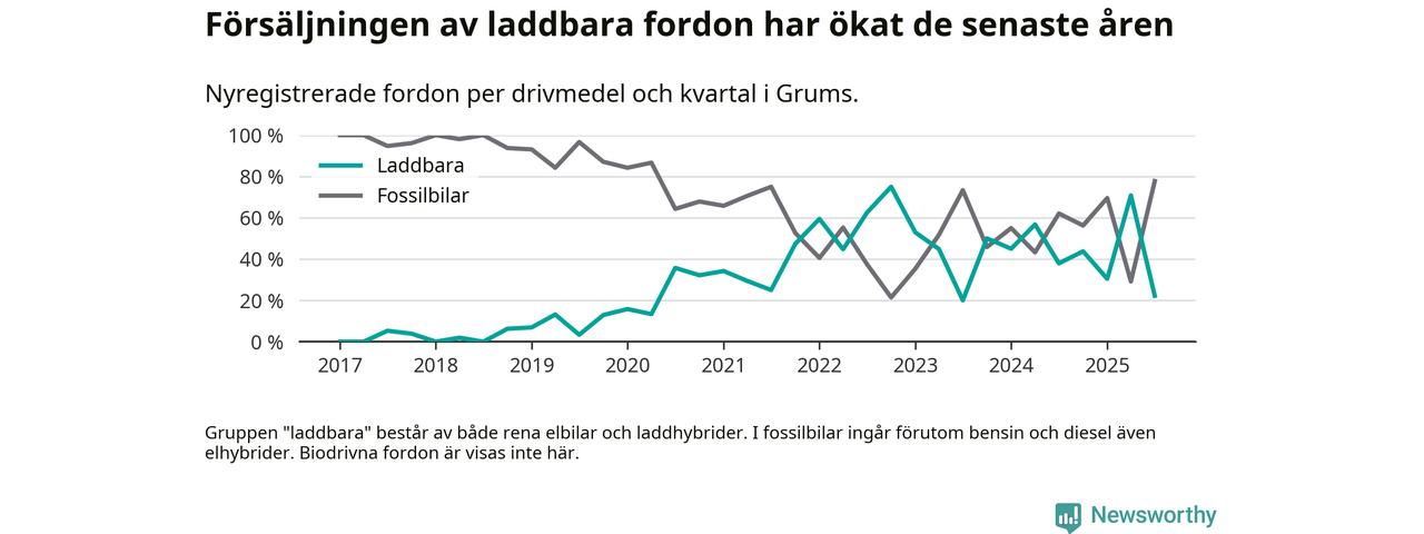 I Grums minskade andelen laddbara bilar under tredje kvartalet jämfört med kvartalet innan. Nyregistreringen peakade under fjärde kvartalet 2022 då 75 procent av de nya bilarna var laddbara.