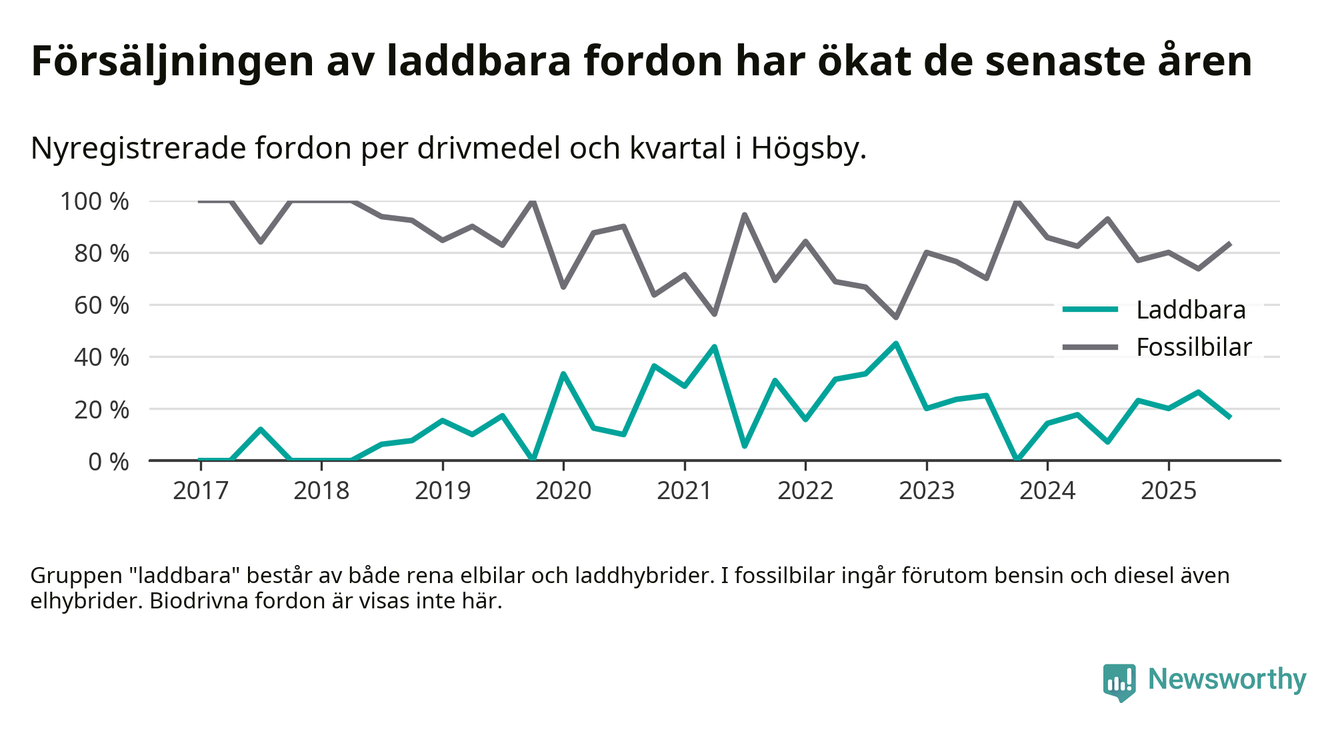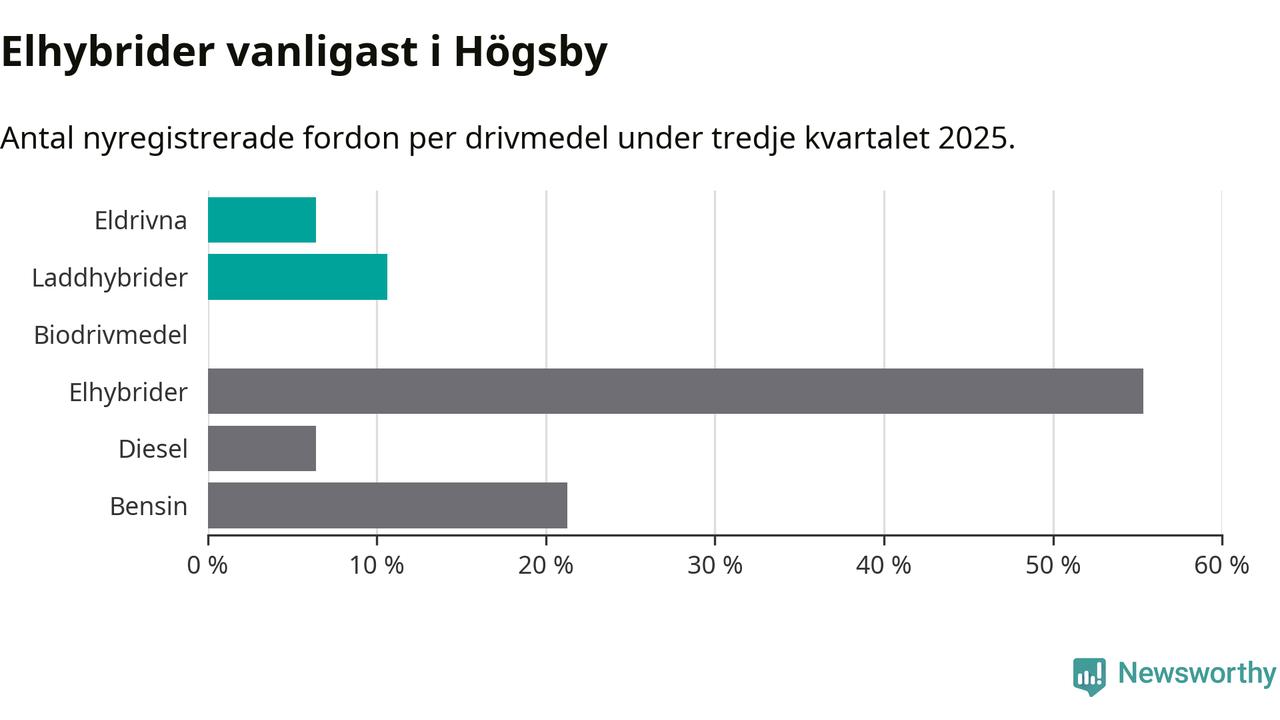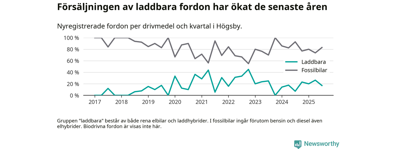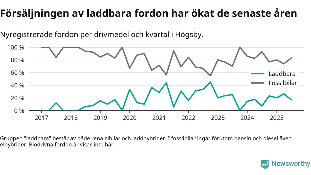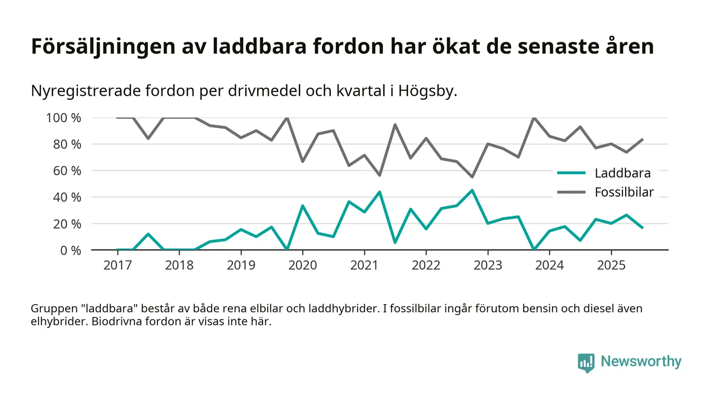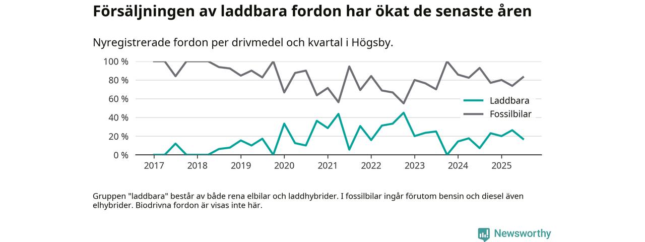 Under tredje kvartalet 2025 var 17 procent av alla nyregistrerade personbilar i Högsby laddbara (sammanlagt registrerades 47 nya bilar). Merparten av de laddbara bilarna var så kallade laddhybrider, det vill säga fordon som går att ladda och köra på el, men som även har en förbränningsmotor. 6 procent av alla nya bilar var rena elbilar.