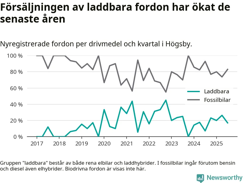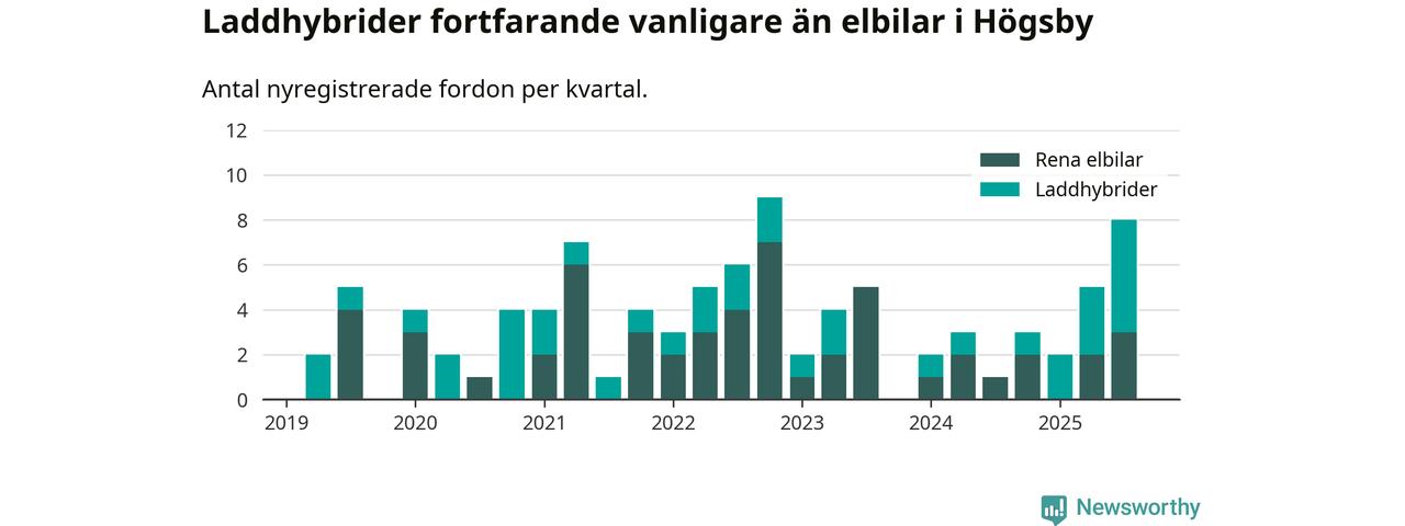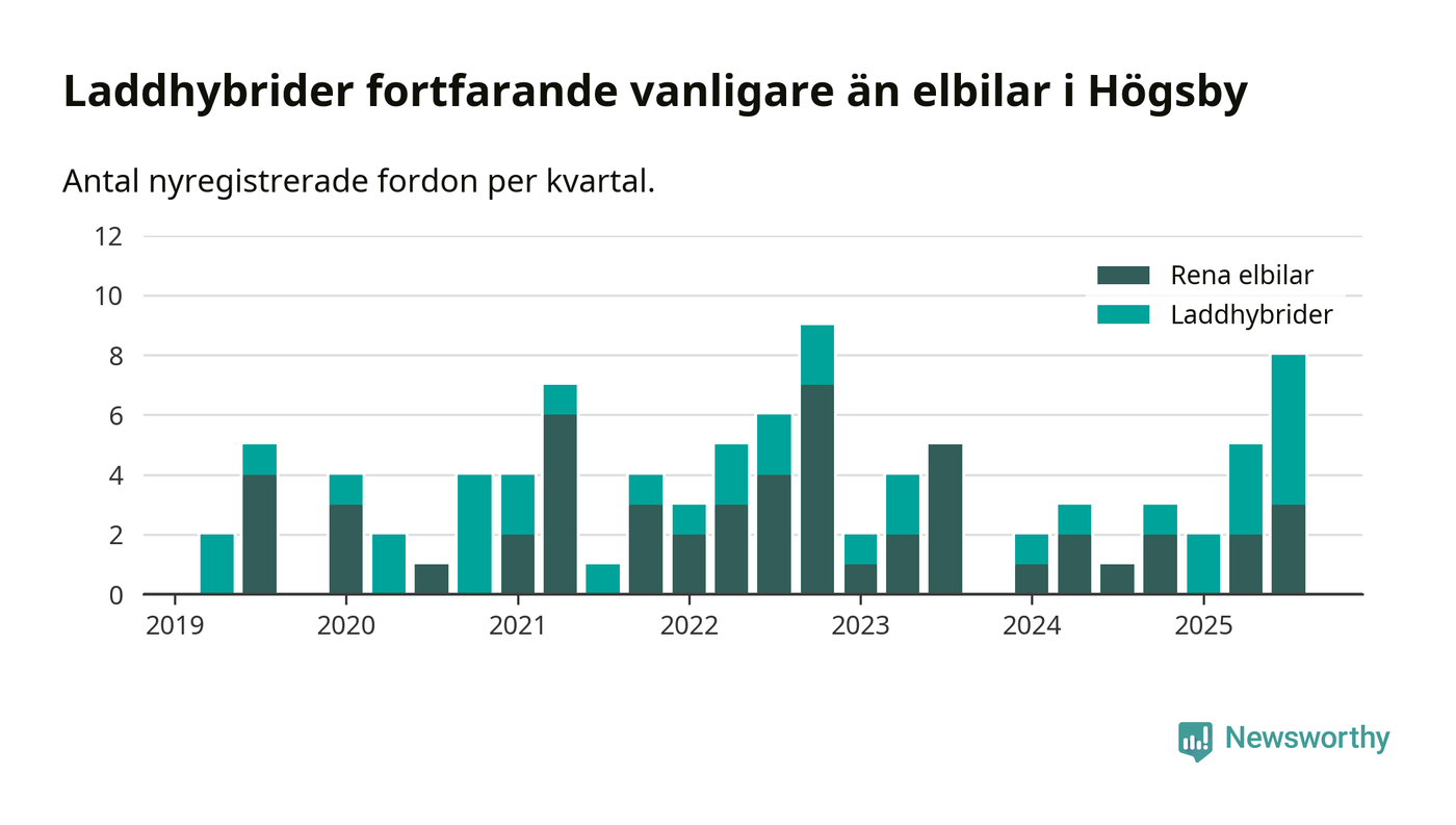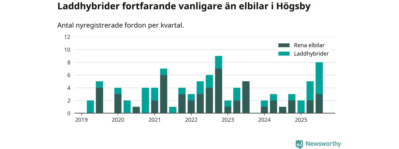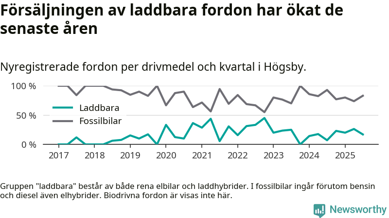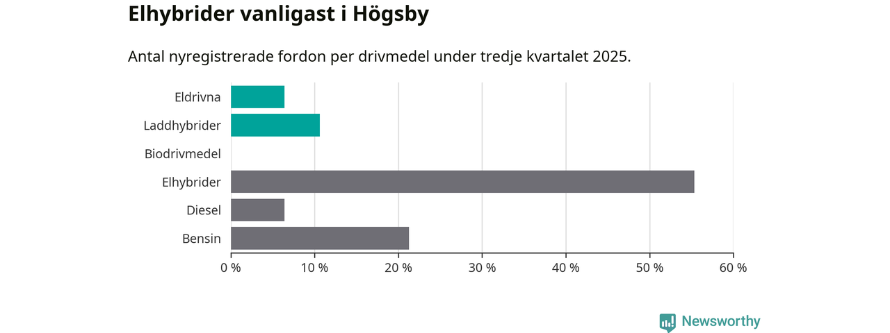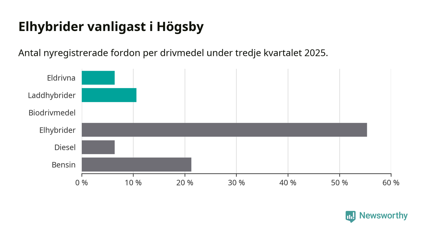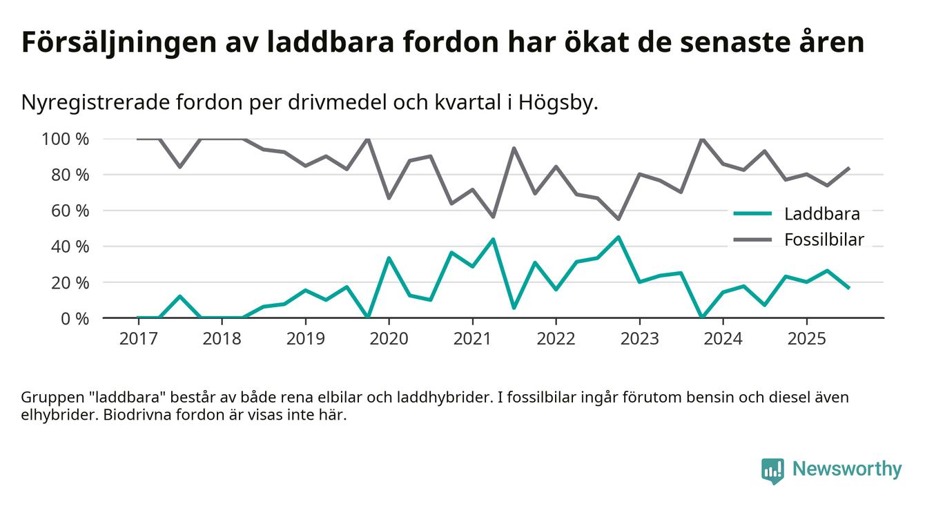 Under tredje kvartalet 2025 var 17 procent av alla nyregistrerade personbilar i Högsby laddbara (sammanlagt registrerades 47 nya bilar). Merparten av de laddbara bilarna var så kallade laddhybrider, det vill säga fordon som går att ladda och köra på el, men som även har en förbränningsmotor. 6 procent av alla nya bilar var rena elbilar.