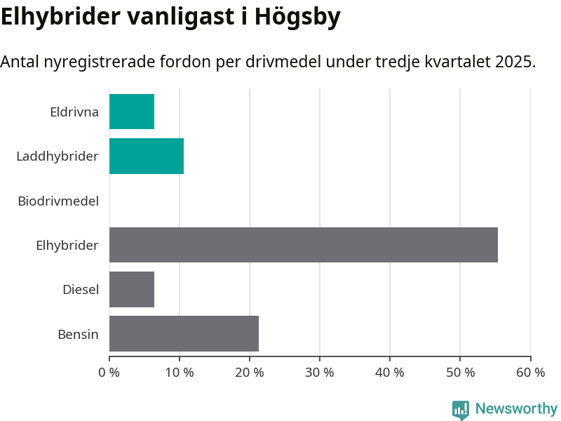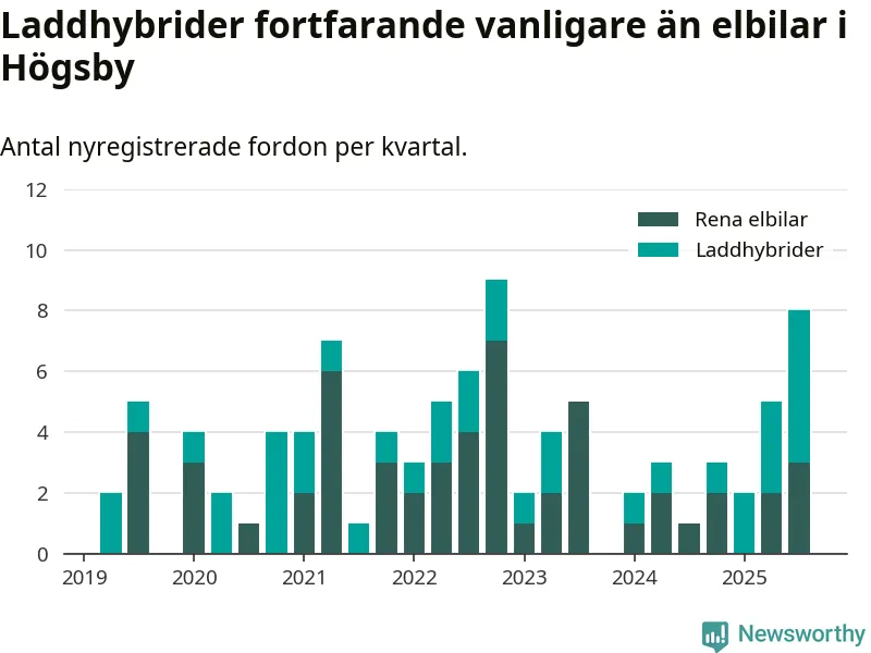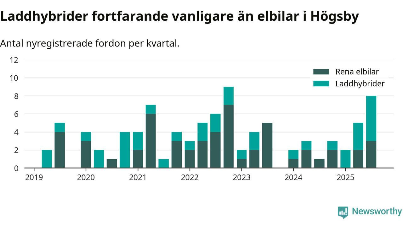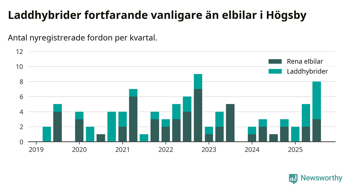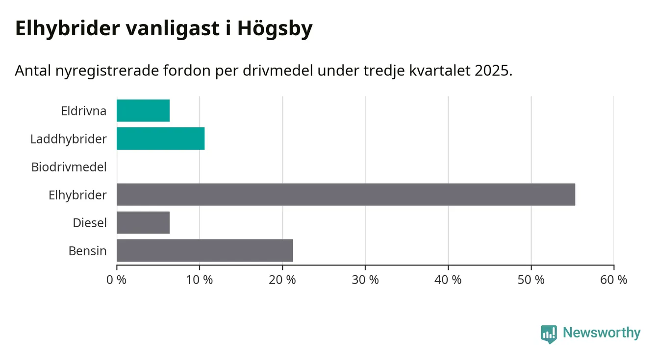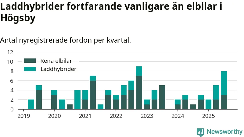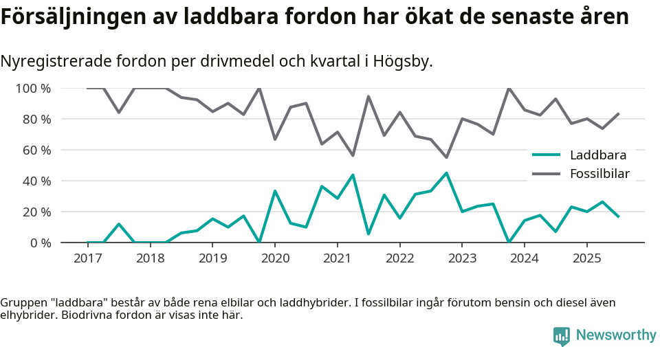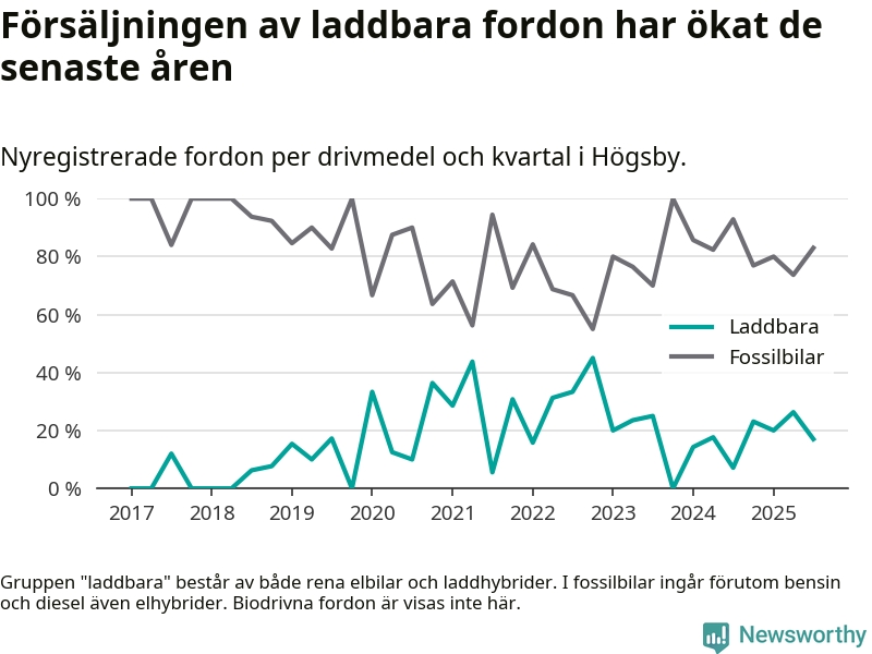 Under tredje kvartalet 2025 var 17 procent av alla nyregistrerade personbilar i Högsby laddbara (sammanlagt registrerades 47 nya bilar). Merparten av de laddbara bilarna var så kallade laddhybrider, det vill säga fordon som går att ladda och köra på el, men som även har en förbränningsmotor. 6 procent av alla nya bilar var rena elbilar.