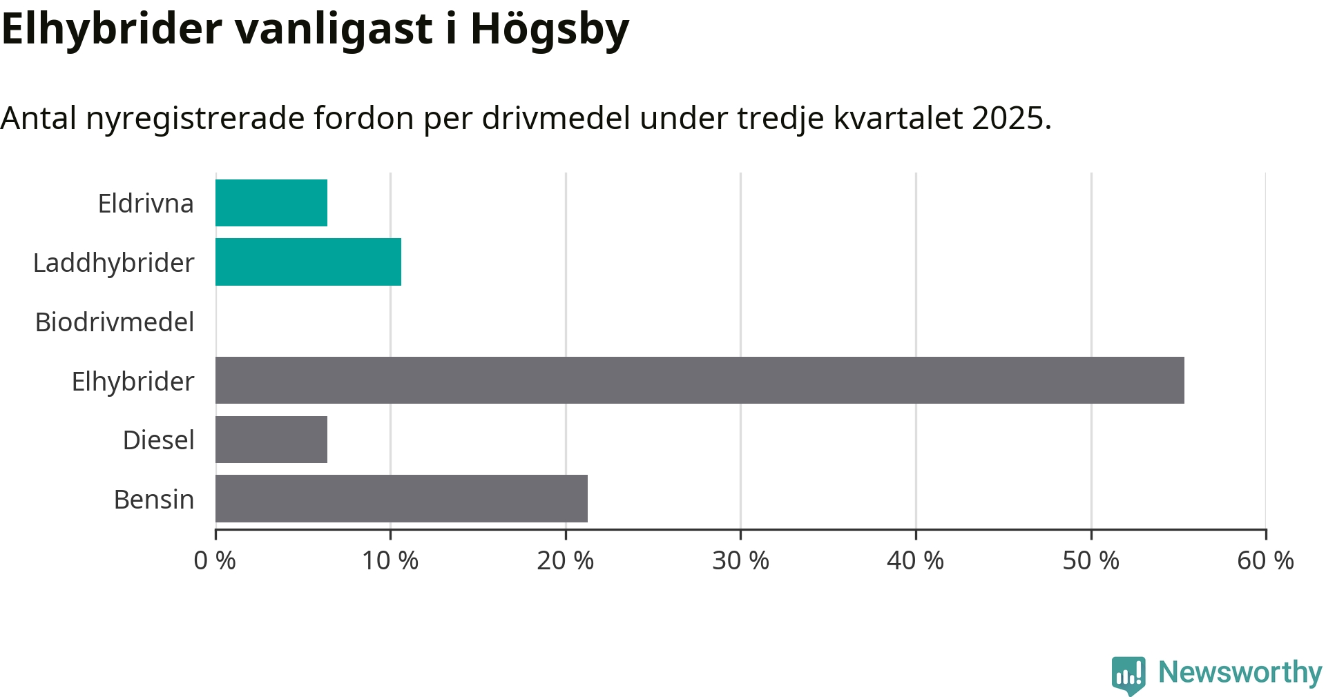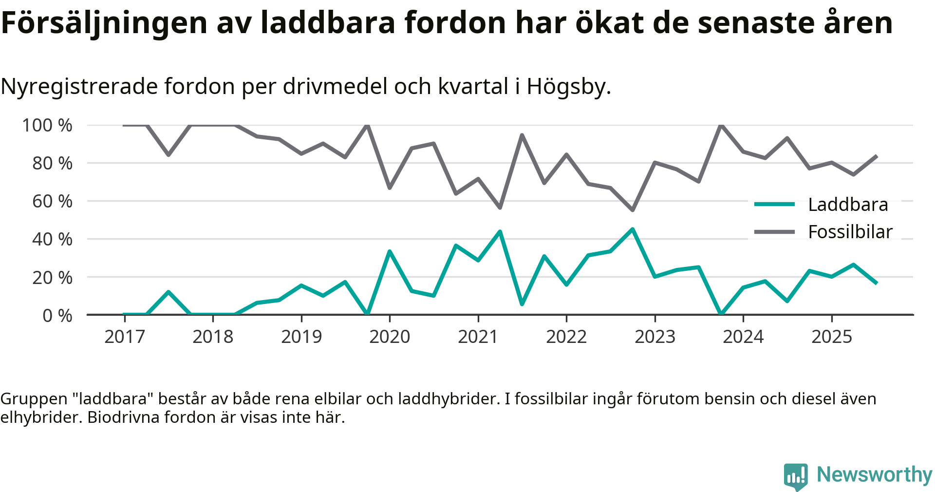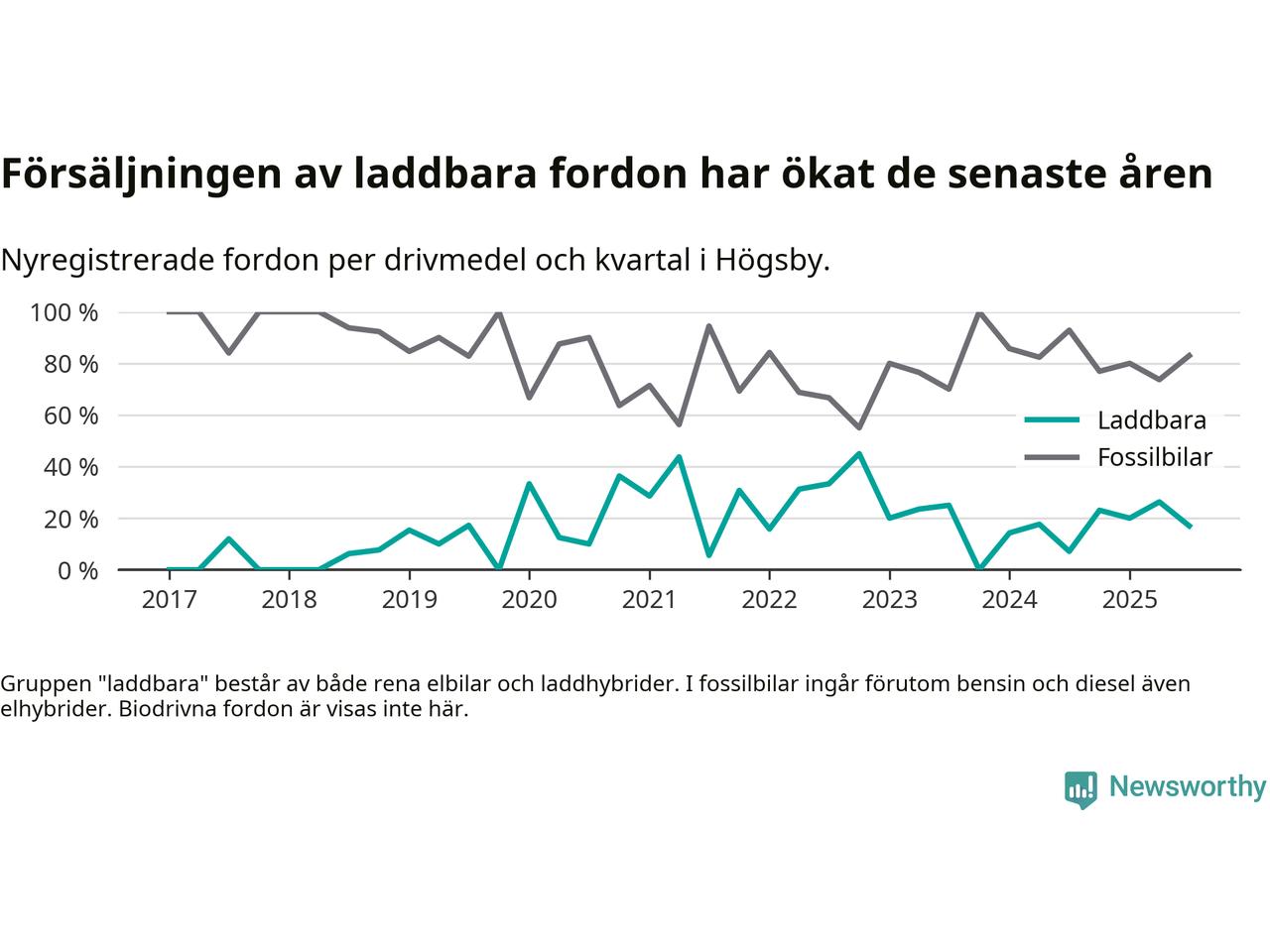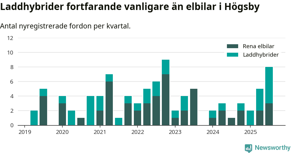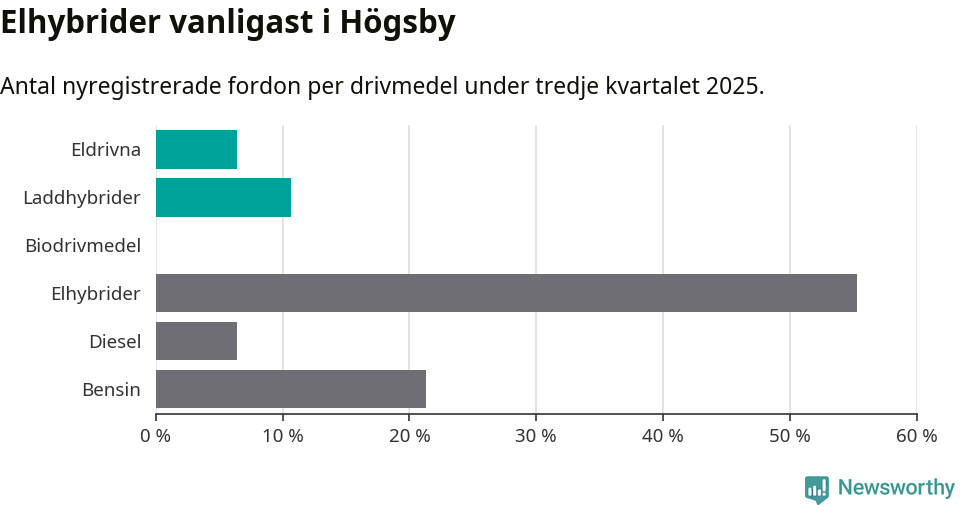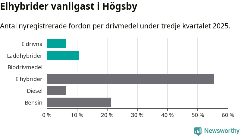 Under tredje kvartalet 2025 var 17 procent av alla nyregistrerade personbilar i Högsby laddbara (sammanlagt registrerades 47 nya bilar). Merparten av de laddbara bilarna var så kallade laddhybrider, det vill säga fordon som går att ladda och köra på el, men som även har en förbränningsmotor. 6 procent av alla nya bilar var rena elbilar.