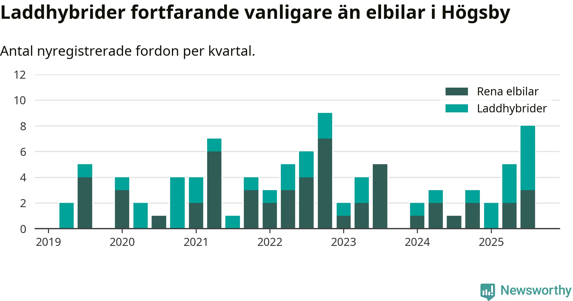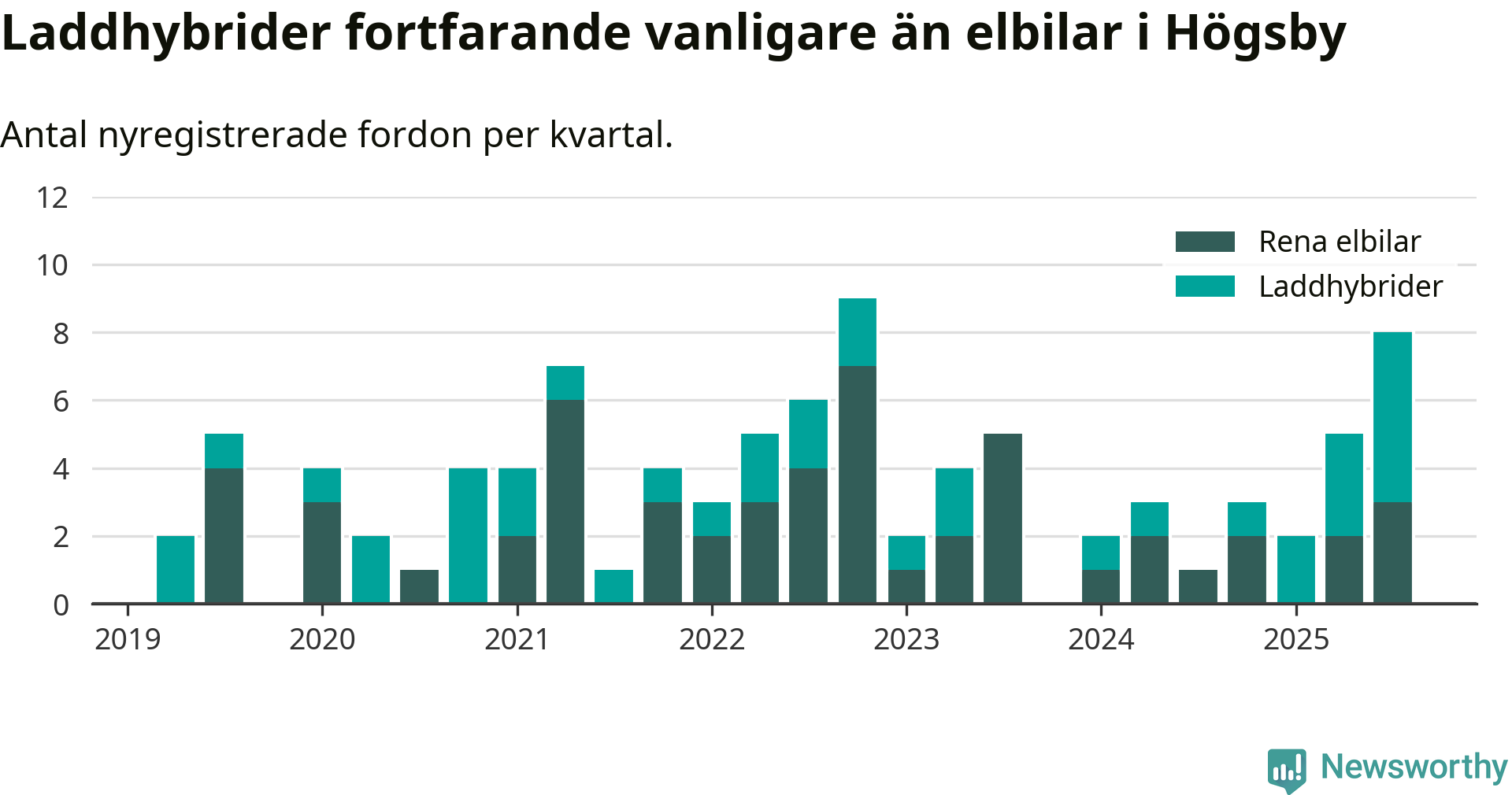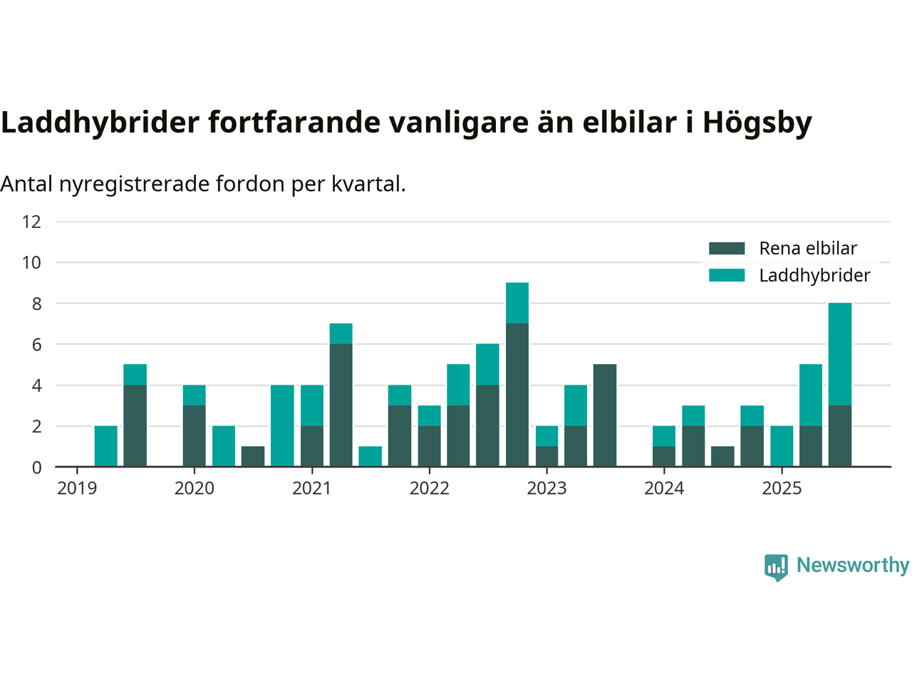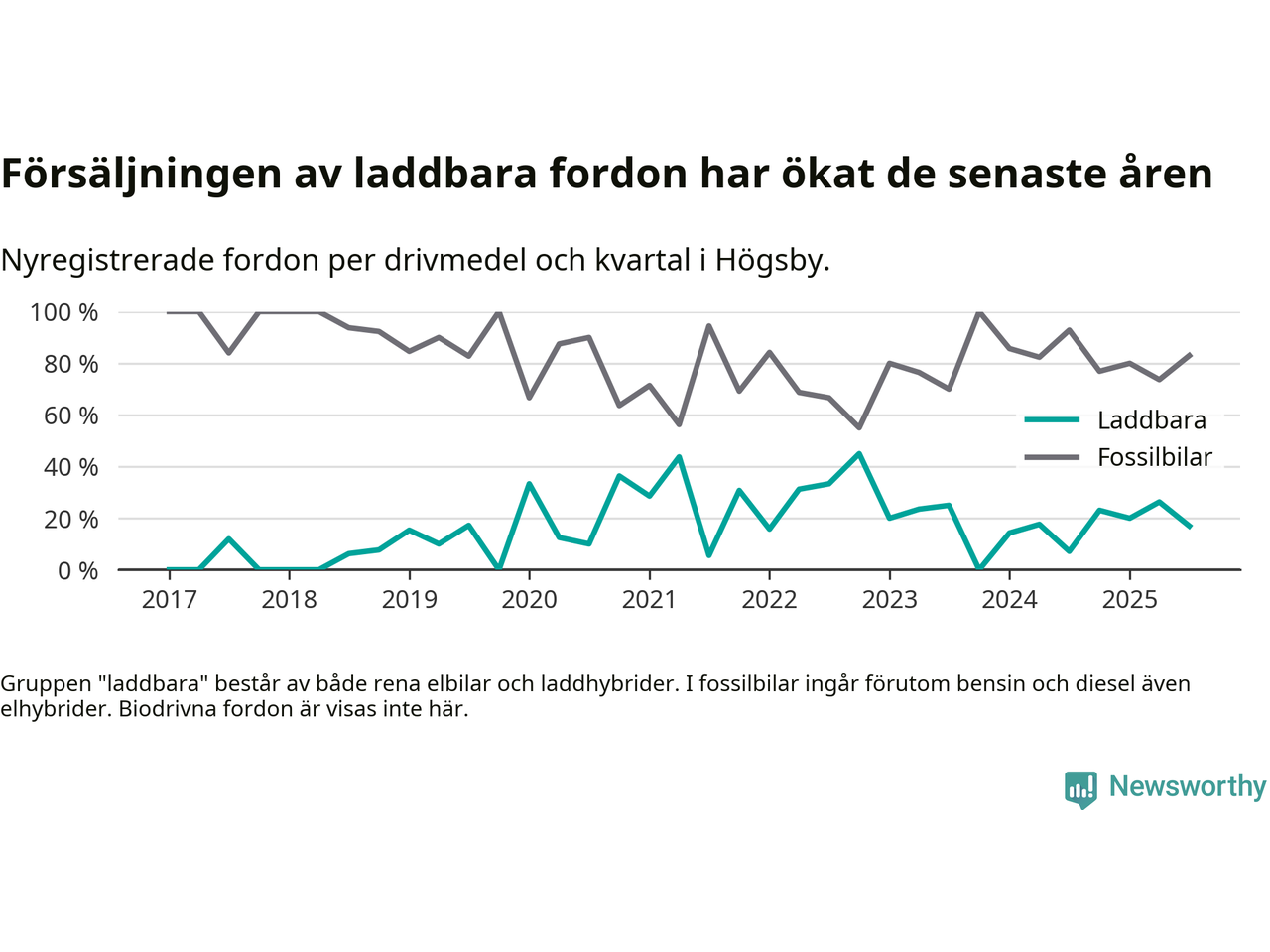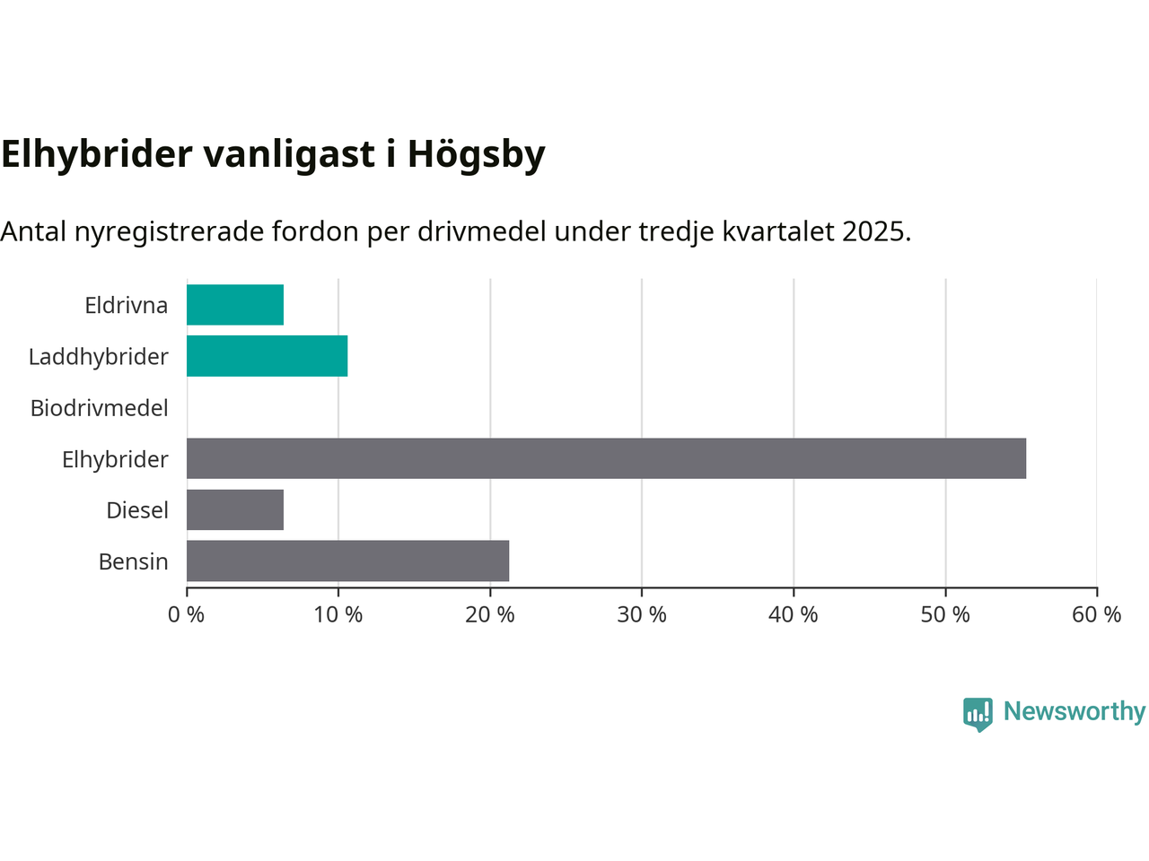 Under tredje kvartalet 2025 var 17 procent av alla nyregistrerade personbilar i Högsby laddbara (sammanlagt registrerades 47 nya bilar). Merparten av de laddbara bilarna var så kallade laddhybrider, det vill säga fordon som går att ladda och köra på el, men som även har en förbränningsmotor. 6 procent av alla nya bilar var rena elbilar.