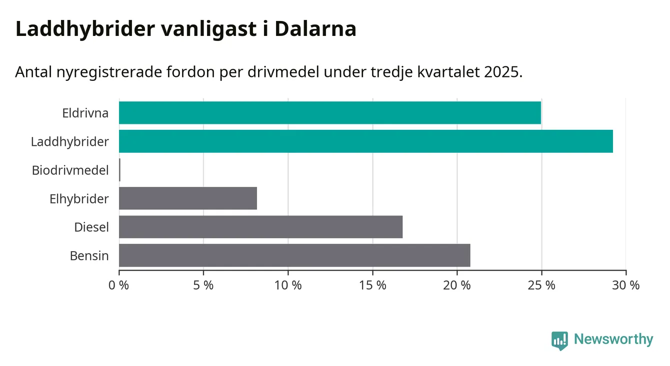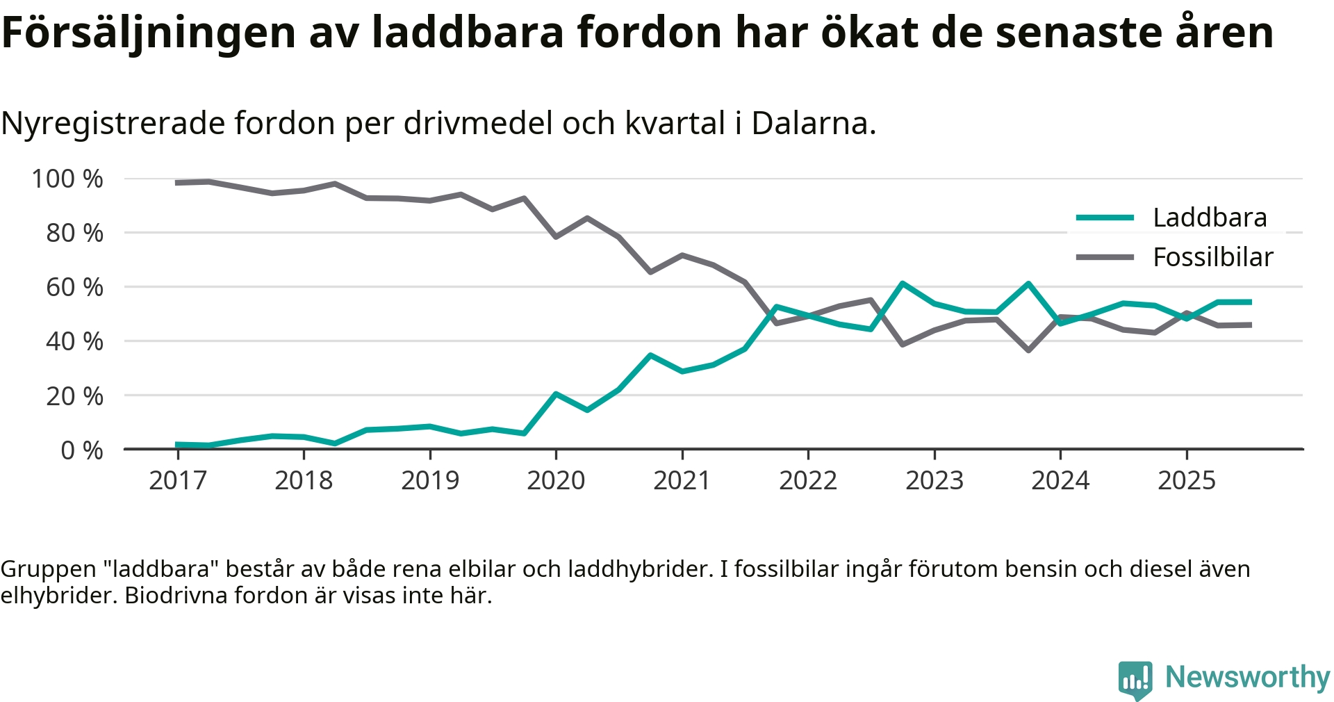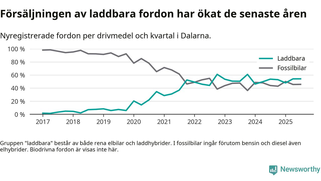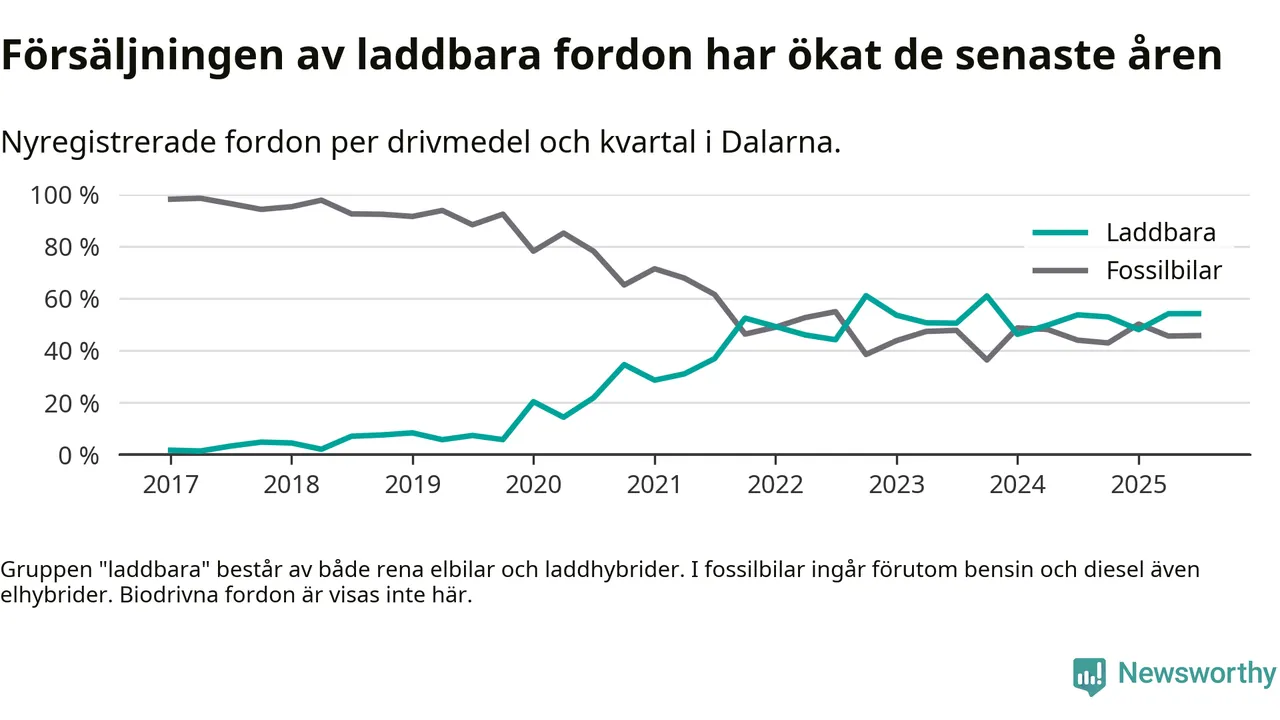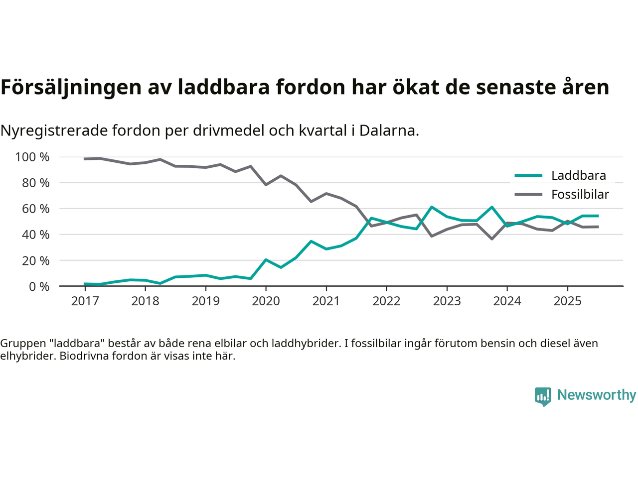 Under tredje kvartalet 2025 var 54 procent av alla nyregistrerade personbilar i Dalarna laddbara (sammanlagt registrerades 1 126 nya bilar). Merparten av de laddbara bilarna var så kallade laddhybrider, det vill säga fordon som går att ladda och köra på el, men som även har en förbränningsmotor. 25 procent av alla nya bilar var rena elbilar.