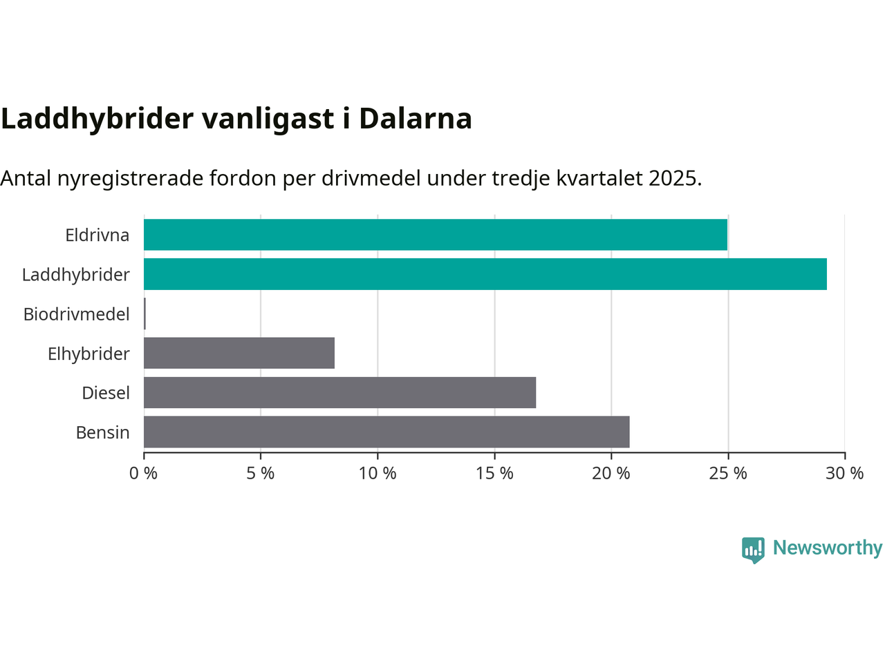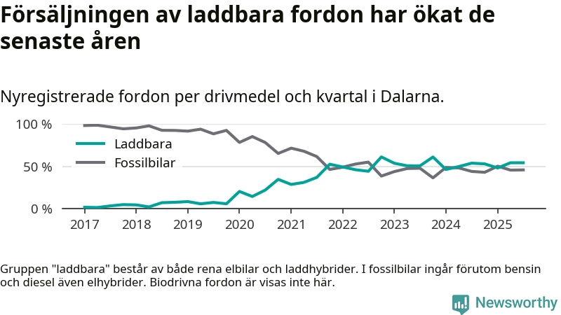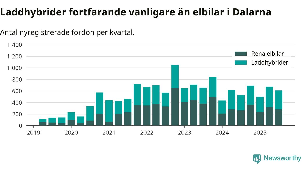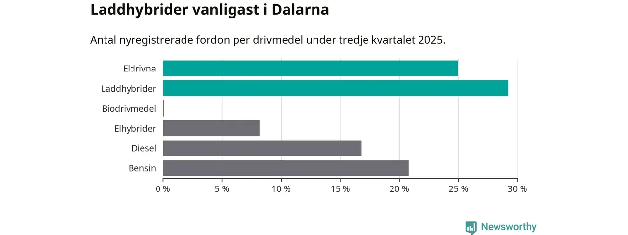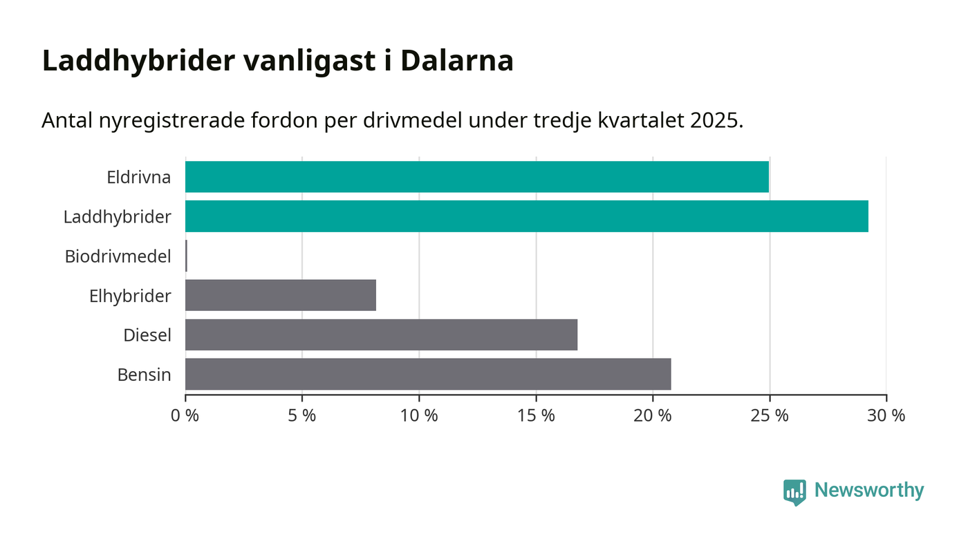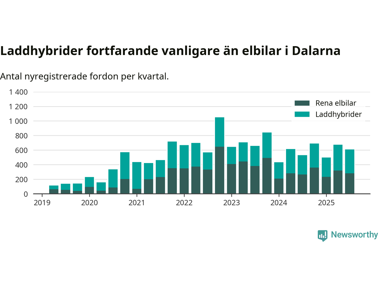 Under tredje kvartalet 2025 var 54 procent av alla nyregistrerade personbilar i Dalarna laddbara (sammanlagt registrerades 1 126 nya bilar). Merparten av de laddbara bilarna var så kallade laddhybrider, det vill säga fordon som går att ladda och köra på el, men som även har en förbränningsmotor. 25 procent av alla nya bilar var rena elbilar.