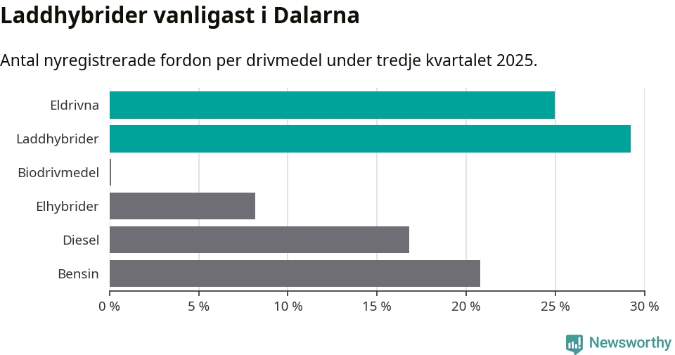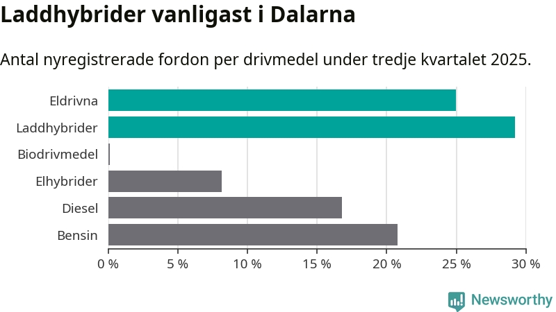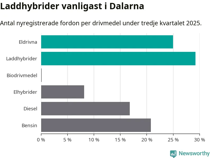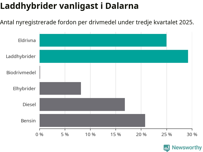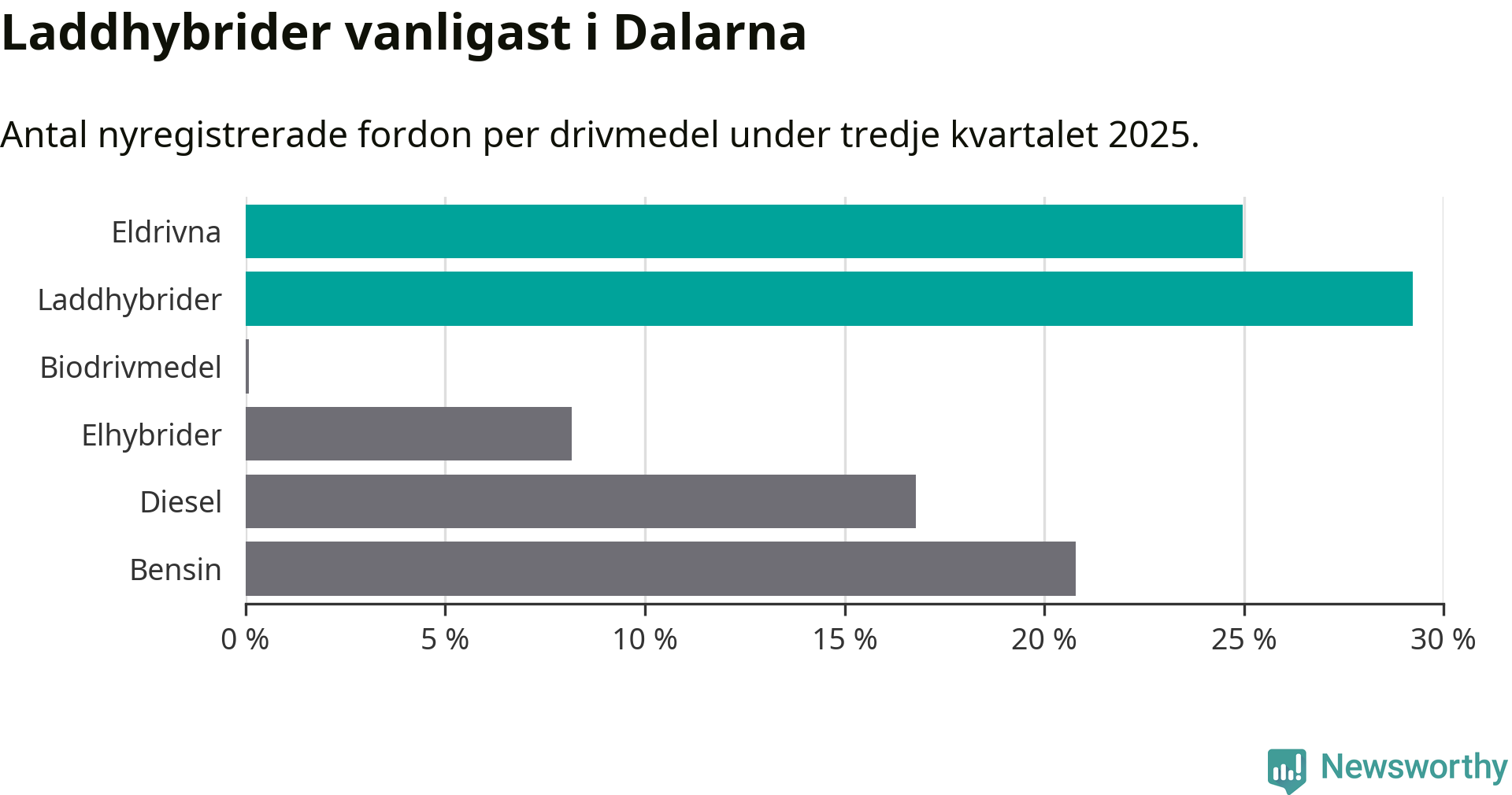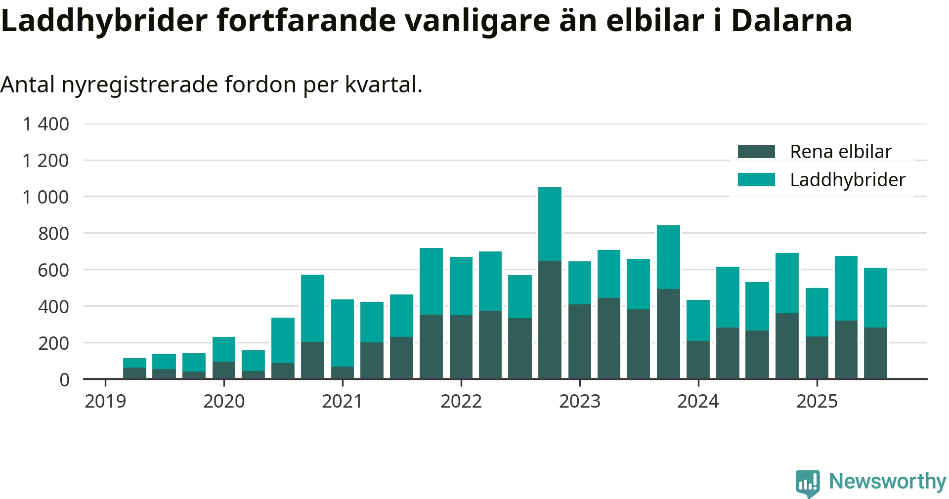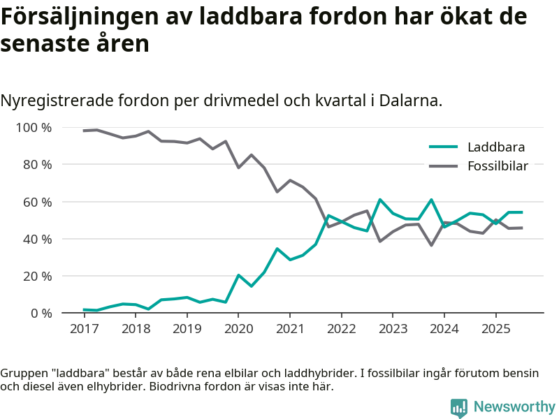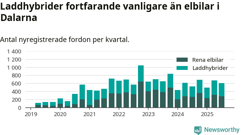 Under tredje kvartalet 2025 var 54 procent av alla nyregistrerade personbilar i Dalarna laddbara (sammanlagt registrerades 1 126 nya bilar). Merparten av de laddbara bilarna var så kallade laddhybrider, det vill säga fordon som går att ladda och köra på el, men som även har en förbränningsmotor. 25 procent av alla nya bilar var rena elbilar.