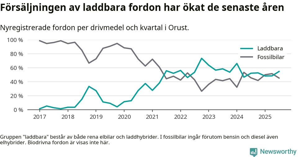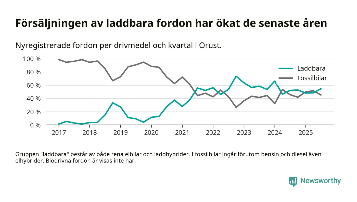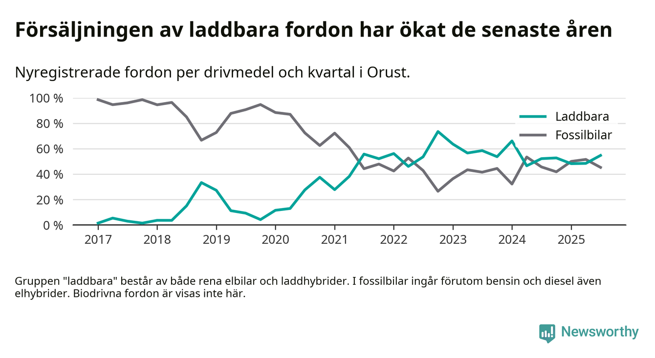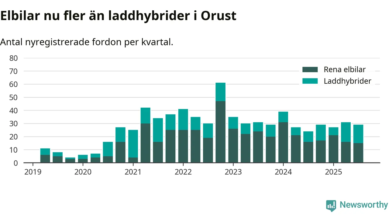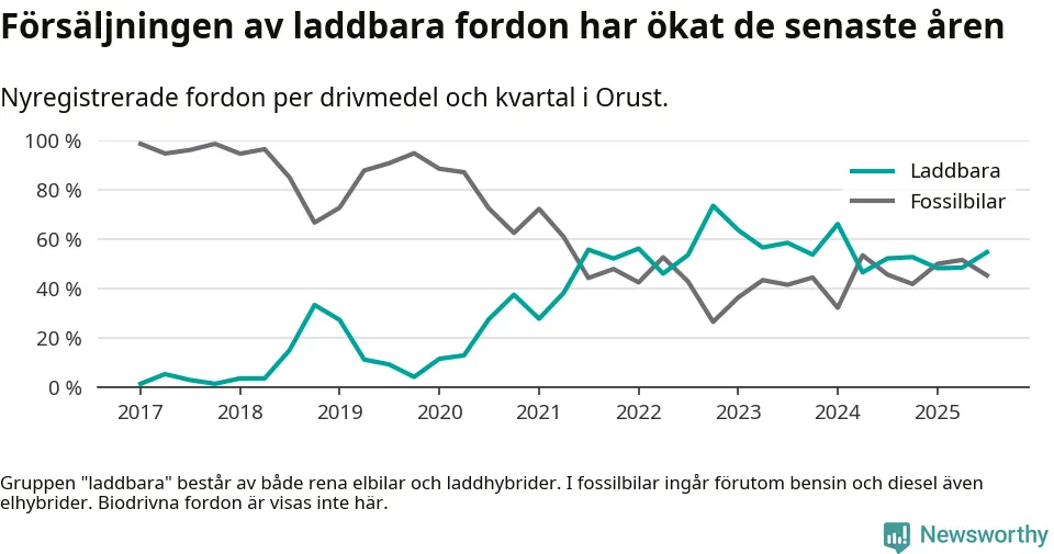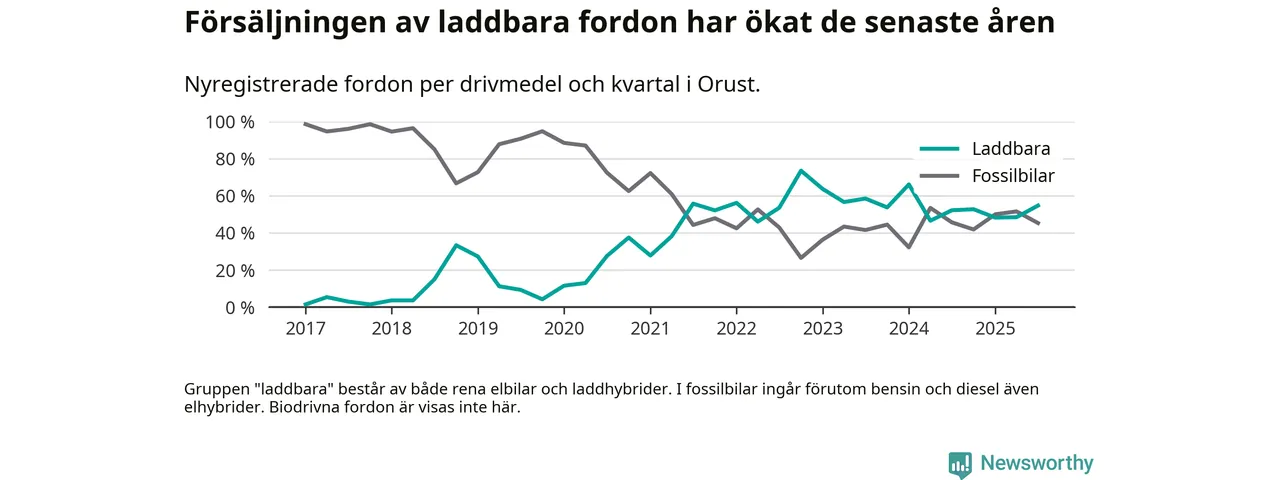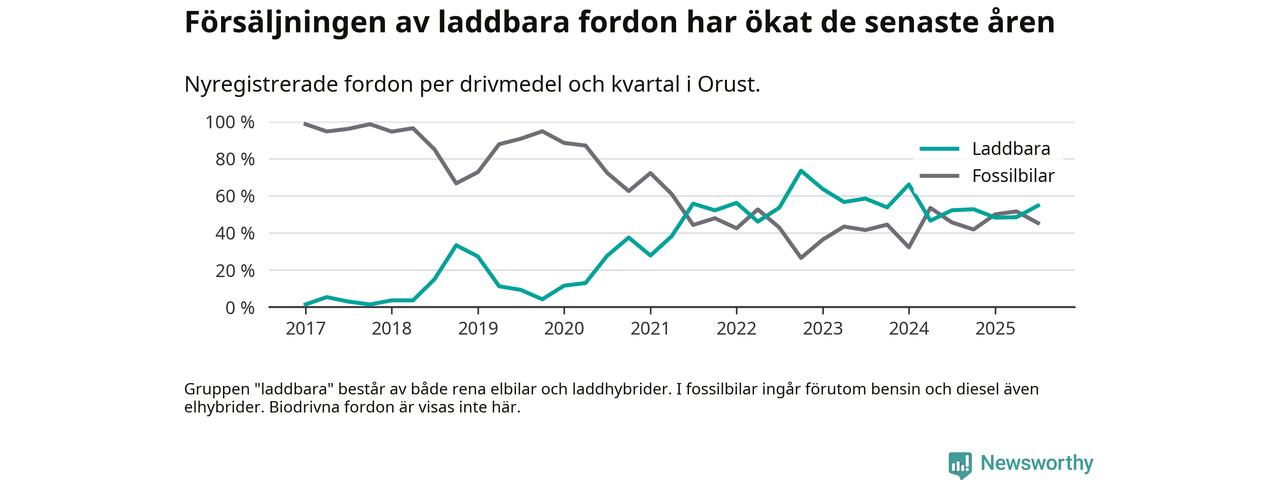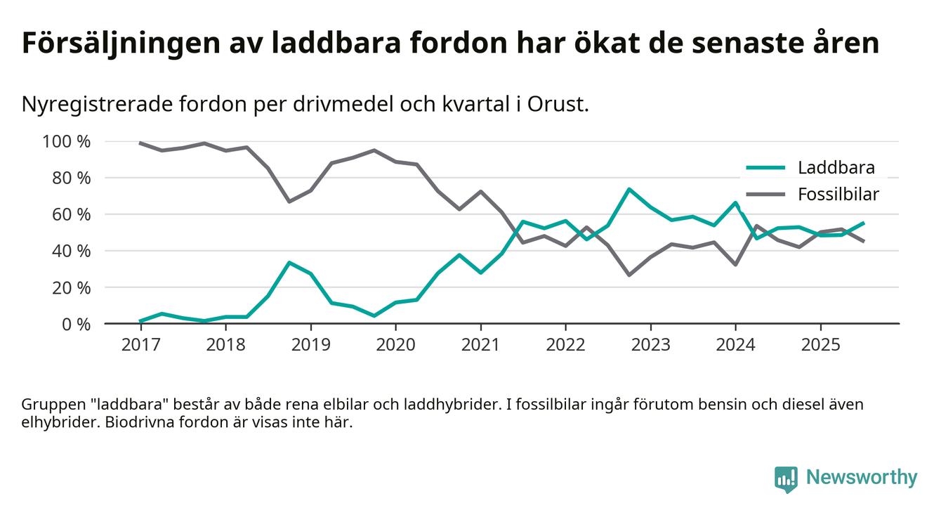 Under tredje kvartalet 2025 var 55 procent av alla nyregistrerade personbilar på Orust laddbara (sammanlagt registrerades 53 nya bilar). Merparten av de laddbara bilarna var rena elbilar (28 procent av alla).