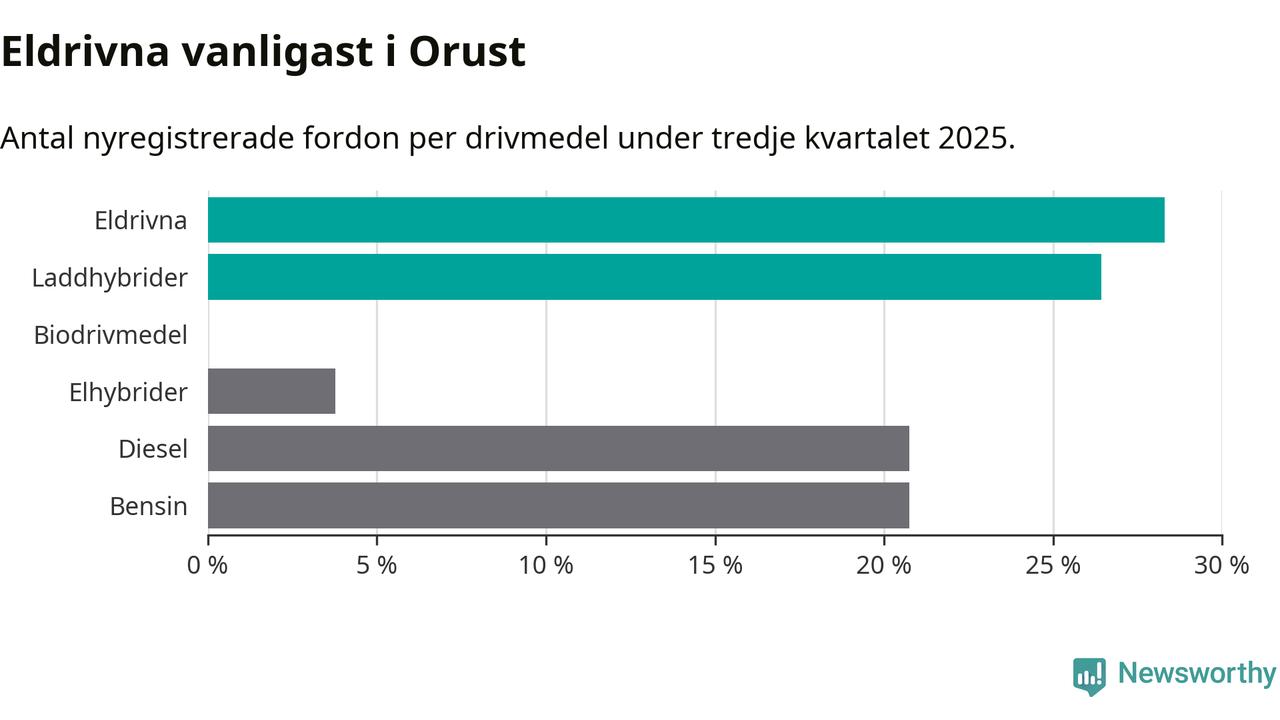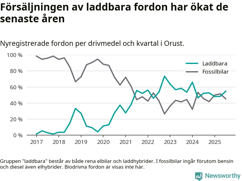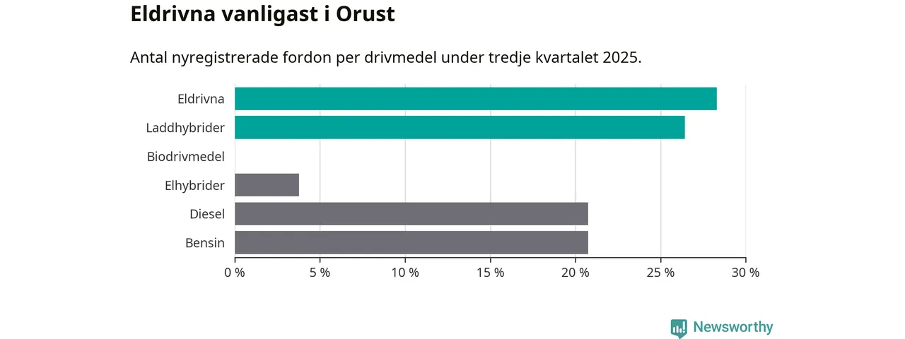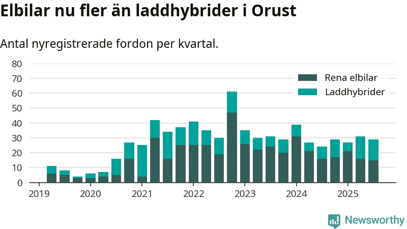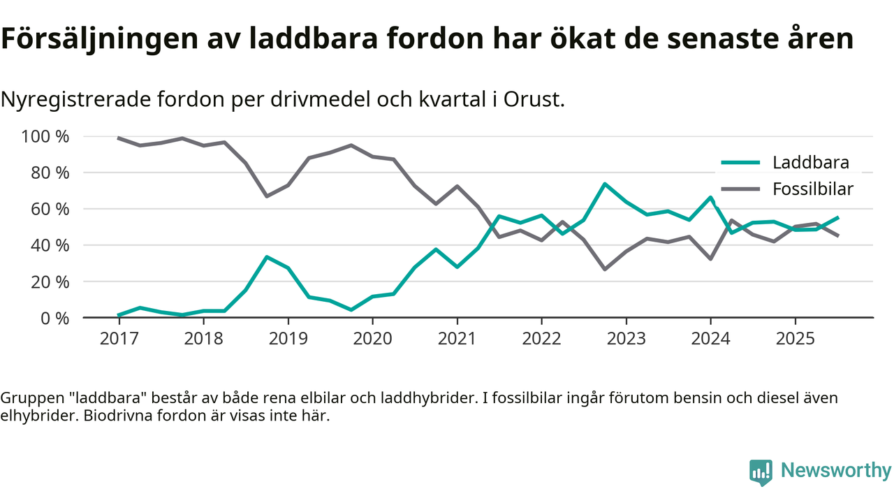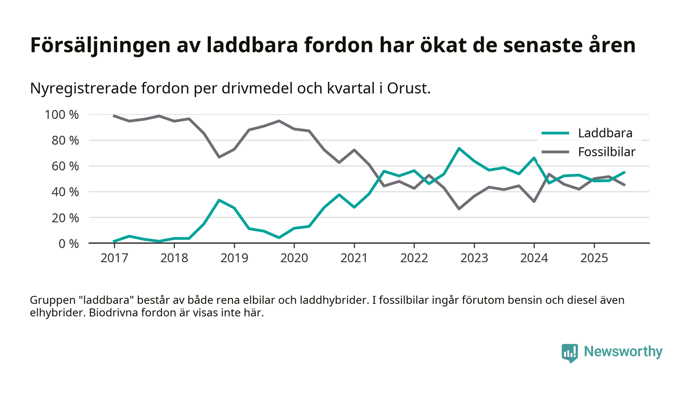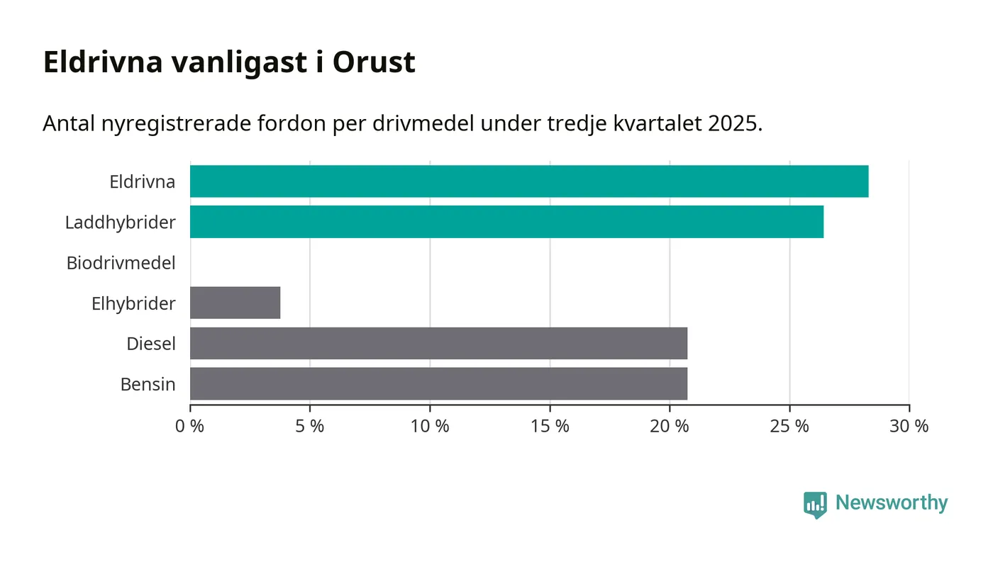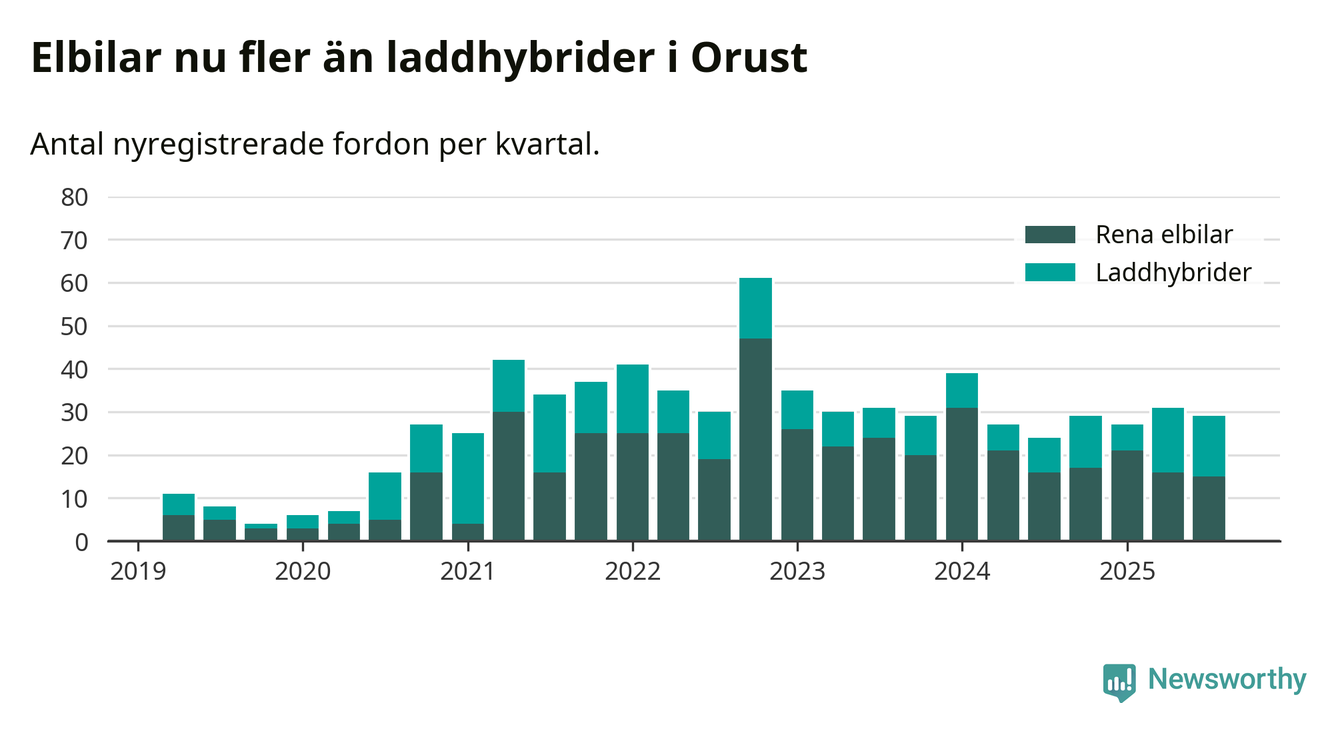 Under tredje kvartalet 2025 var 55 procent av alla nyregistrerade personbilar på Orust laddbara (sammanlagt registrerades 53 nya bilar). Merparten av de laddbara bilarna var rena elbilar (28 procent av alla).
