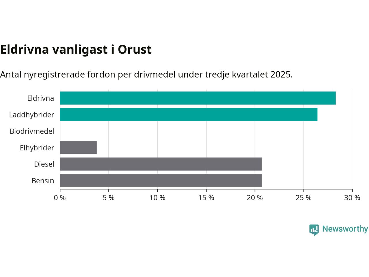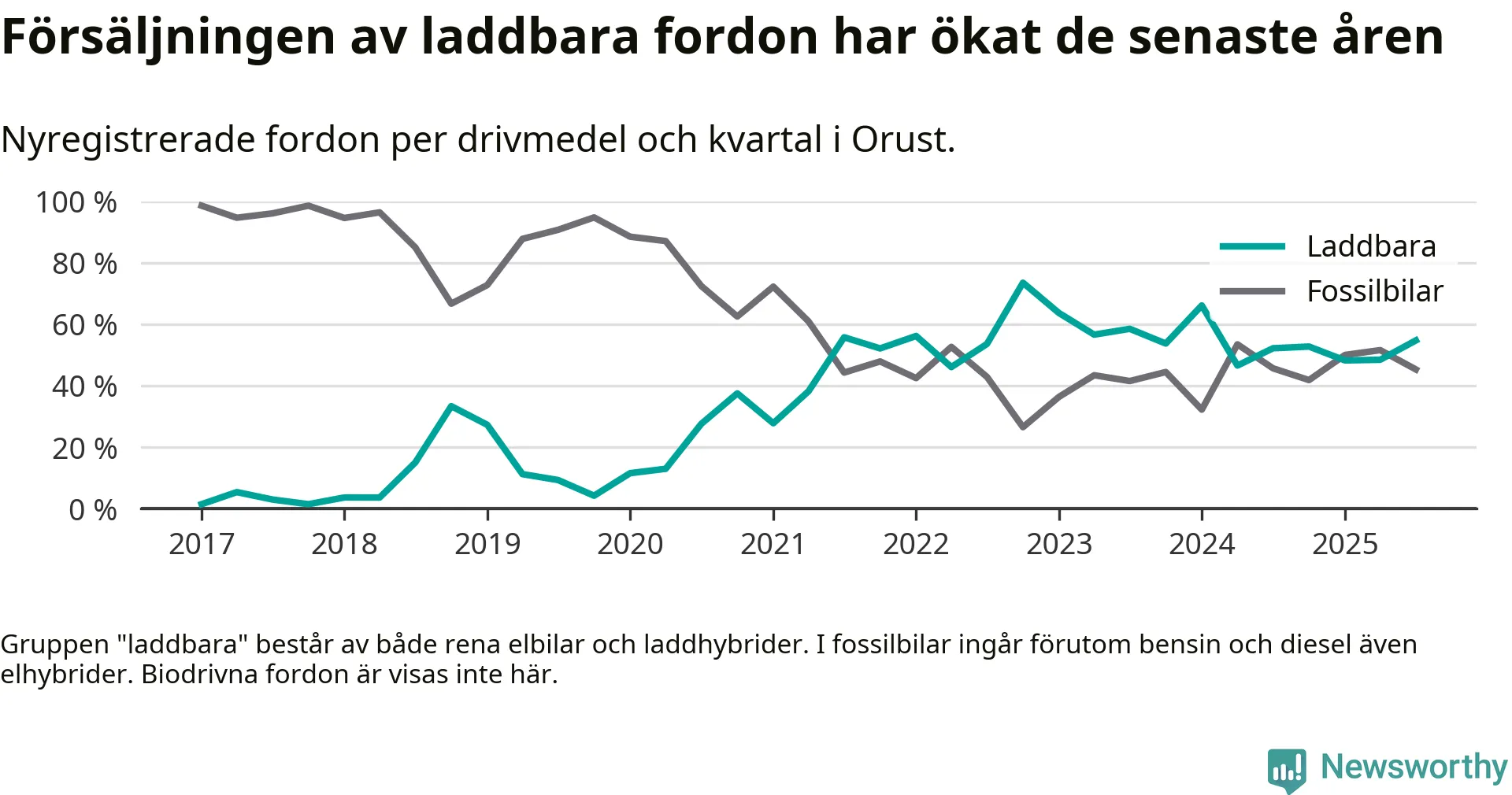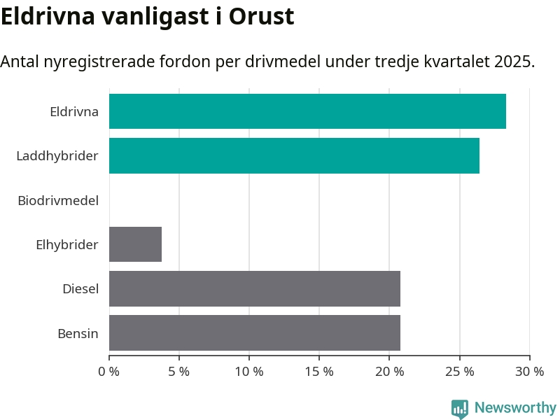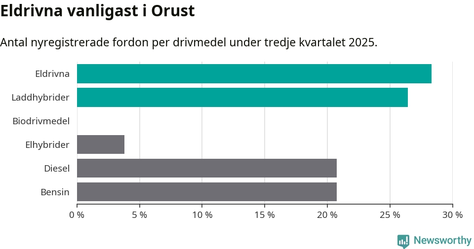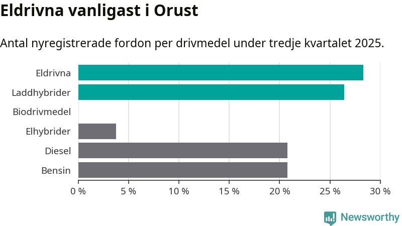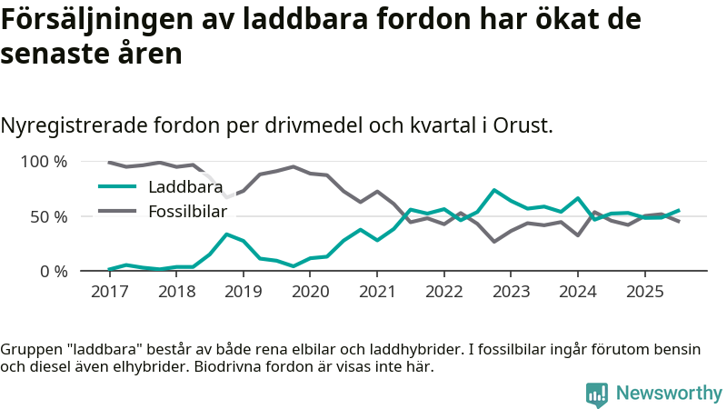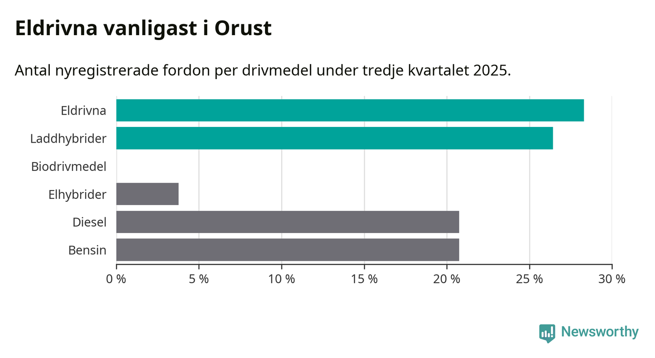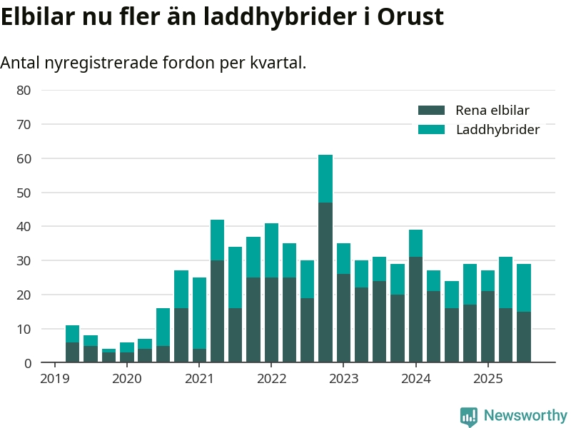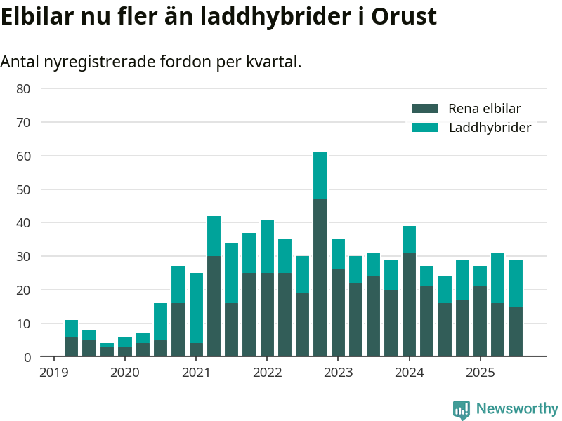Under tredje kvartalet 2025 var 55 procent av alla nyregistrerade personbilar på Orust laddbara (sammanlagt registrerades 53 nya bilar). Merparten av de laddbara bilarna var rena elbilar (28 procent av alla).