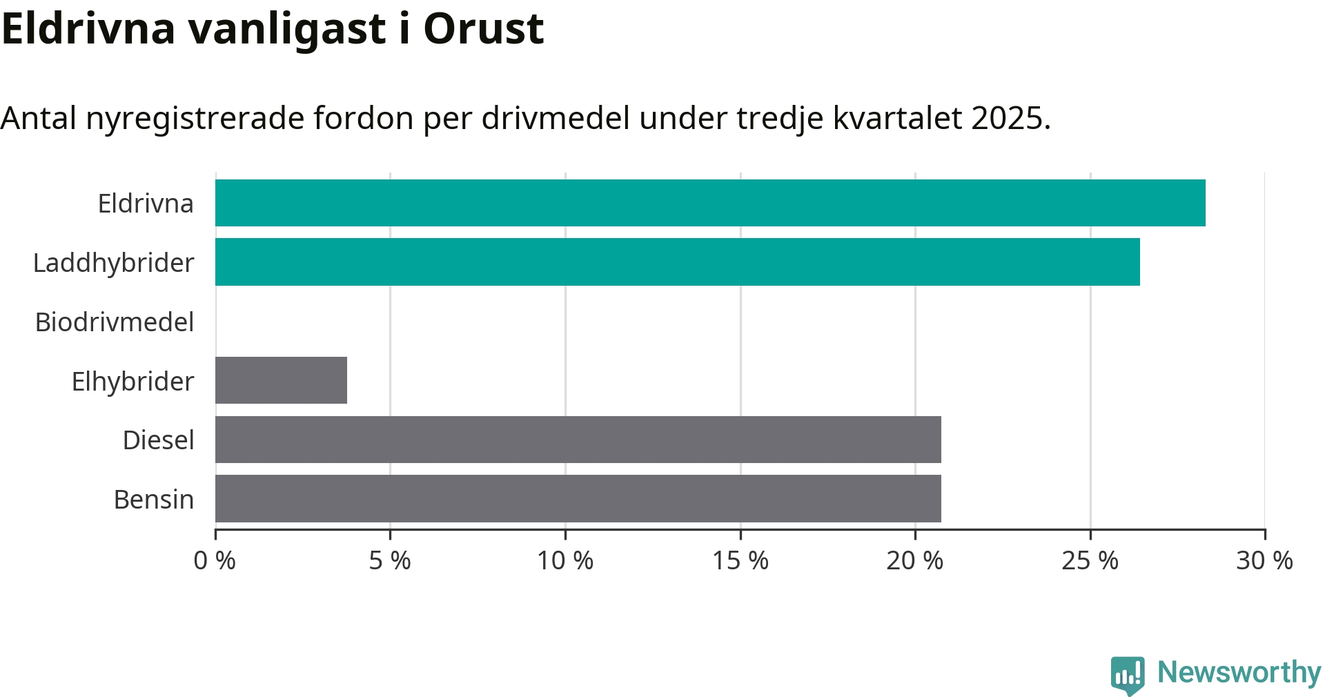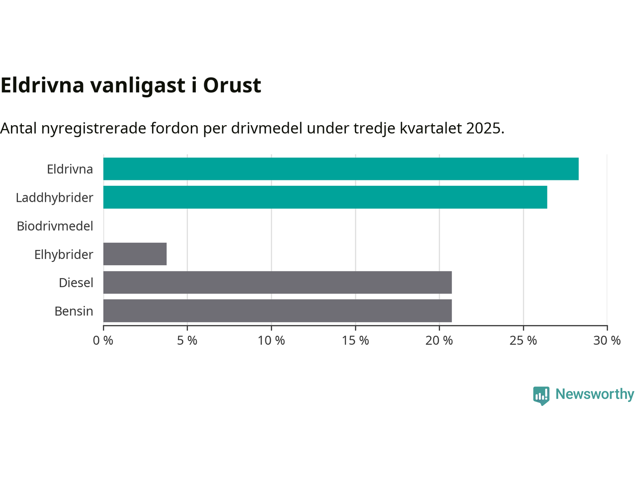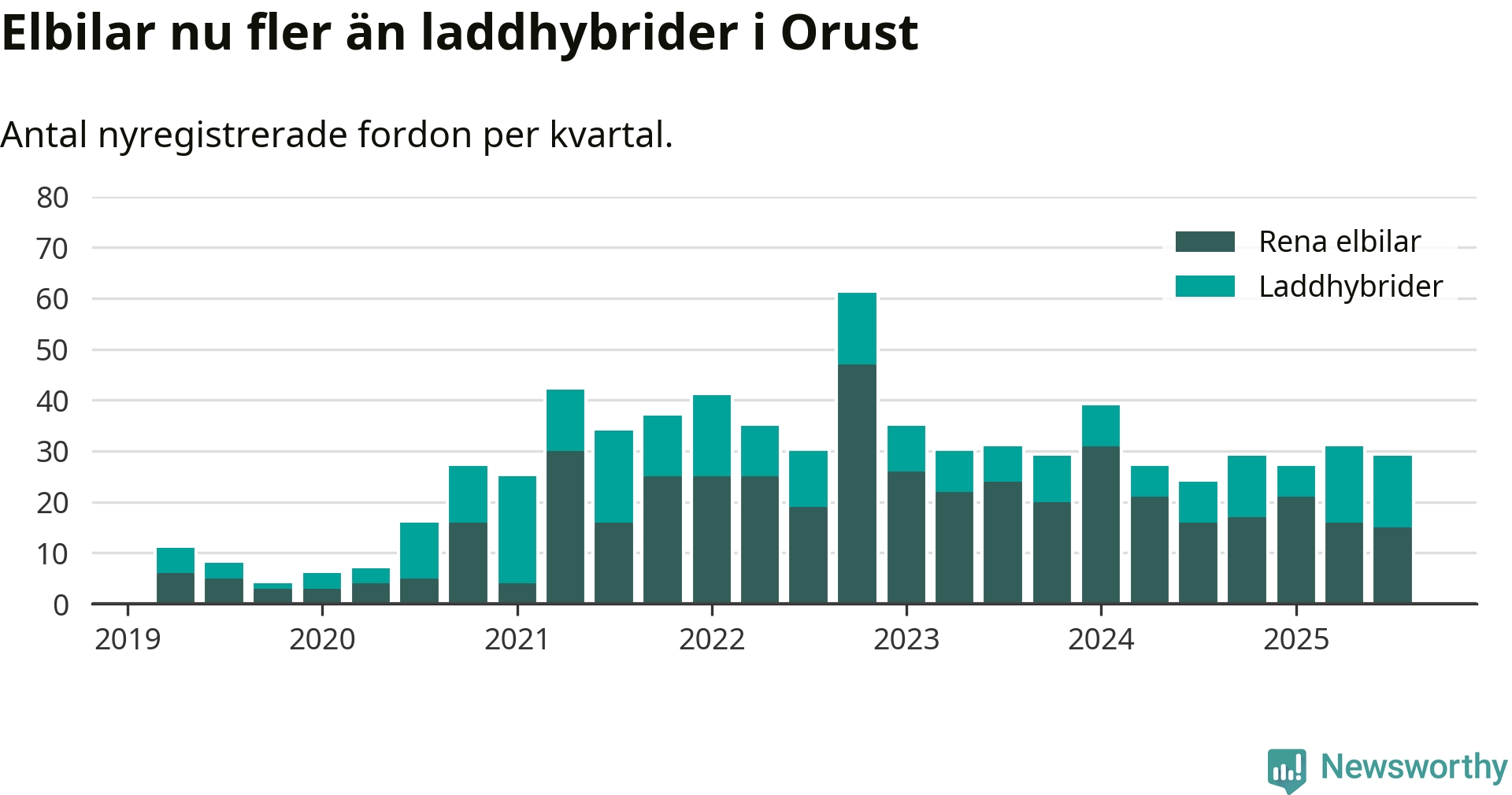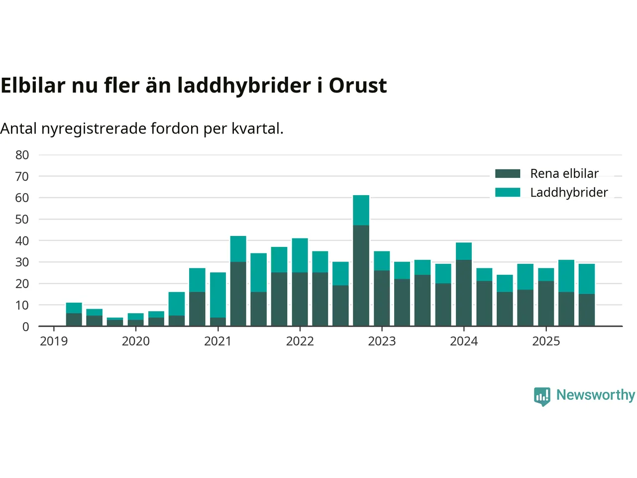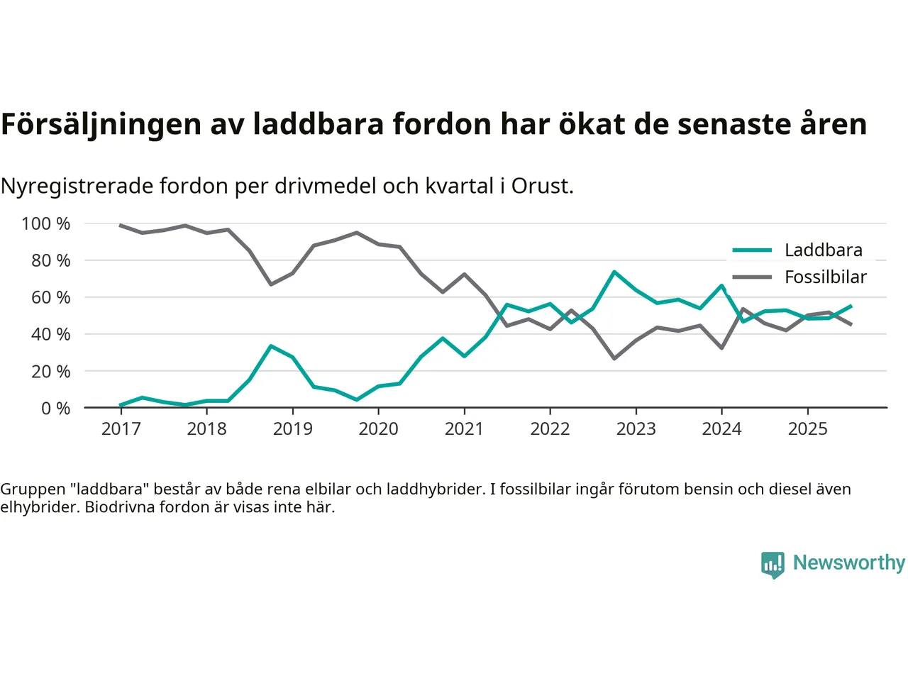 Under tredje kvartalet 2025 var 55 procent av alla nyregistrerade personbilar på Orust laddbara (sammanlagt registrerades 53 nya bilar). Merparten av de laddbara bilarna var rena elbilar (28 procent av alla).