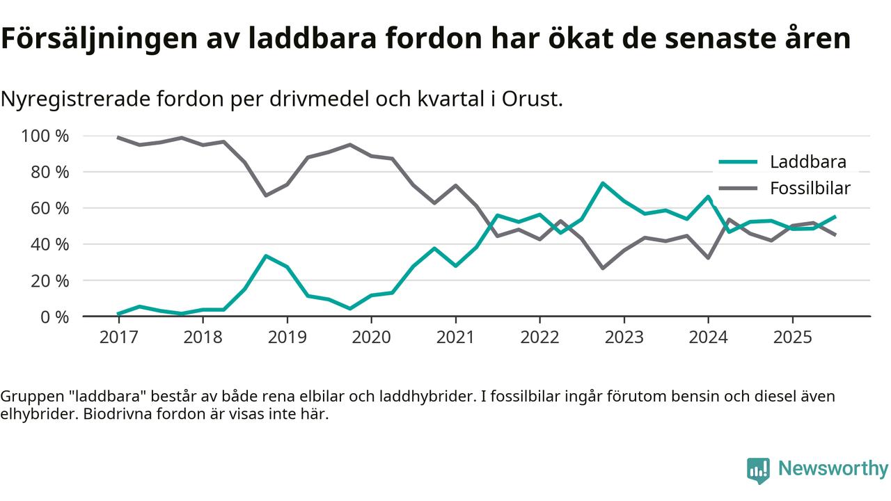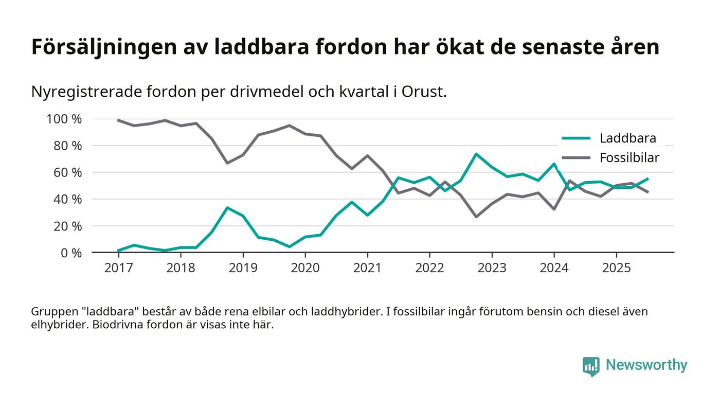 Under tredje kvartalet var hälften av alla nyregistrerade bilar i Orusts kommun rena elbilar eller laddhybrider, en ökning jämfört med kvartalet innan. I riket däremot minskade andelen laddbara bilar något. Framför allt elbilsförsäljningen har tappat fart.