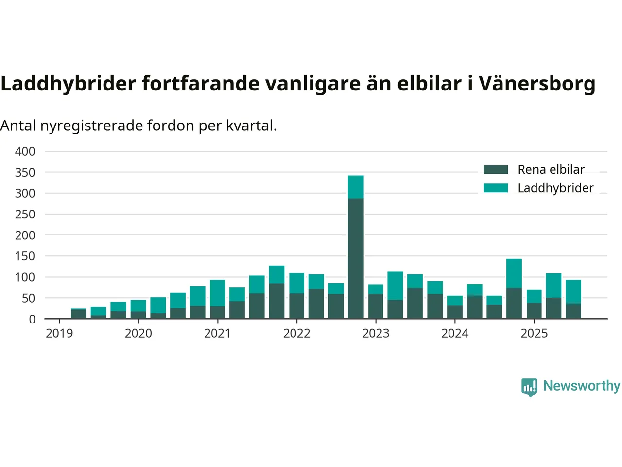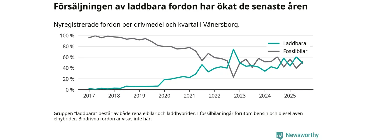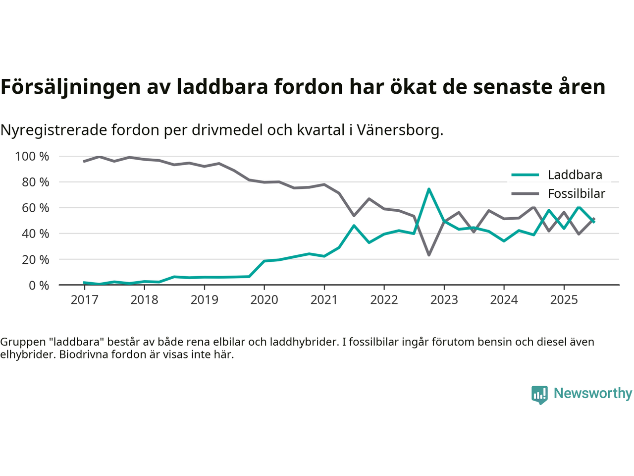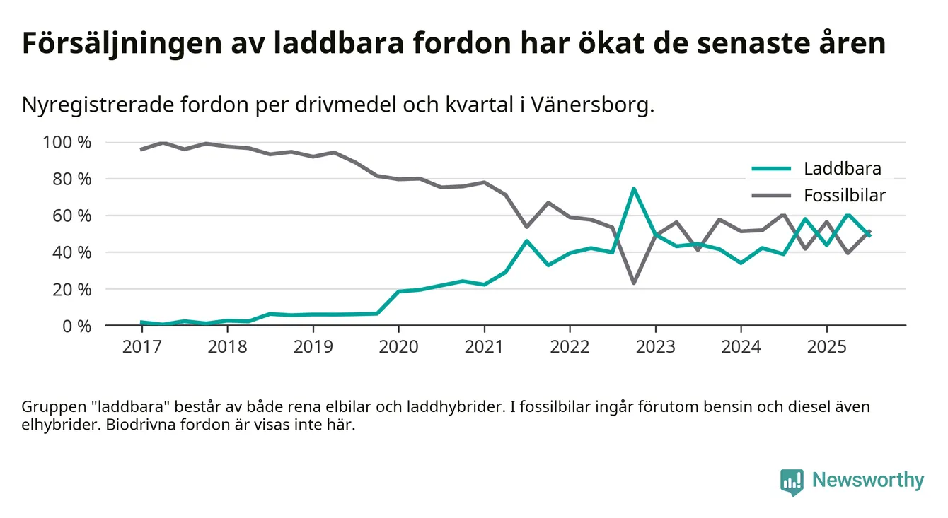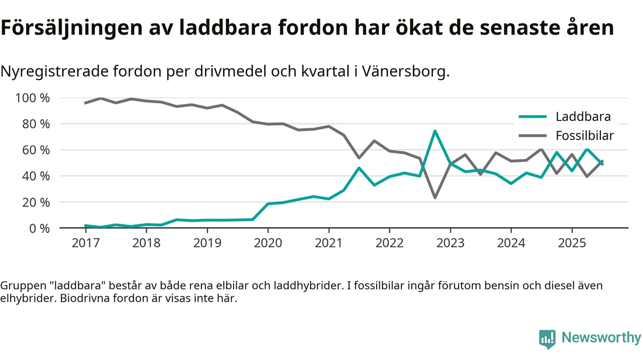 Under tredje kvartalet 2025 var 49 procent av alla nyregistrerade personbilar i Vänersborg laddbara (sammanlagt registrerades 190 nya bilar). Merparten av de laddbara bilarna var så kallade laddhybrider, det vill säga fordon som går att ladda och köra på el, men som även har en förbränningsmotor. 19 procent av alla nya bilar var rena elbilar.