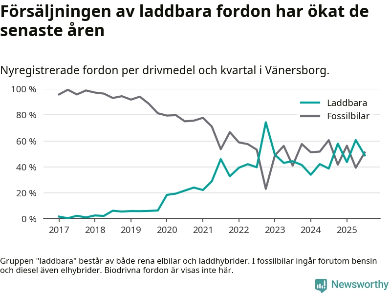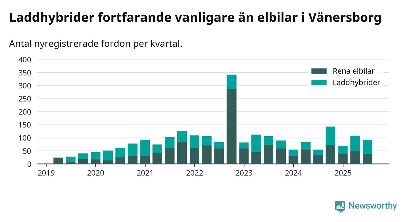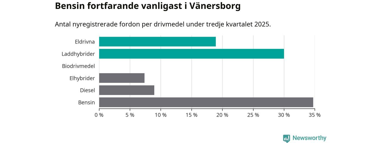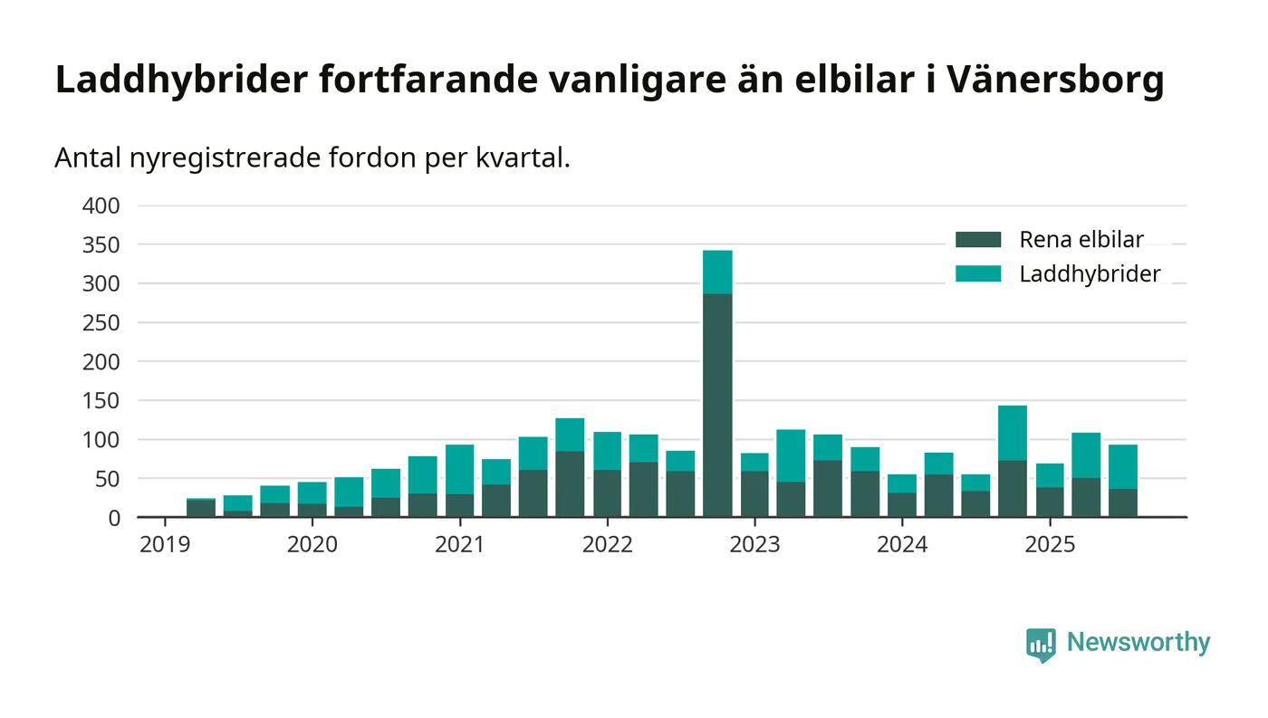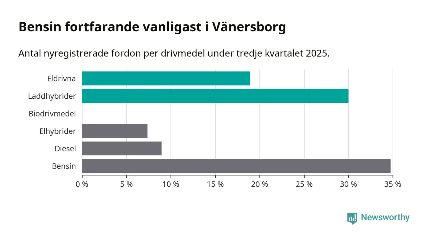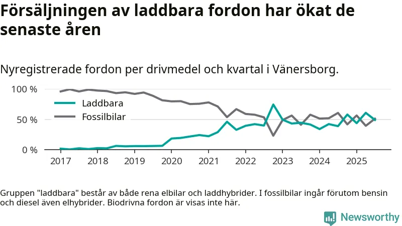 Under tredje kvartalet 2025 var 49 procent av alla nyregistrerade personbilar i Vänersborg laddbara (sammanlagt registrerades 190 nya bilar). Merparten av de laddbara bilarna var så kallade laddhybrider, det vill säga fordon som går att ladda och köra på el, men som även har en förbränningsmotor. 19 procent av alla nya bilar var rena elbilar.