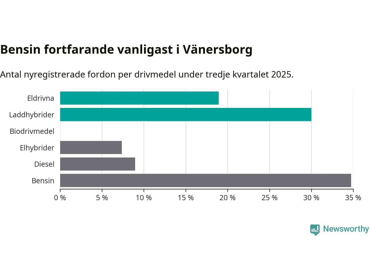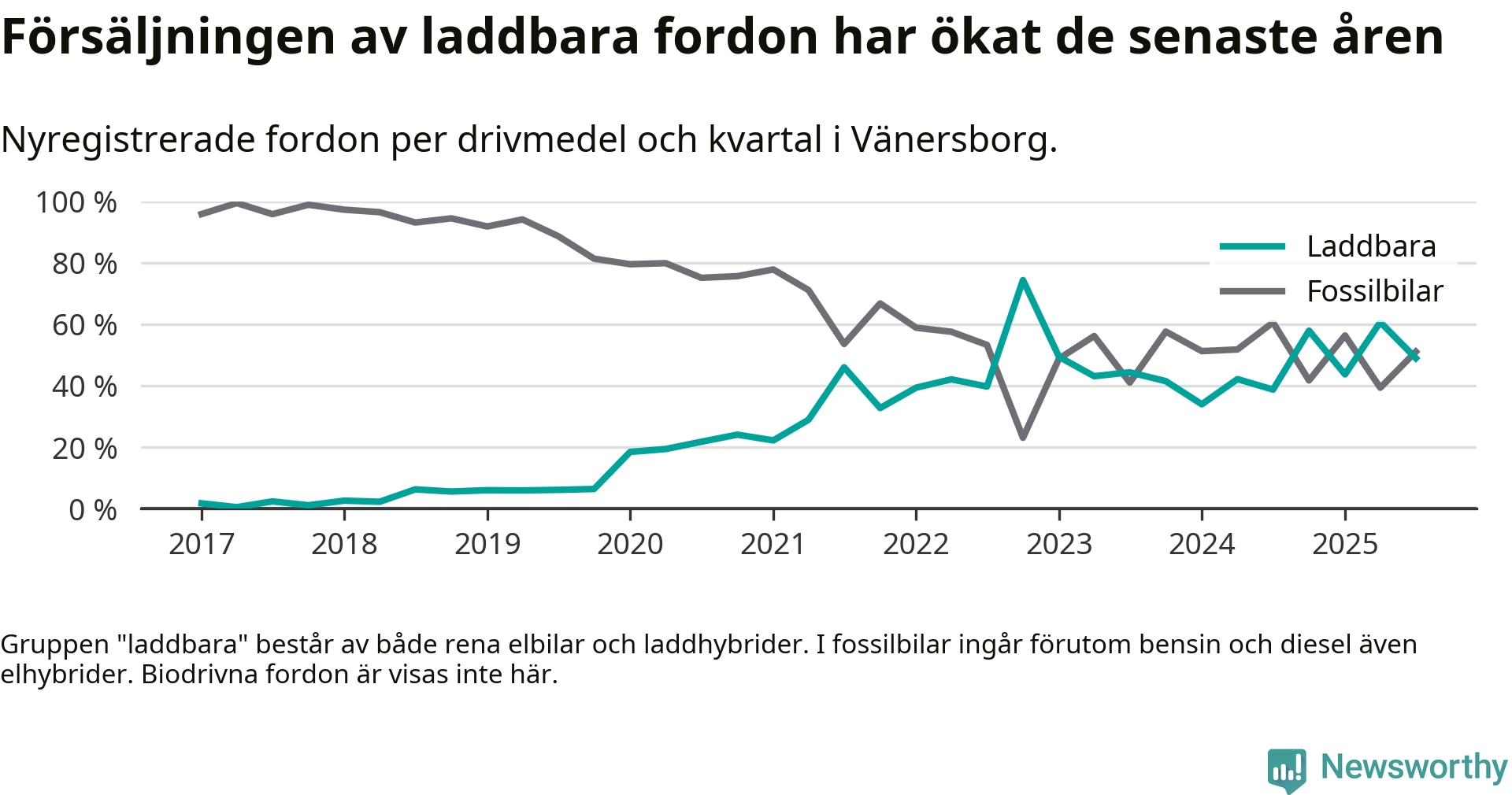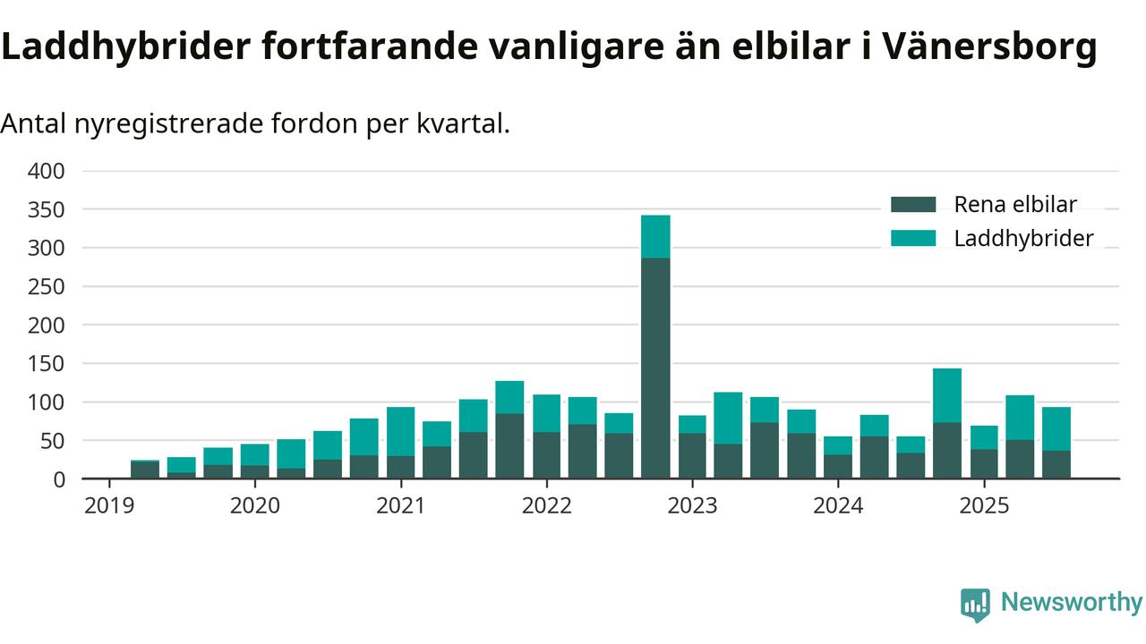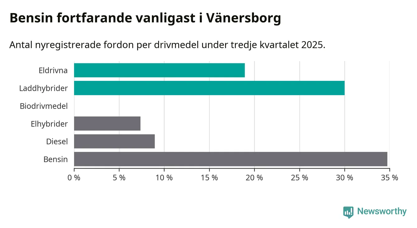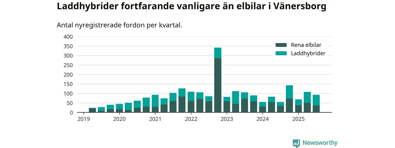 Under tredje kvartalet 2025 var 49 procent av alla nyregistrerade personbilar i Vänersborg laddbara (sammanlagt registrerades 190 nya bilar). Merparten av de laddbara bilarna var så kallade laddhybrider, det vill säga fordon som går att ladda och köra på el, men som även har en förbränningsmotor. 19 procent av alla nya bilar var rena elbilar.