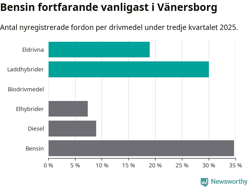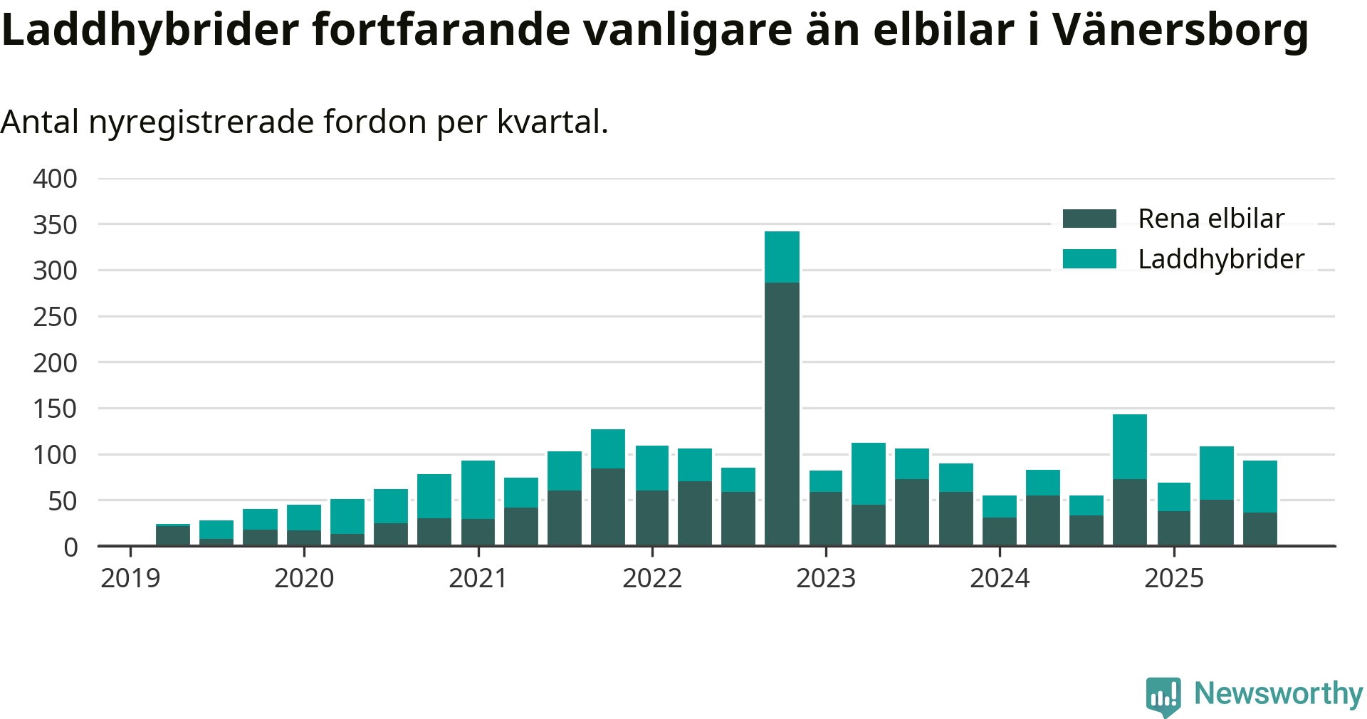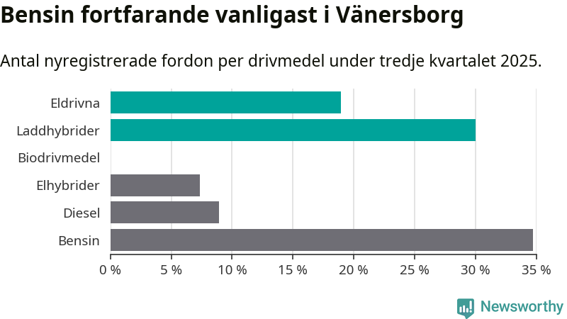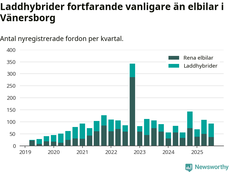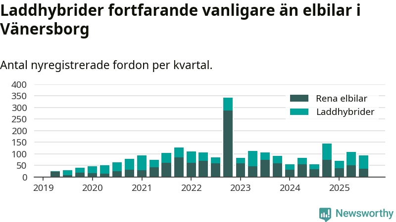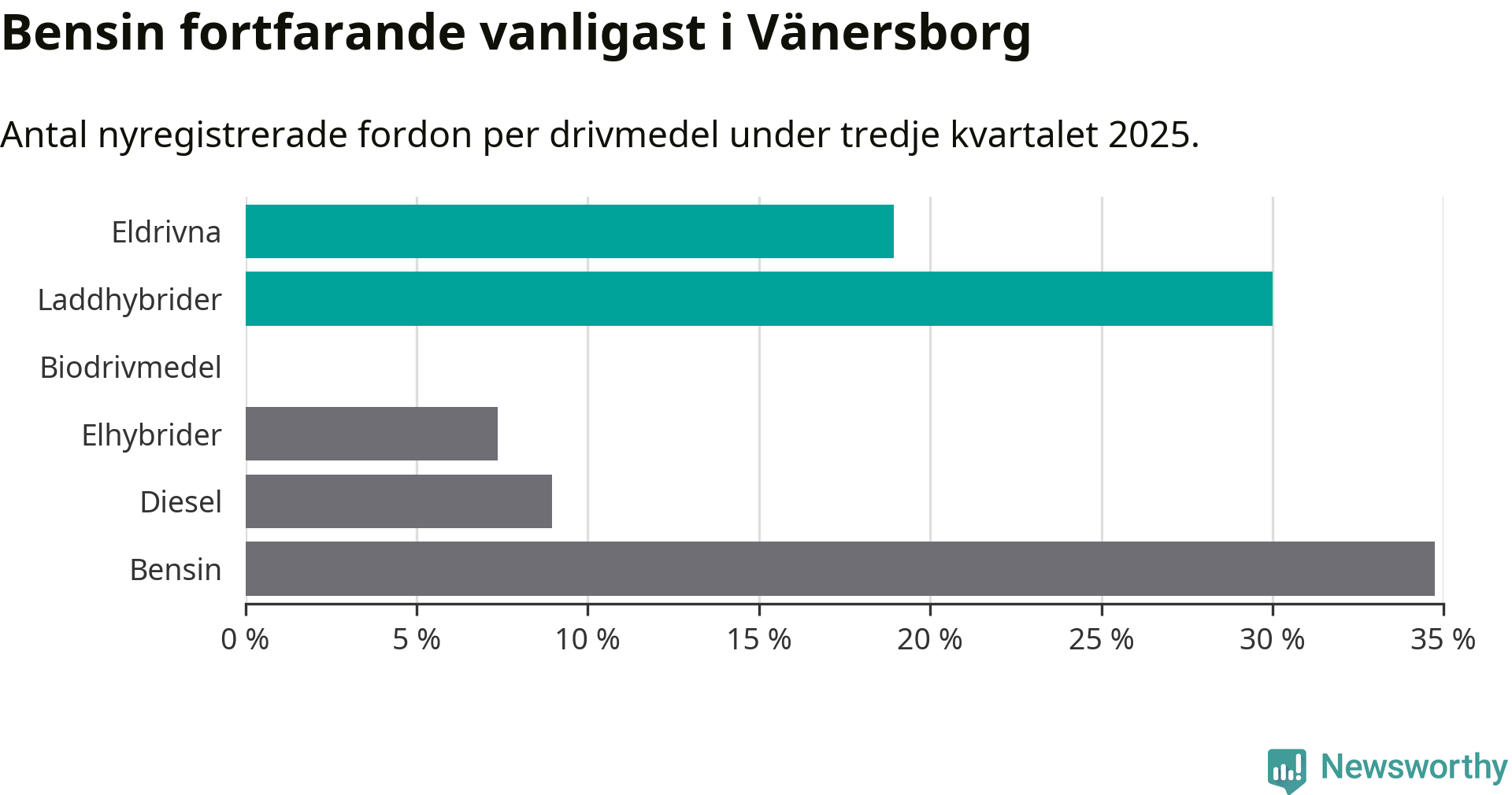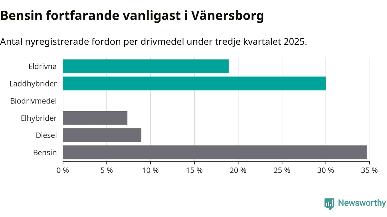 Under tredje kvartalet 2025 var 49 procent av alla nyregistrerade personbilar i Vänersborg laddbara (sammanlagt registrerades 190 nya bilar). Merparten av de laddbara bilarna var så kallade laddhybrider, det vill säga fordon som går att ladda och köra på el, men som även har en förbränningsmotor. 19 procent av alla nya bilar var rena elbilar.