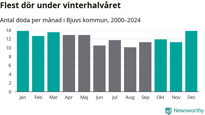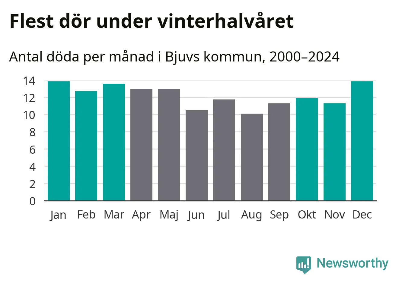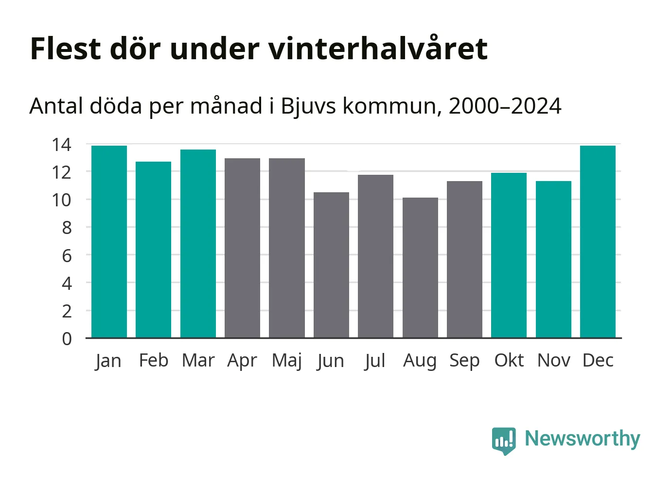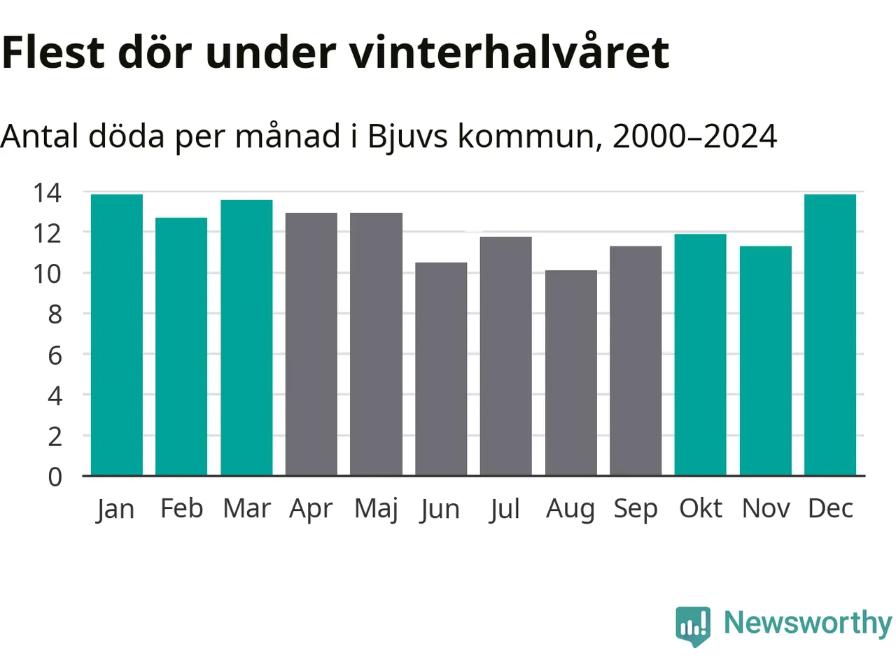 Så är det även i Bjuv. Under de senaste 25 åren har 1 905 personer dött i kommunen under vinterhalvåret, jämfört med 1 671 personer under sommarhalvåret – alltså 14 procent fler.
