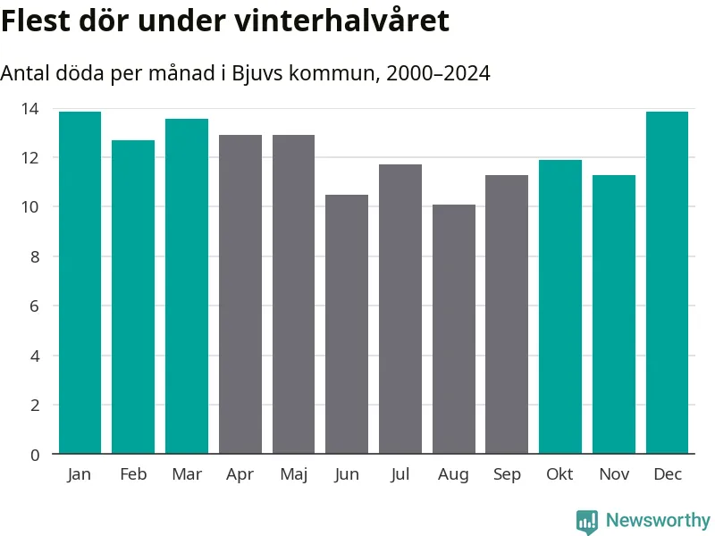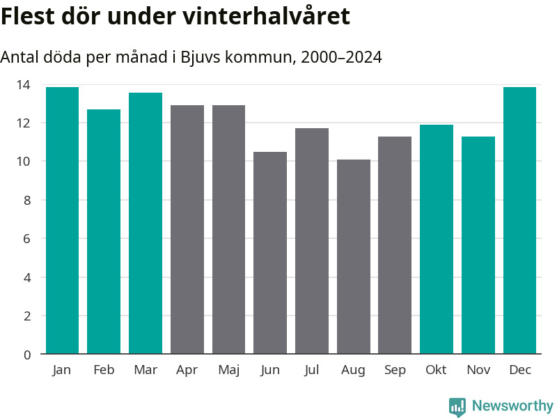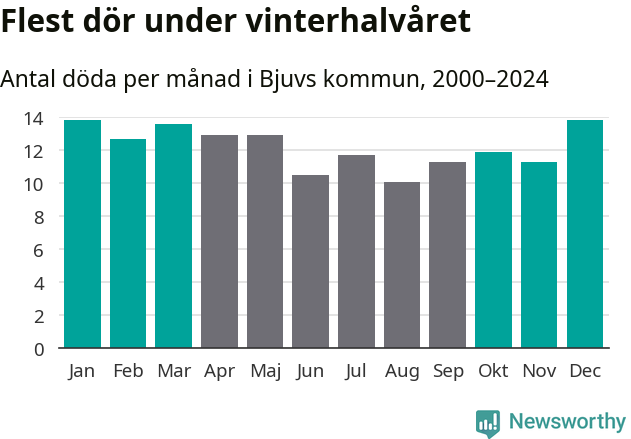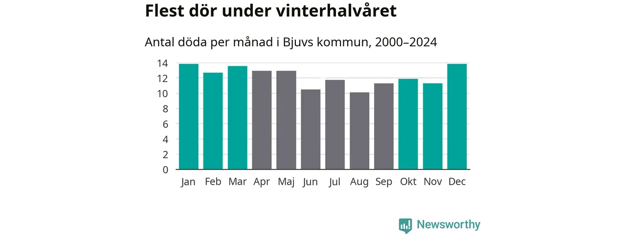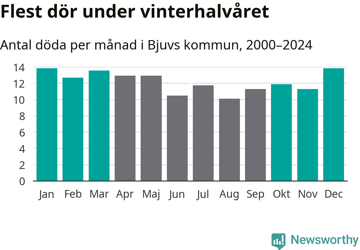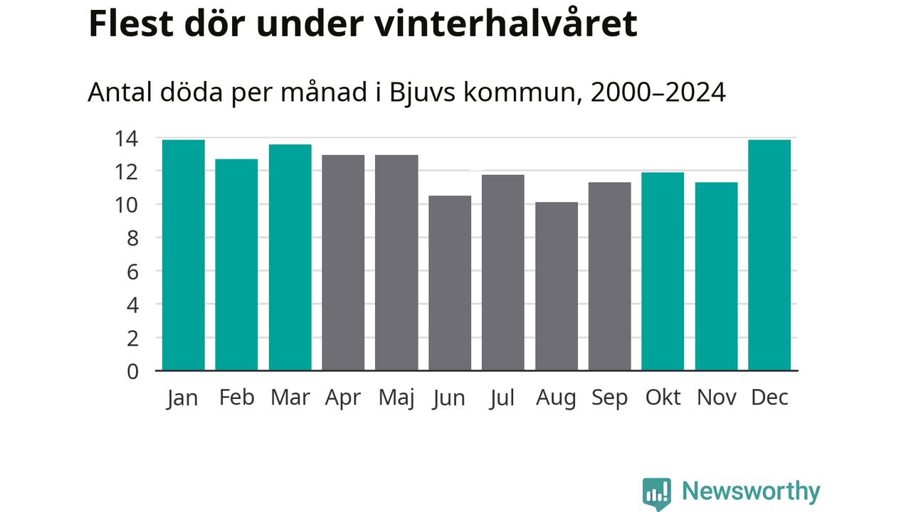 Så är det även i Bjuv. Under de senaste 25 åren har 1 905 personer dött i kommunen under vinterhalvåret, jämfört med 1 671 personer under sommarhalvåret – alltså 14 procent fler.