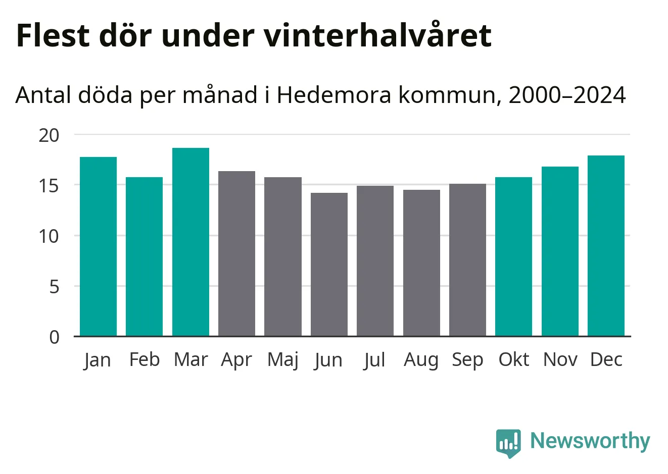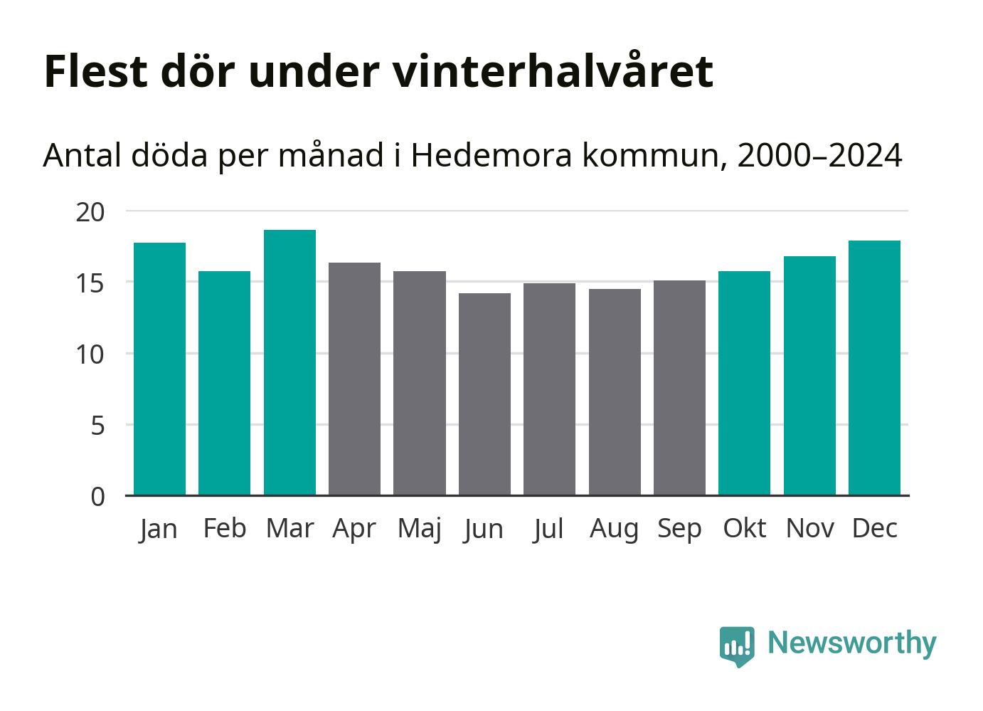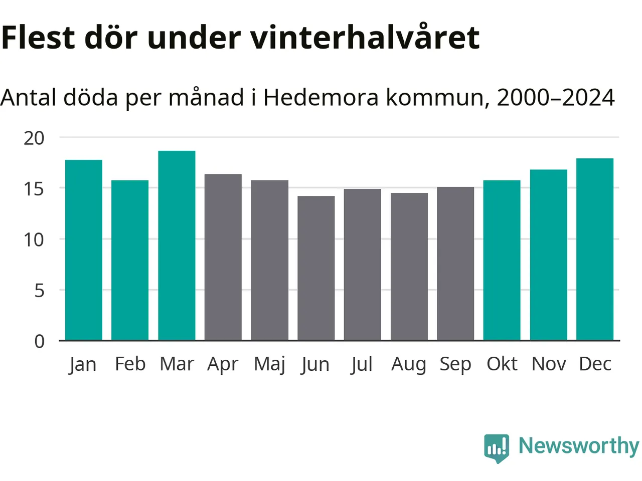Så är det även i Hedemora. Under de senaste 25 åren har 2 526 personer dött i kommunen under vinterhalvåret, jämfört med 2 237 personer under sommarhalvåret – alltså 13 procent fler.