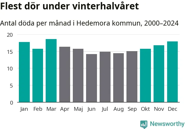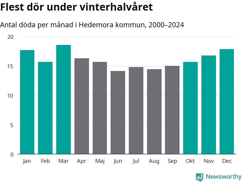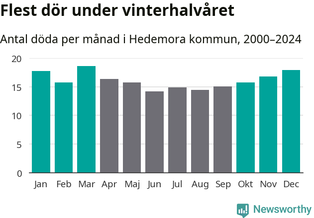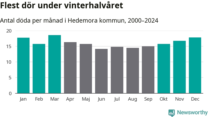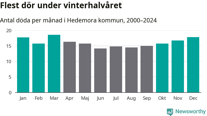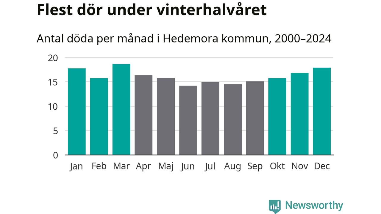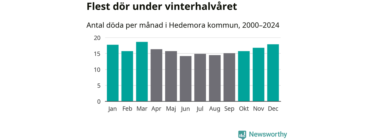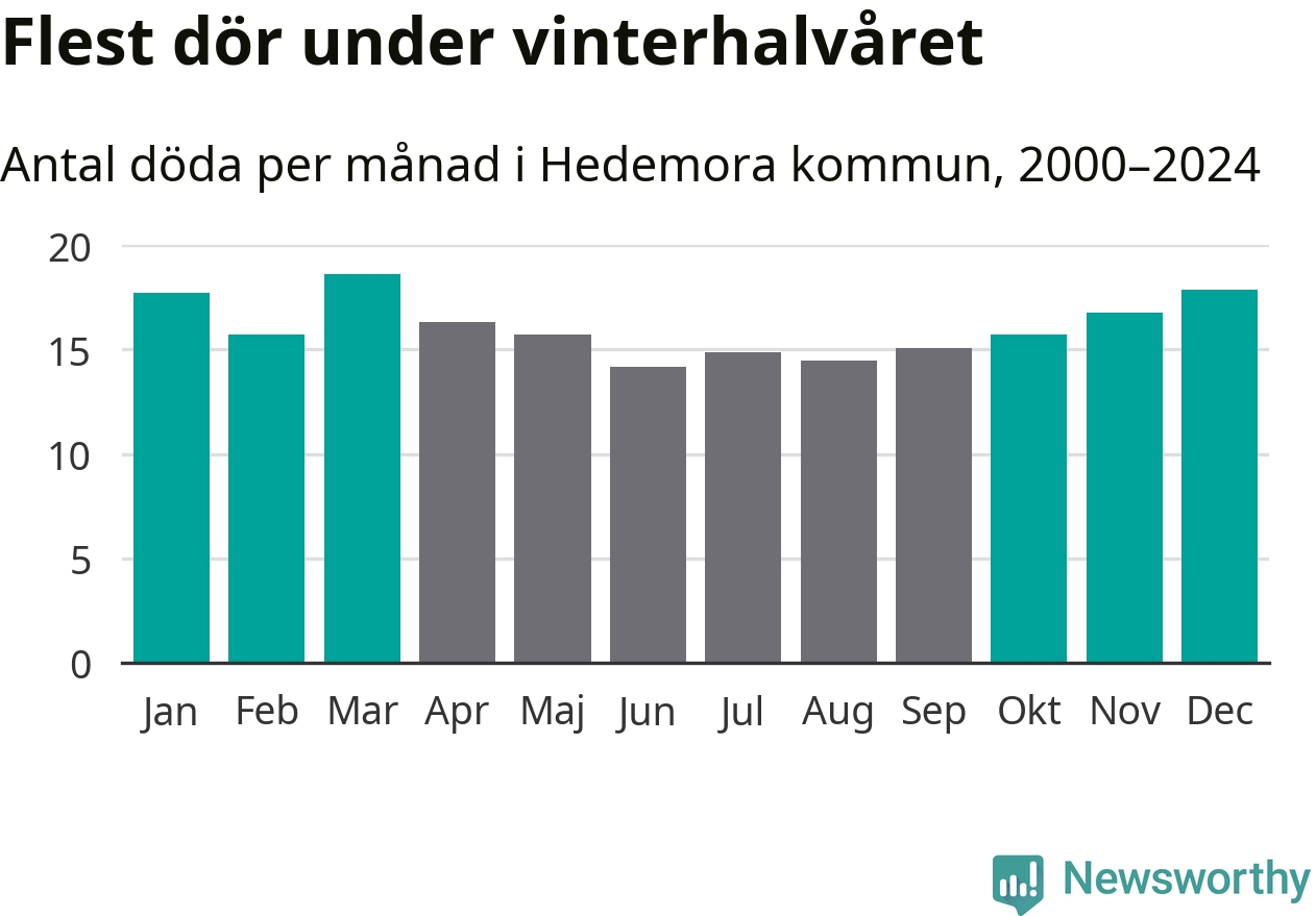 Så är det även i Hedemora. Under de senaste 25 åren har 2 526 personer dött i kommunen under vinterhalvåret, jämfört med 2 237 personer under sommarhalvåret – alltså 13 procent fler.