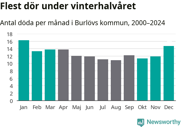 Så är det även i Burlöv. Under de senaste 25 åren har 2 030 personer dött i kommunen under vinterhalvåret, jämfört med 1 685 personer under sommarhalvåret – alltså 20 procent fler.