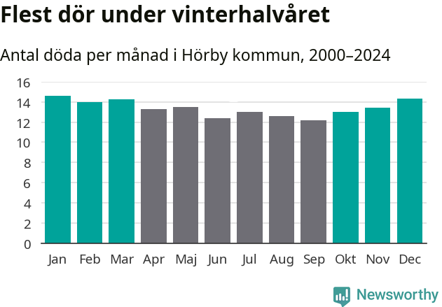 Så är det även i Hörby. Under de senaste 25 åren har 2 047 personer dött i kommunen under vinterhalvåret, jämfört med 1 869 personer under sommarhalvåret – alltså tio procent fler.