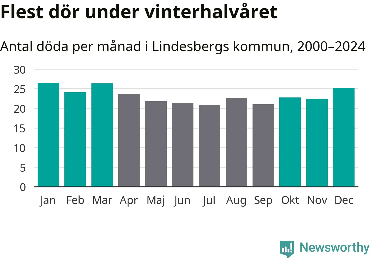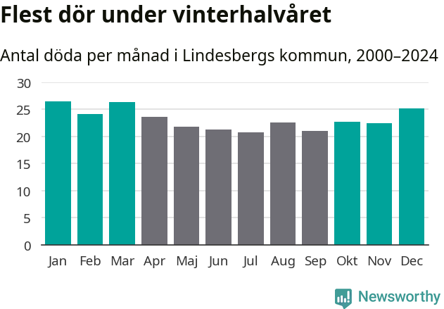 Så är det även i Lindesberg. Under de senaste 25 åren har 3 642 personer dött i kommunen under vinterhalvåret, jämfört med 3 228 personer under sommarhalvåret – alltså 13 procent fler.