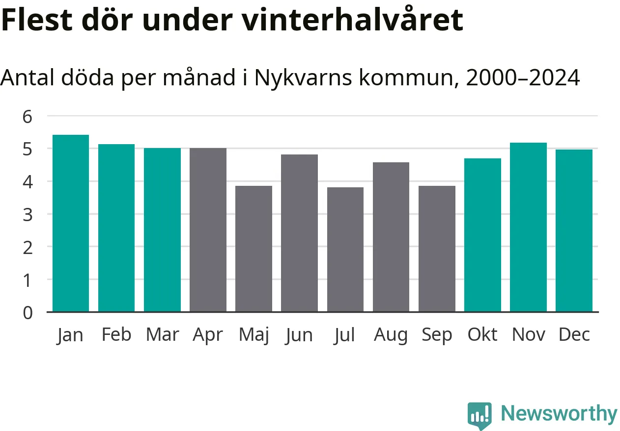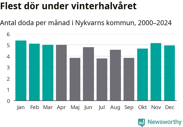 I landet som helhet är det veckorna kring årsskiftet som är de allra dödligaste. I Nykvarn har flest istället dött vecka 5. Sammanlagt under de senaste 25 åren handlar det om 40 personer, vilket är 49 procent fler än snittet för resten av året.