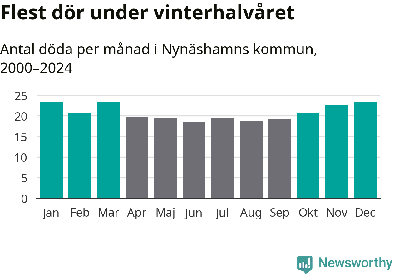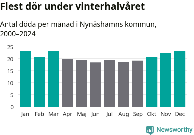 Så är det även i Nynäshamn. Under de senaste 25 åren har 3 273 personer dött i kommunen under vinterhalvåret, jämfört med 2 899 personer under sommarhalvåret – alltså 13 procent fler.