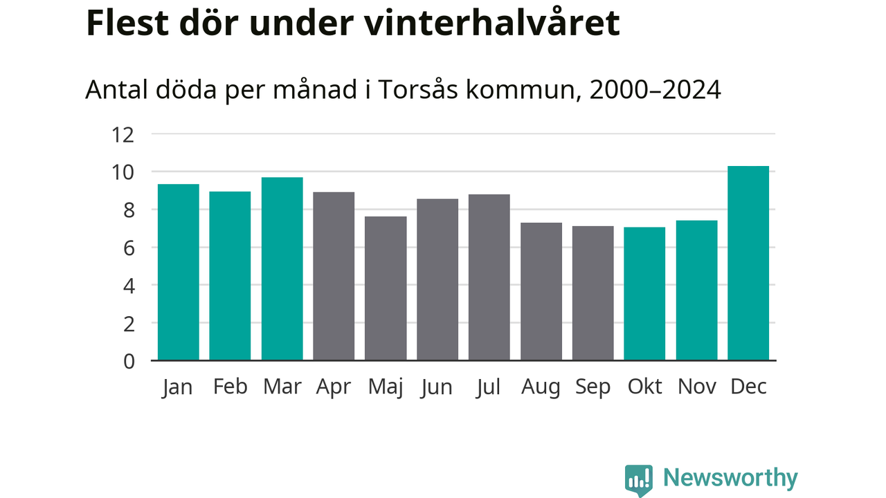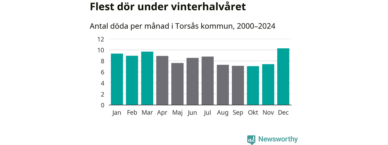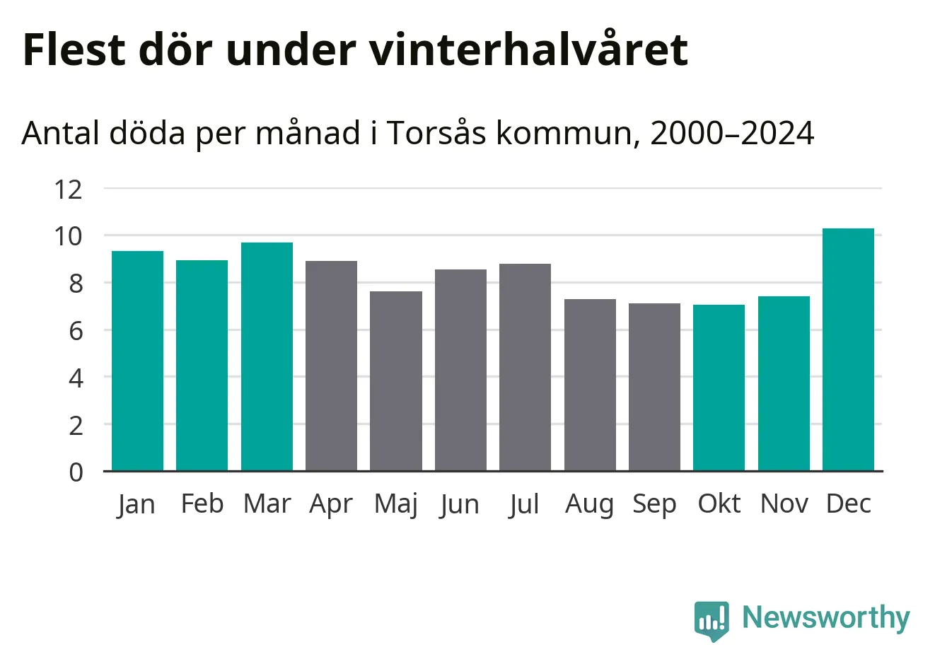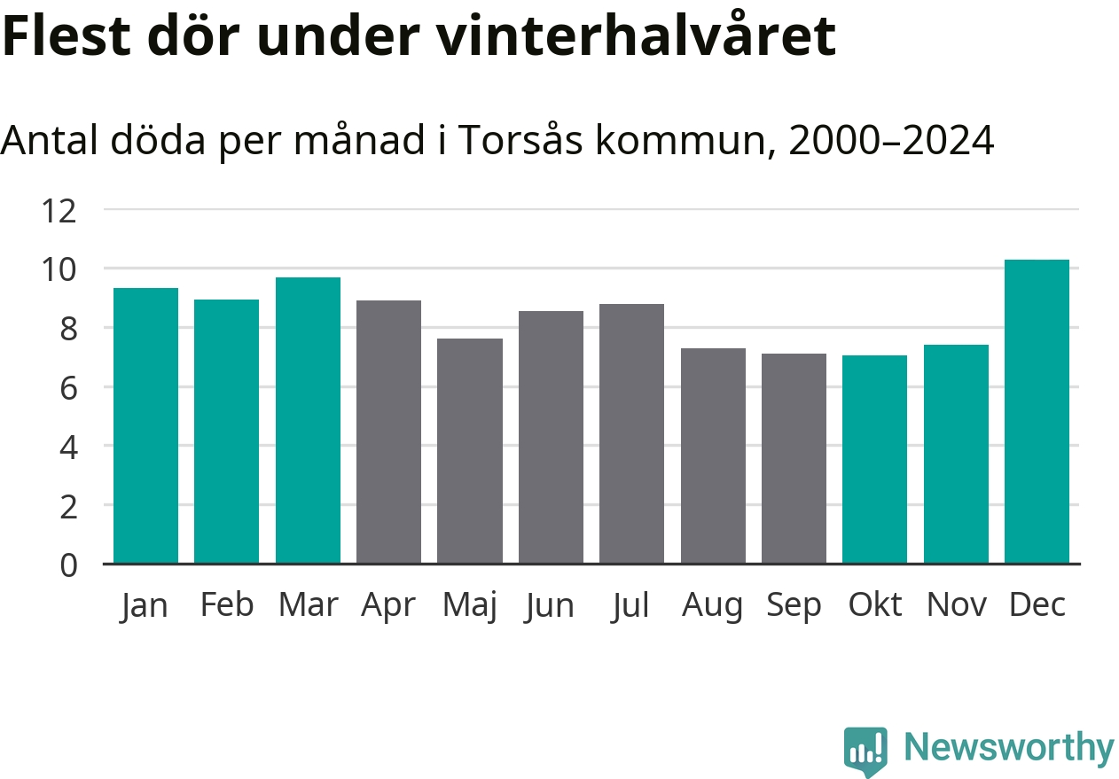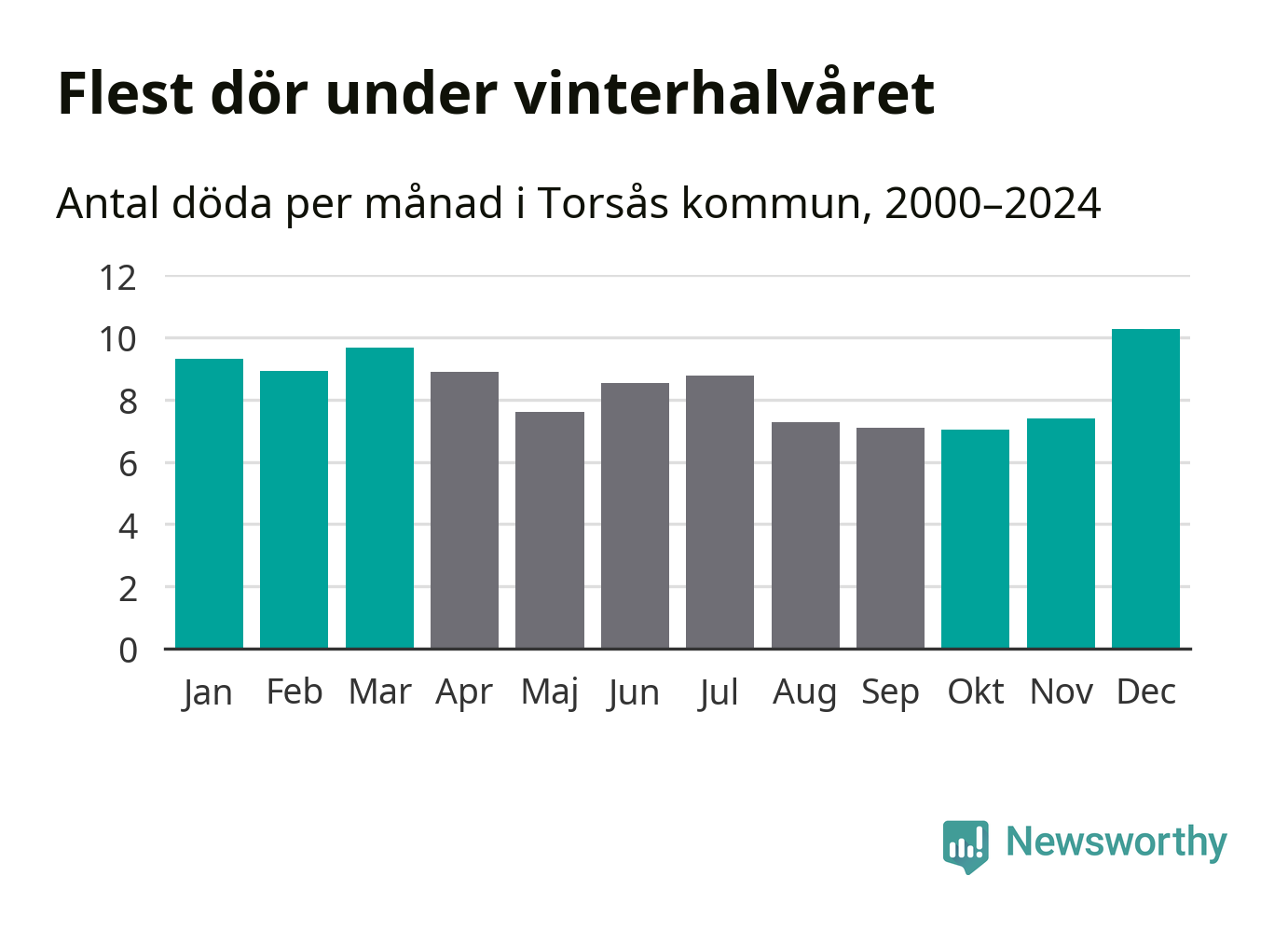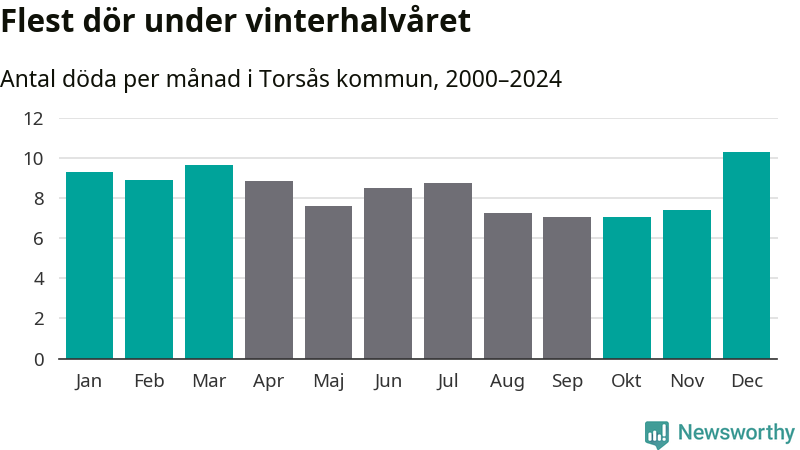 Så är det även i Torsås. Under de senaste 25 åren har 1 352 personer dött i kommunen under vinterhalvåret, jämfört med 1 140 personer under sommarhalvåret – alltså 19 procent fler.