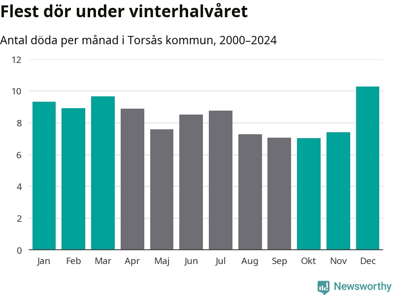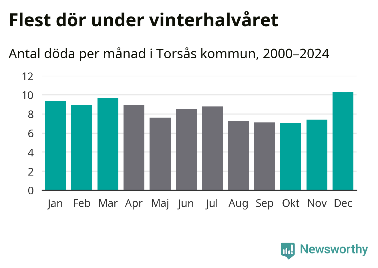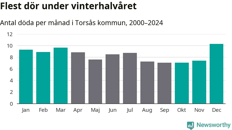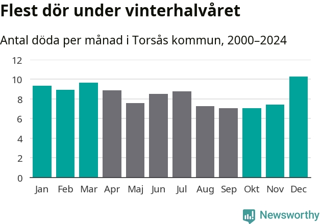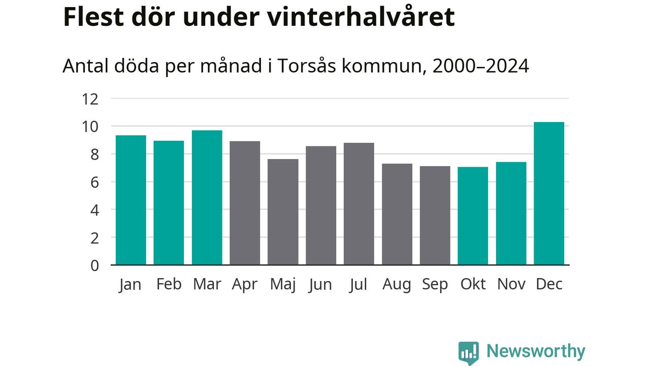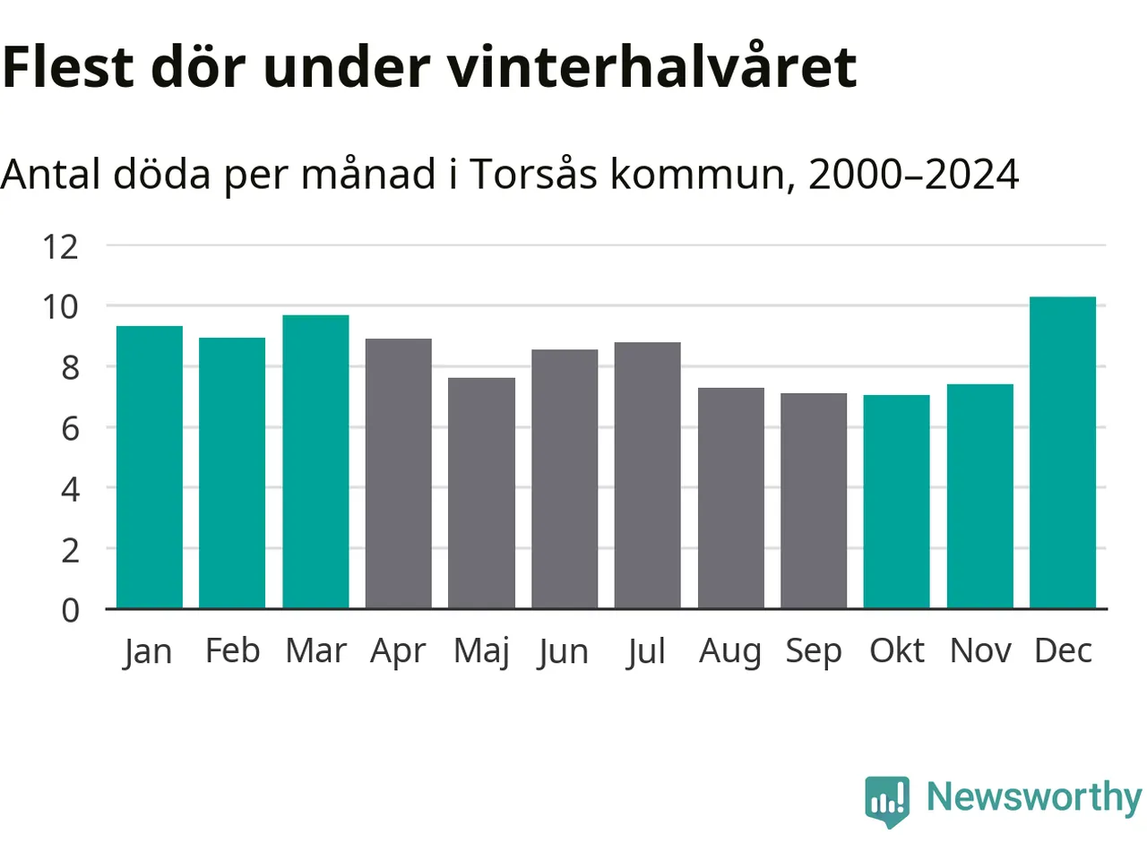 I landet som helhet är det veckorna kring årsskiftet som är de allra dödligaste. I Torsås har flest istället dött vecka 51. Sammanlagt under de senaste 25 åren handlar det om 67 personer, vilket är 40 procent fler än snittet för resten av året.